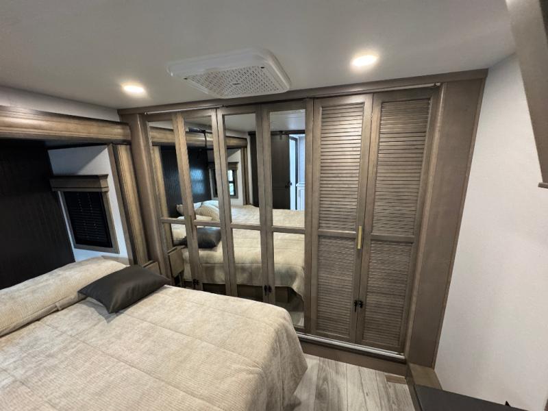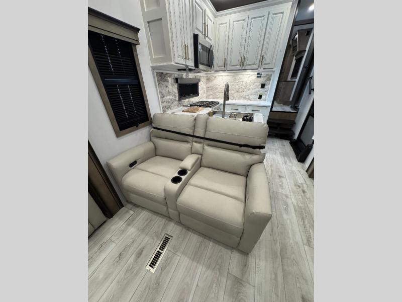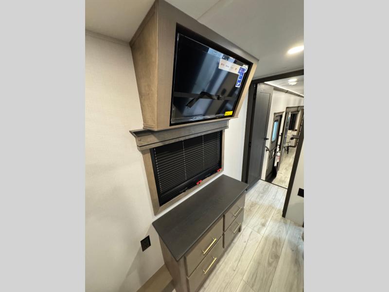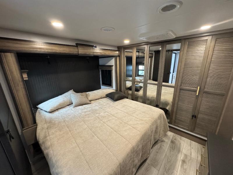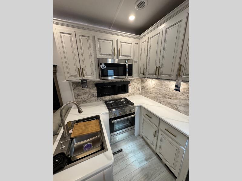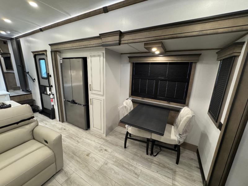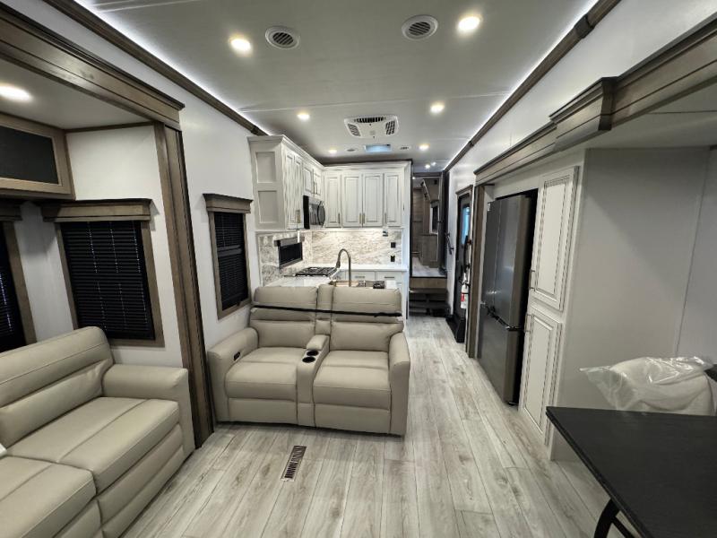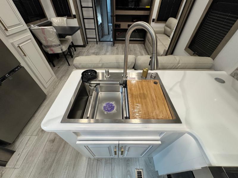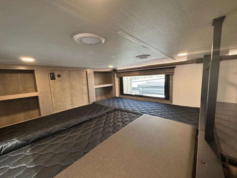 Traveling with friends and family is easier than ever with this fifth wheel in tow! There are two master suites; one for you and one for guests! The front master suite includes a king bed slide out, a front closet with a hamper, plus stackable washer/dryer prep if you want the option to make wash day easier. There is also convenient underbed storage, a dresser with a Smart HD TV, plus a private entrance into the dual entry bath. Head to the rear master suite to find just as much comfort with a queen bed slide out, dual closets and a dresser, plus a full rear bath where the second entry door is located. There is also a loft area above this room with three bunk mats for more campers! The middle kitchen and living area includes many comforts, like the power theater seating across from the 50" Smart TV and hide-a-bed sofa, plus the U-shaped kitchen with ample counter space and a 24" range. You'll also find food storage in the pantry and 18 cu. ft. residential refrigerator with an ice maker, or you can choose the slightly larger optional 20 cu. ft. refrigerator!