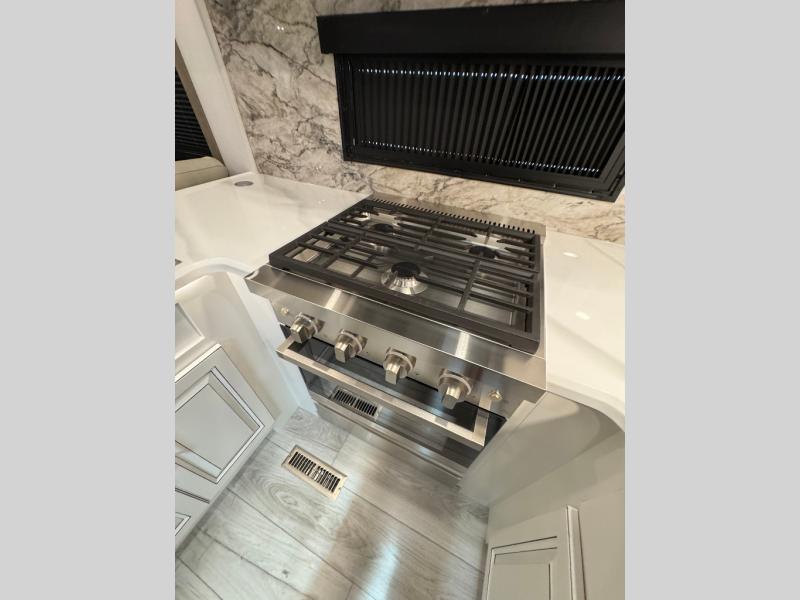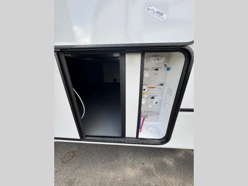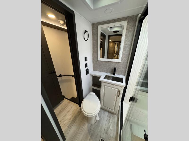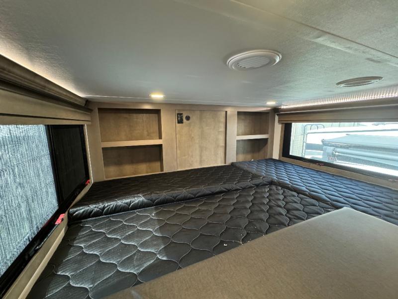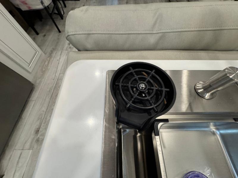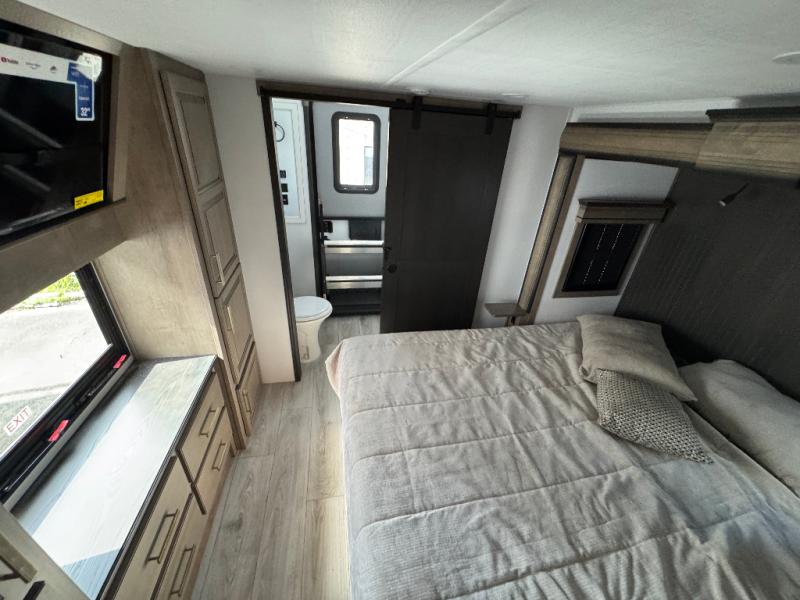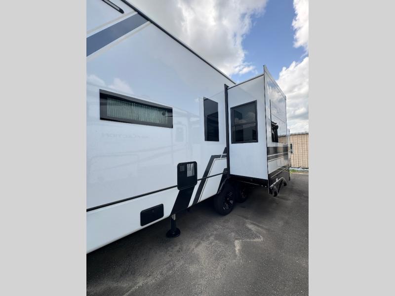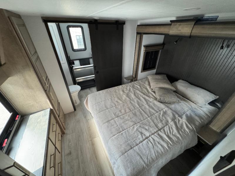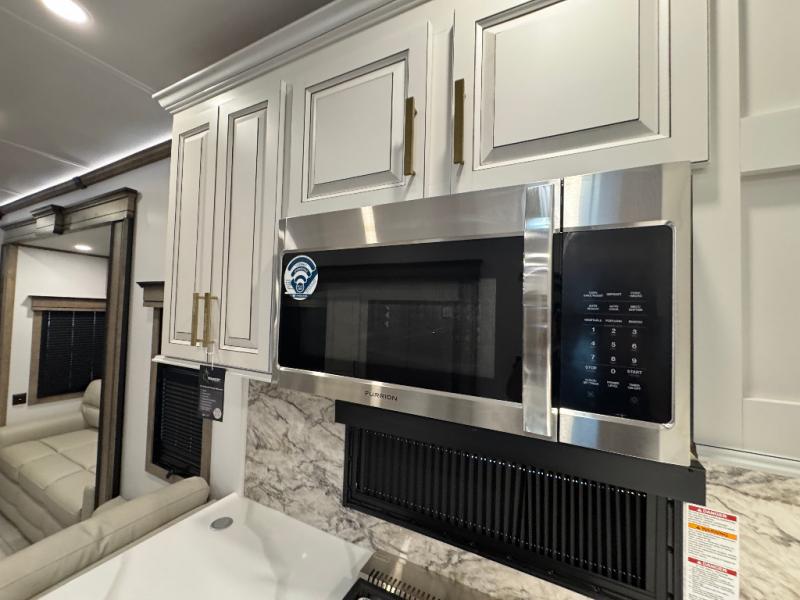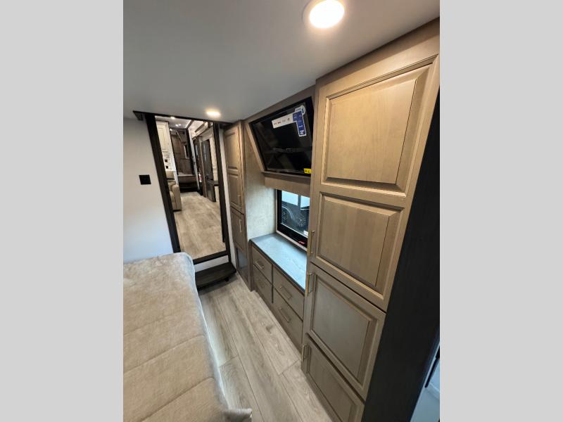 Traveling with friends and family is easier than ever with this fifth wheel in tow! There are two master suites; one for you and one for guests! The front master suite includes a king bed slide out, a front closet with a hamper, plus stackable washer/dryer prep if you want the option to make wash day easier. There is also convenient underbed storage, a dresser with a Smart HD TV, plus a private entrance into the dual entry bath. Head to the rear master suite to find just as much comfort with a queen bed slide out, dual closets and a dresser, plus a full rear bath where the second entry door is located. There is also a loft area above this room with three bunk mats for more campers! The middle kitchen and living area includes many comforts, like the power theater seating across from the 50" Smart TV and hide-a-bed sofa, plus the U-shaped kitchen with ample counter space and a 24" range. You'll also find food storage in the pantry and 18 cu. ft. residential refrigerator with an ice maker, or you can choose the slightly larger optional 20 cu. ft. refrigerator!
