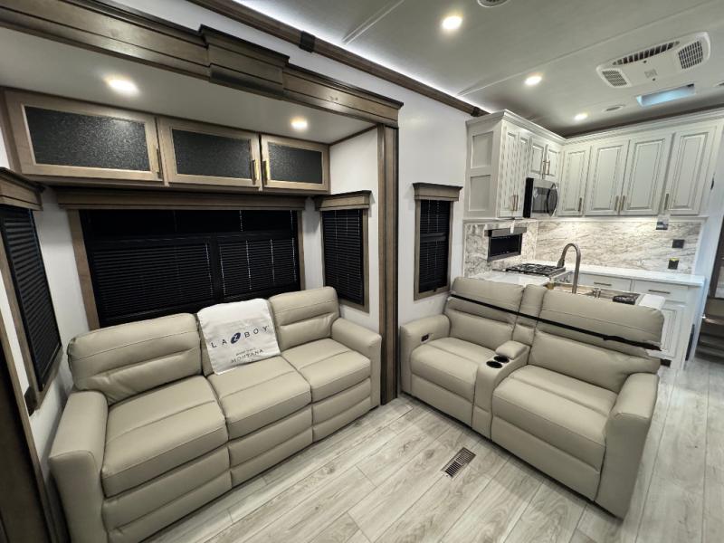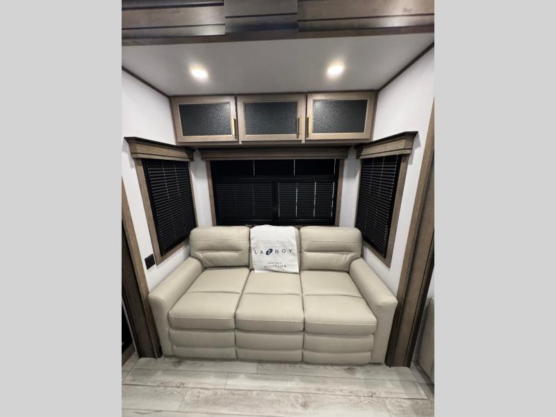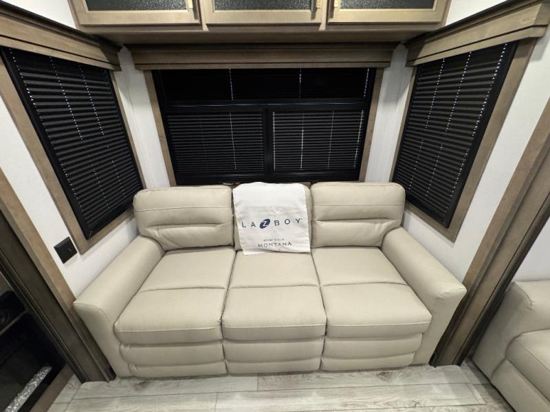 Enjoy luxury, innovation, and the outdoors in any one of Montana's finest fifth wheels. Each set the standard with exceptional features, and exciting factory installed options to provide you a great home on the road. Keystone's exclusive 12" I-beam chassis with z-frame technology has been reengineered to be stronger, lighter, and built for "the long haul". A few other construction features you will appreciate include a Road Armor suspension, 2" thick, dual-layered lauan high gloss fiberglass sidewalls, a MaxTurn front cap with KeyShield automotive-grade paint, and a fully walkable roof with an Alpha seamless TPO membrane system. Each feature stylish interiors with two decor choices paired with beautiful hardwood cabinetry, vinyl flooring throughout, central vacuum, plus a La-Z-Boy furniture package for all-around comfort!
