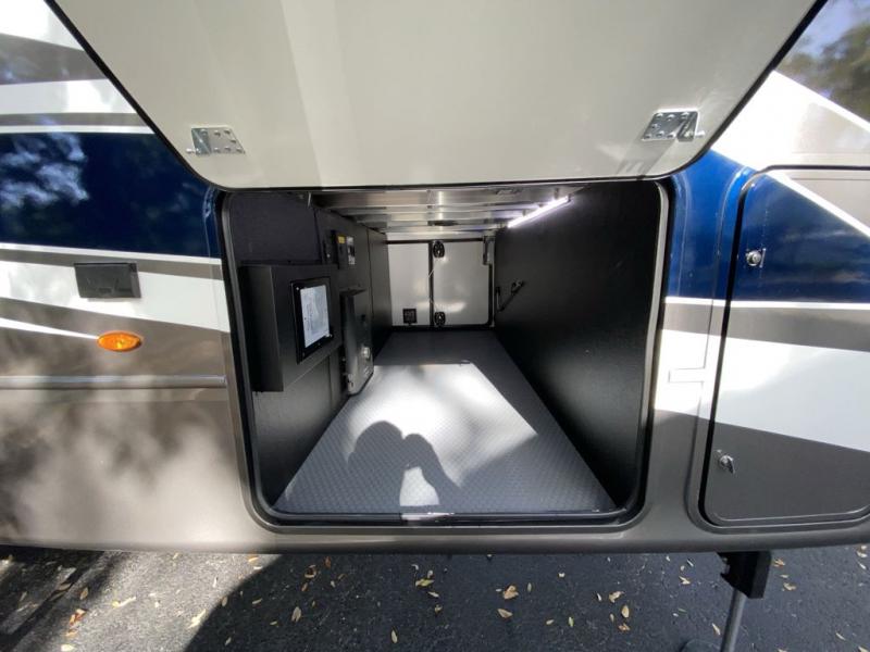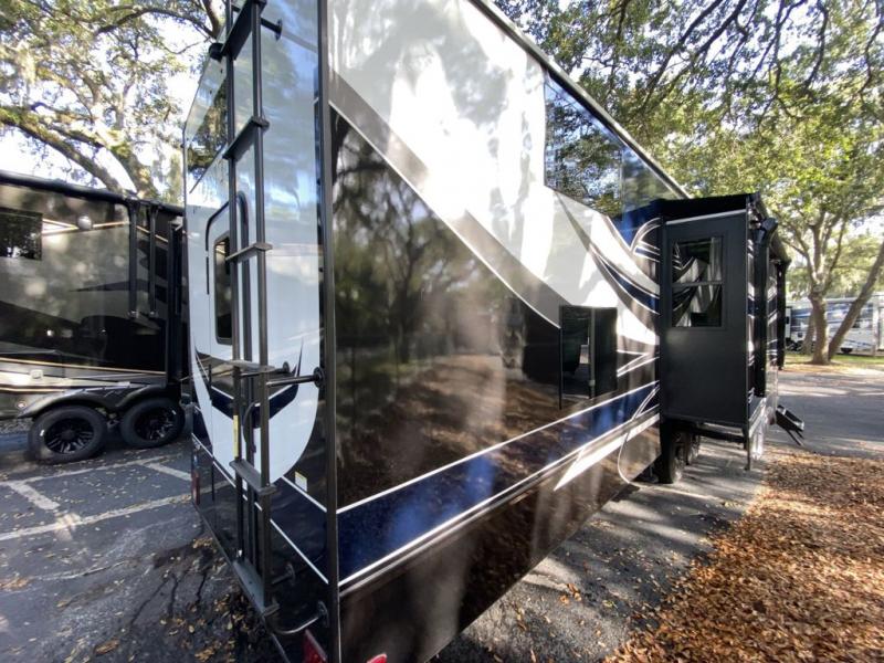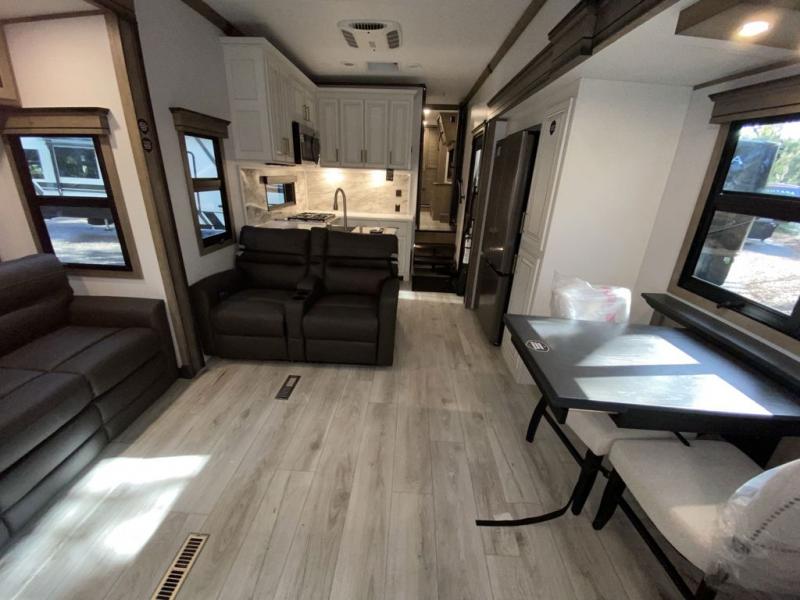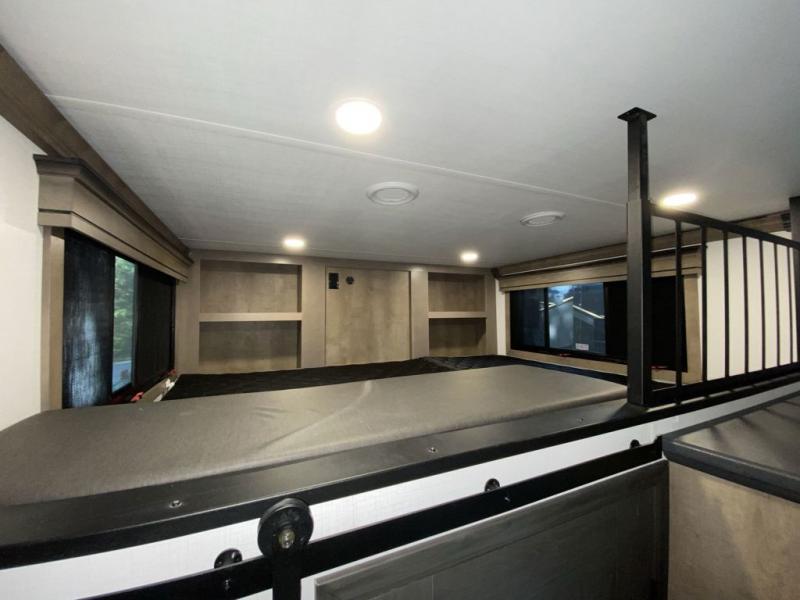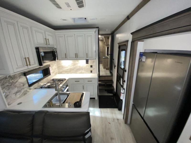 Traveling with friends and family is easier than ever with this fifth wheel in tow! There are two master suites; one for you and one for guests! The front master suite includes a king bed slide out, a front closet with a hamper, plus stackable washer/dryer prep if you want the option to make wash day easier. There is also convenient underbed storage, a dresser with a Smart HD TV, plus a private entrance into the dual entry bath. Head to the rear master suite to find just as much comfort with a queen bed slide out, dual closets and a dresser, plus a full rear bath where the second entry door is located. There is also a loft area above this room with three bunk mats for more campers! The middle kitchen and living area includes many comforts, like the power theater seating across from the 50" Smart TV and hide-a-bed sofa, plus the U-shaped kitchen with ample counter space and a 24" range. You'll also find food storage in the pantry and 18 cu. ft. residential refrigerator with an ice maker, or you can choose the slightly larger optional 20 cu. ft. refrigerator!