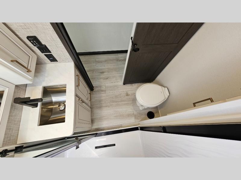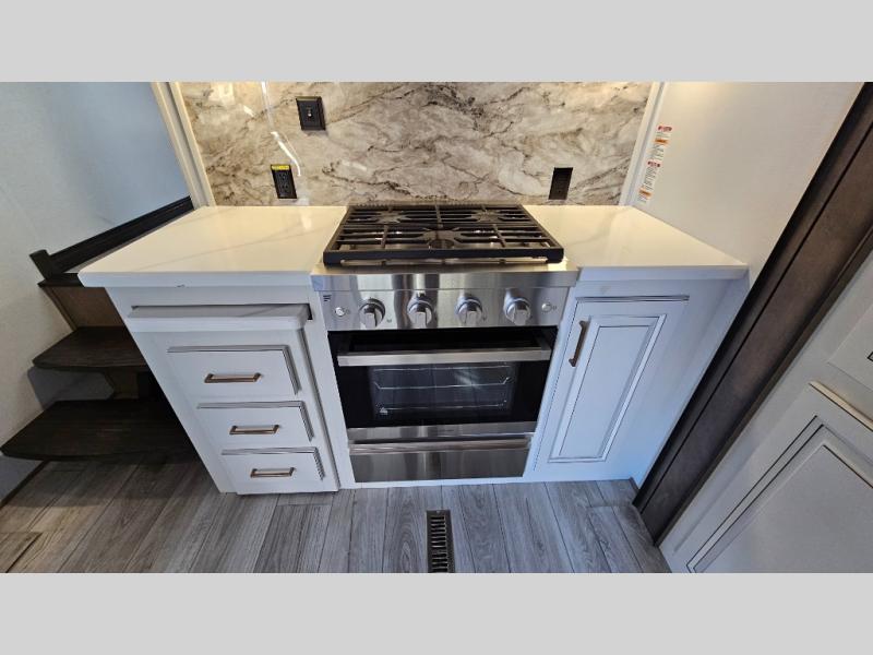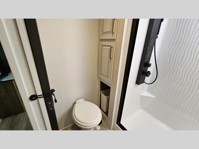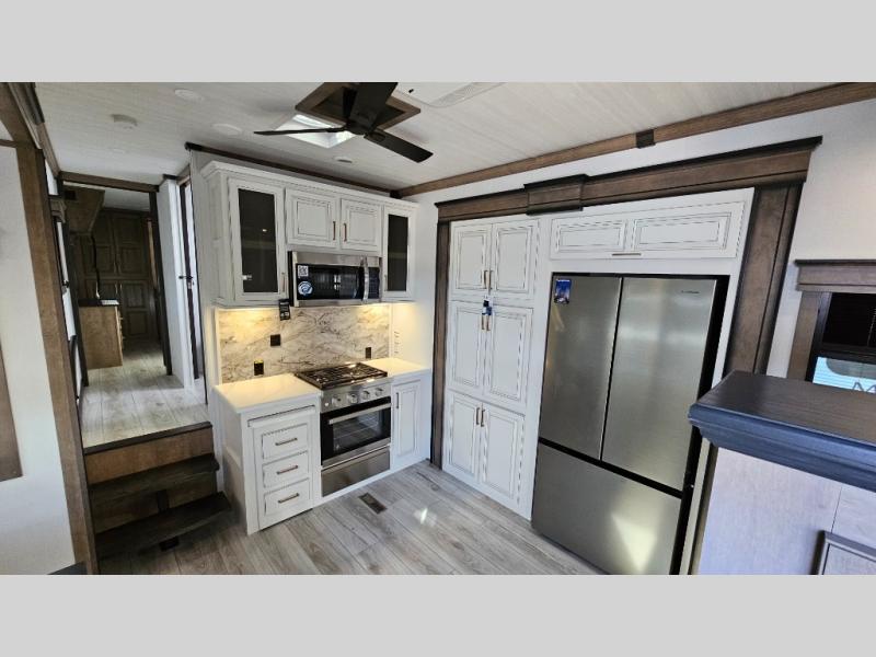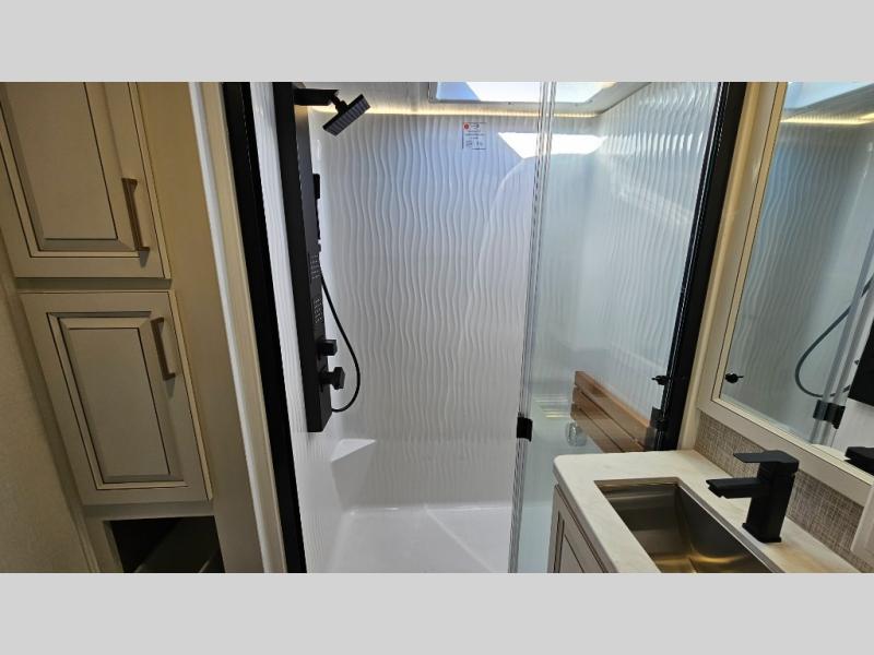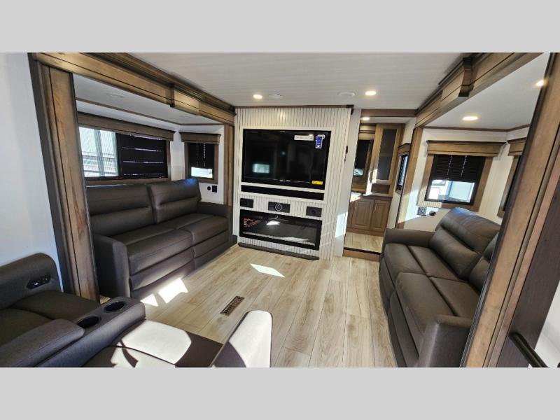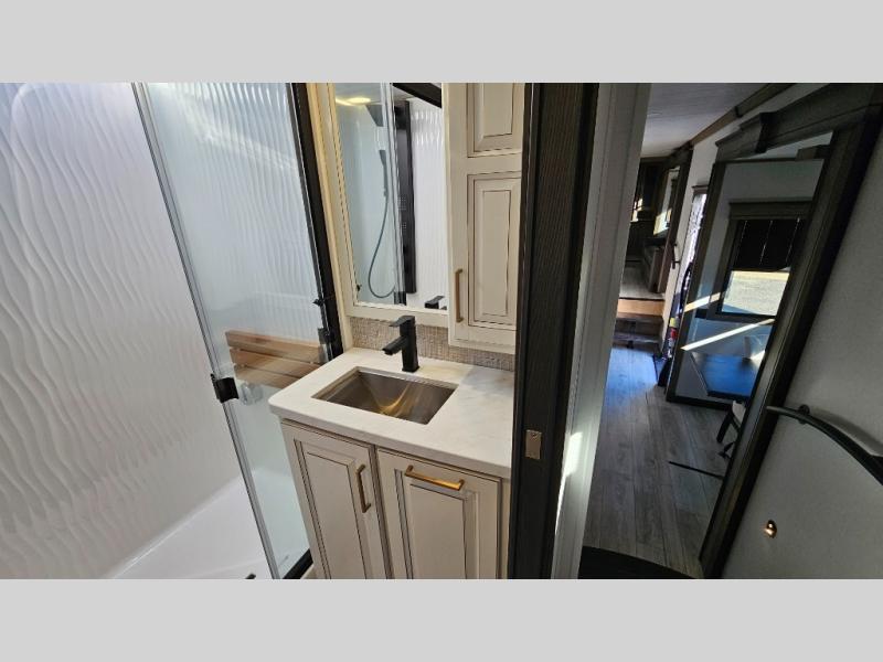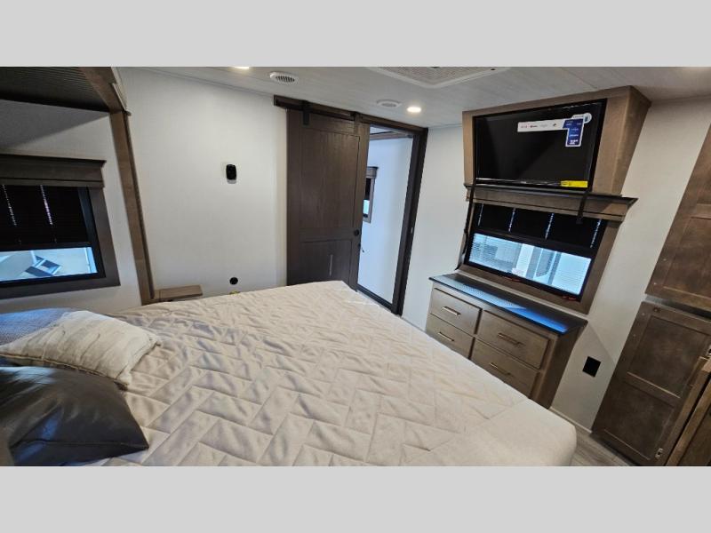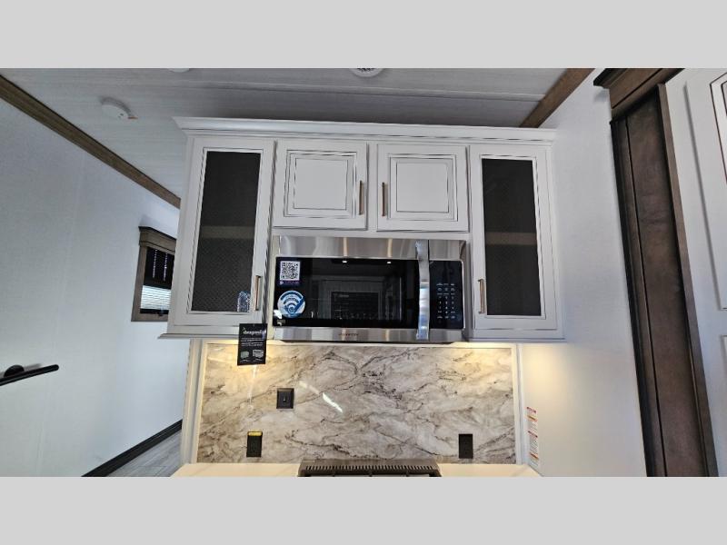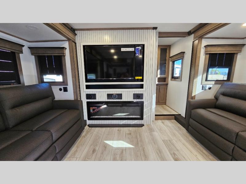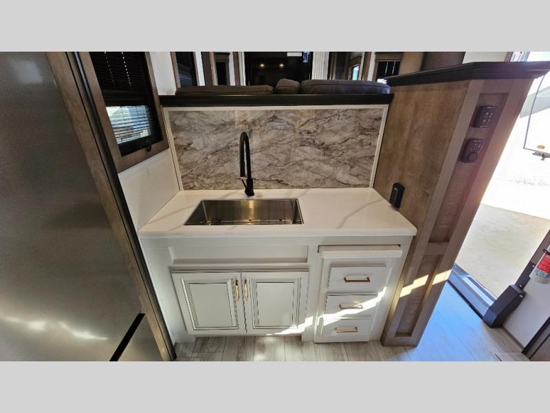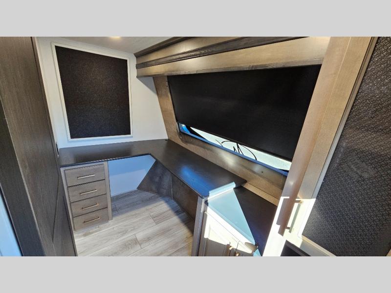Life will be easier at the campground in this fifth wheel with five slides and an outdoor kitchen! The spacious full bathroom has a 48" x 30" fiberglass shower with a seat and skylight above, a linen closet to keep your towels close, and a stylish barn door. The bedroom has a king bed slide with storage underneath across from a dresser with a 32" HDTV, as well as a large closet and an additional closet with stackable washer and dryer prep. The chef can prepare their best meals with extra counter space provided by the roll-out counters and the glass top range with a convection microwave, plus there is a pantry and a free standing dinette with storage to enjoy your meals at. The front of this fifth wheel is where it stands out above the rest; there is a spacious living area with two hide-a-bed sofas, power theater seating, and a private front office, complete with a desk, storage, and counter space!