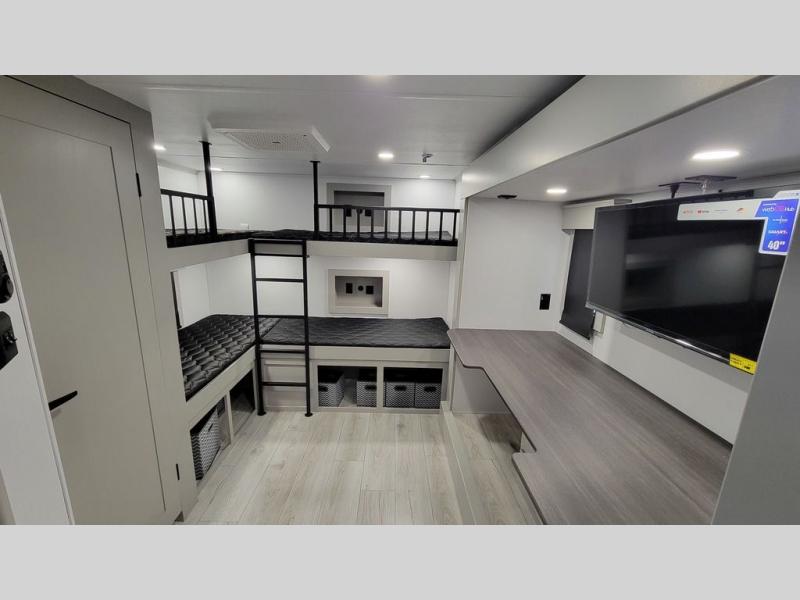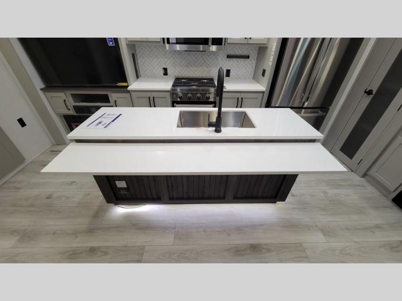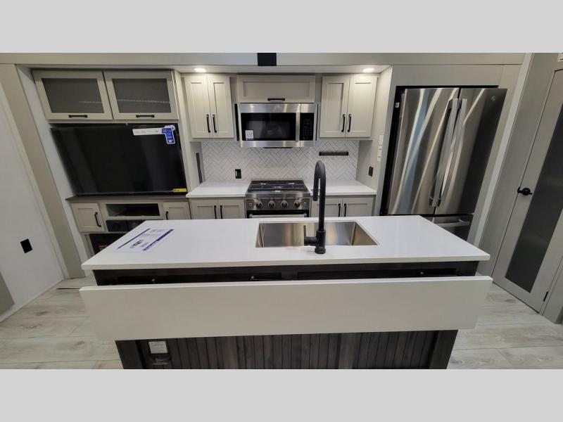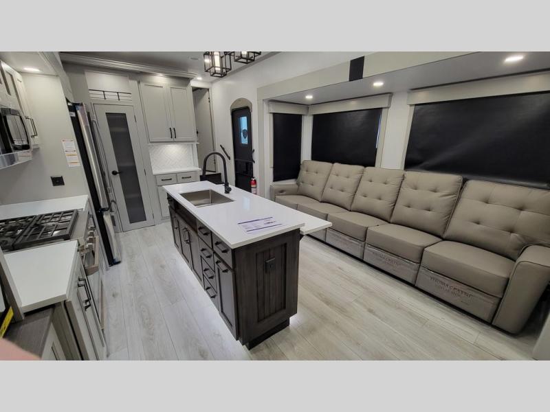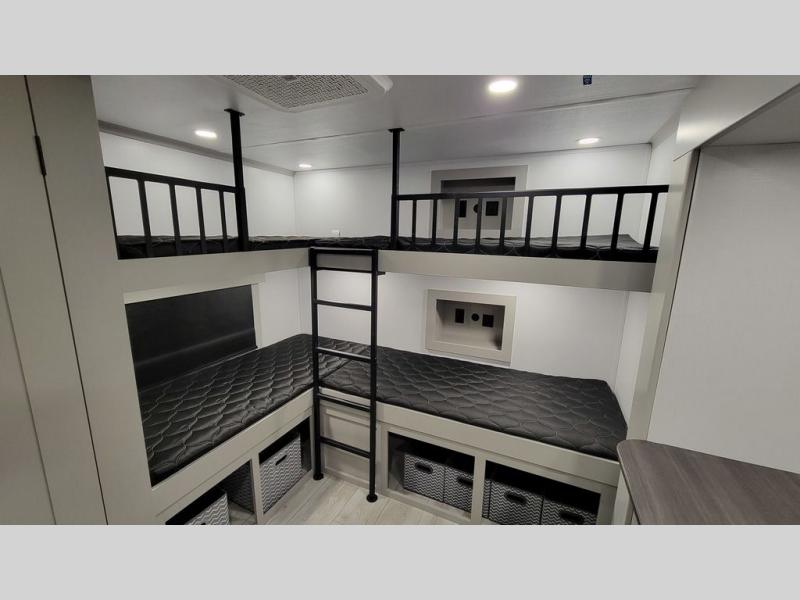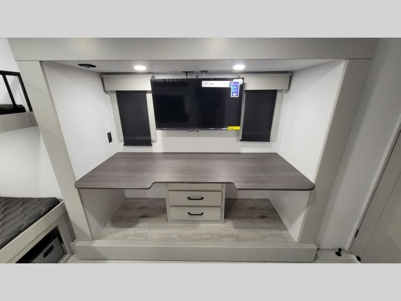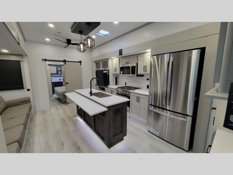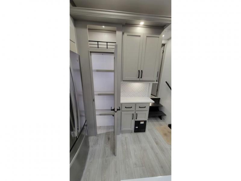 You'll love every minute spent in this spacious fifth wheel! It's perfect to camp with a larger group since there are bunk beds in the front bunkhouse suite plus a second suite in the back. The bunkhouse also includes two desks with chairs and storage drawers, a full bath, plus washer and dryer prep if you plan to go full-time. The rear suite features a king bed slide, two closets, a bedroom countertop plus a full rear bath with dual bath sinks; how convenient! Everyone will love to meet in the combined kitchen and living area in the morning. Here, you'll find two large opposing slides for tons of space, a large sofa and kitchen island, plus three pantries for all the snacks, canned goods, and paper products!