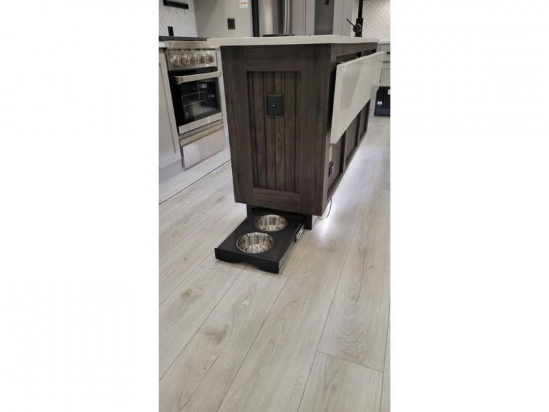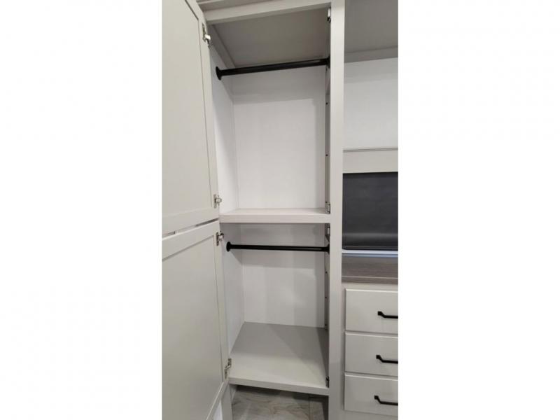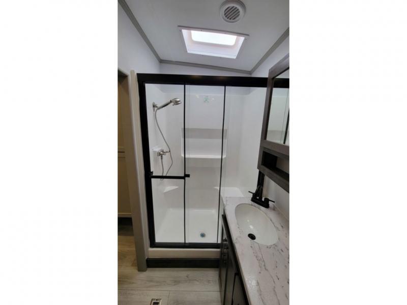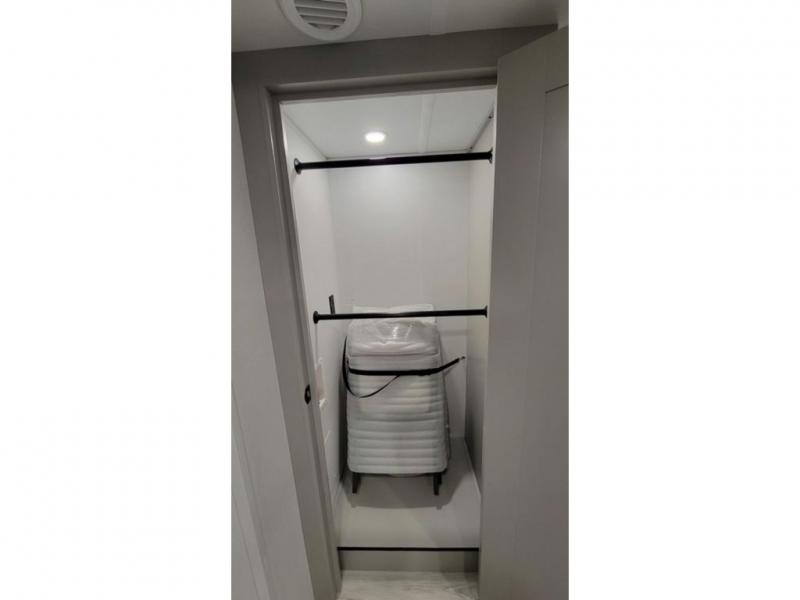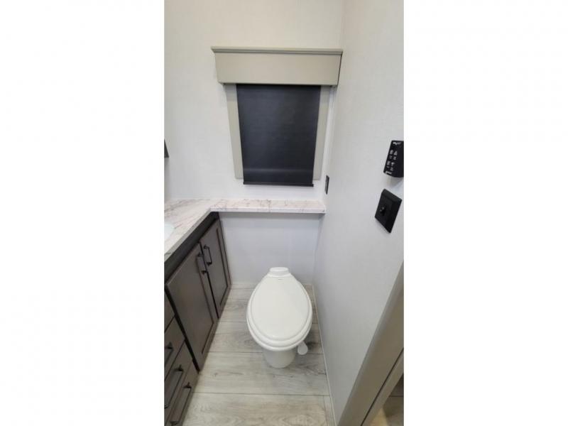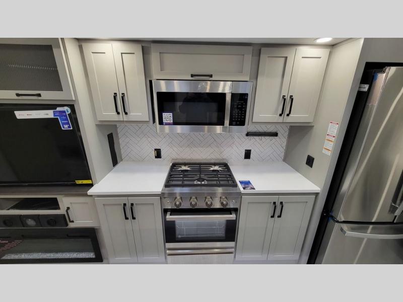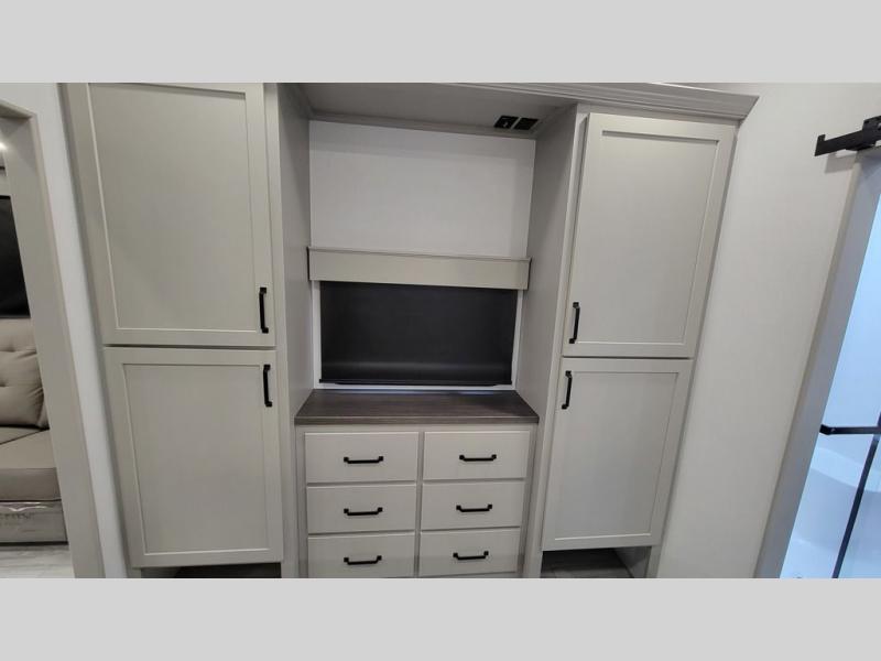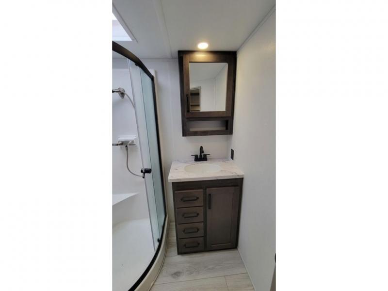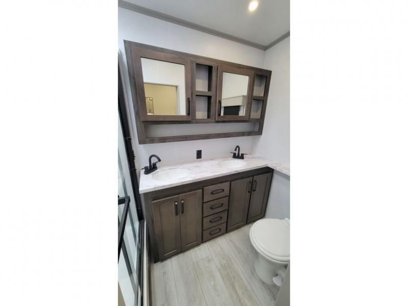 You'll love every minute spent in this spacious fifth wheel! It's perfect to camp with a larger group since there are bunk beds in the front bunkhouse suite plus a second suite in the back. The bunkhouse also includes two desks with chairs and storage drawers, a full bath, plus washer and dryer prep if you plan to go full-time. The rear suite features a king bed slide, two closets, a bedroom countertop plus a full rear bath with dual bath sinks; how convenient! Everyone will love to meet in the combined kitchen and living area in the morning. Here, you'll find two large opposing slides for tons of space, a large sofa and kitchen island, plus three pantries for all the snacks, canned goods, and paper products!
