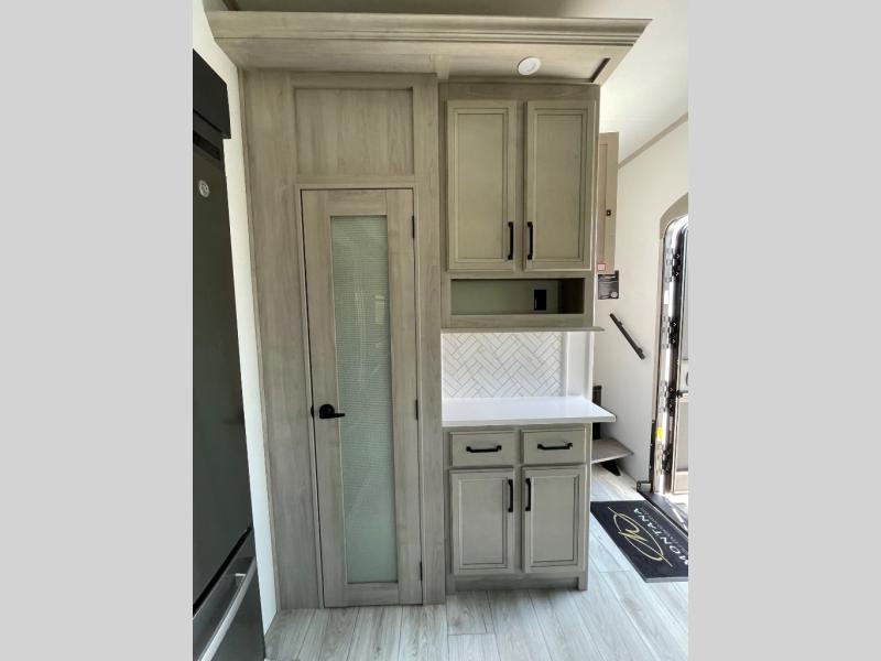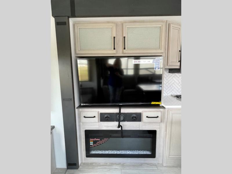 You can take this Montana High Country fifth wheel to the campsite of your choice! You'll have plenty of comfort with the king-size bed in the front master suite, and you can also let some friends or kids sleep on the hide-a-bed sofa in the rear living area. While you watch the 50" LCD TV, you can sit back in the power theater seating, and you can switch on the fireplace for some added heat if it's cool outside. The opposing slides in the main living area are what give you extra space to work freely around the kitchen island, and the coffee station allows you to prepare your afternoon pick-me-up with all of your coffee essentials sitting in one place just like at home.