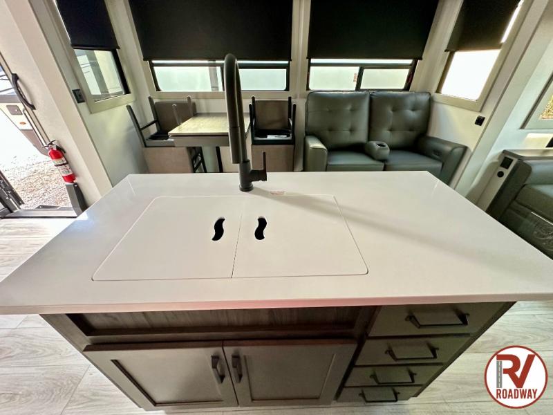 You can take this Montana High Country fifth wheel to the campsite of your choice! You'll have plenty of comfort with the king-size bed in the front master suite, and you can also let some friends or kids sleep on the hide-a-bed sofa in the rear living area. While you watch the 50" LCD TV, you can sit back in the power theater seating, and you can switch on the fireplace for some added heat if it's cool outside. The opposing slides in the main living area are what give you extra space to work freely around the kitchen island, and the coffee station allows you to prepare your afternoon pick-me-up with all of your coffee essentials sitting in one place just like at home.