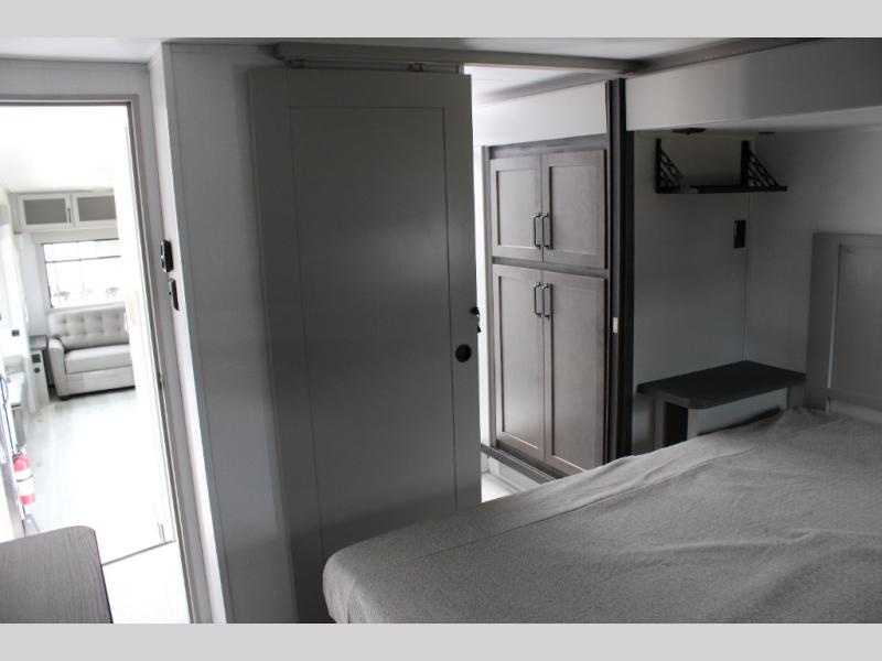 You can take this Montana High Country fifth wheel to the campsite of your choice! You'll have plenty of comfort with the king-size bed in the front master suite, and you can also let some friends or kids sleep on the hide-a-bed sofa in the rear living area. While you watch the 50" LCD TV, you can sit back in the power theater seating, and you can switch on the fireplace for some added heat if it's cool outside. The opposing slides in the main living area are what give you extra space to work freely around the kitchen island, and the coffee station allows you to prepare your afternoon pick-me-up with all of your coffee essentials sitting in one place just like at home.