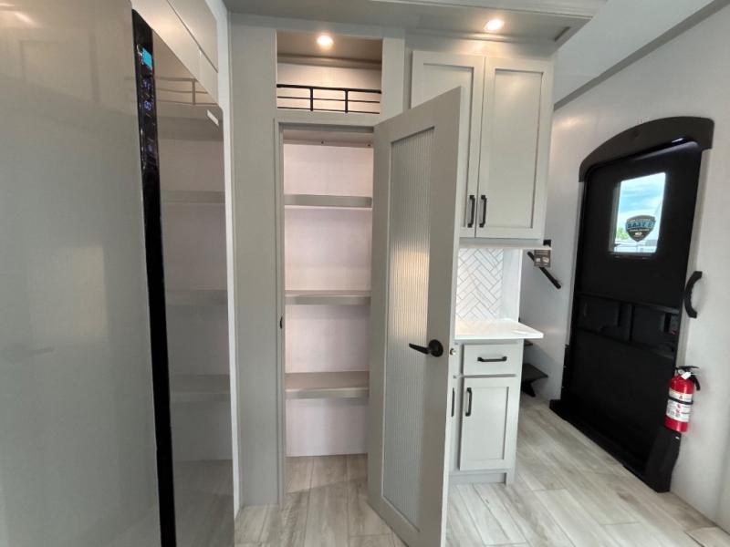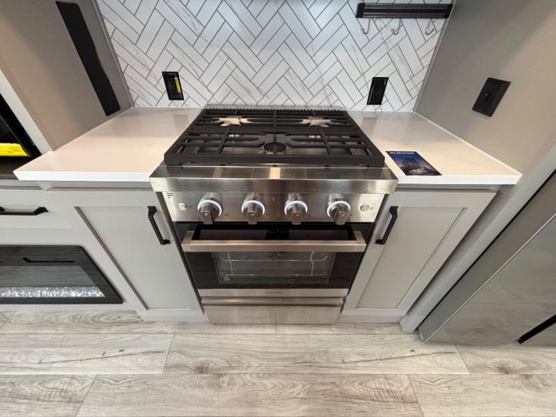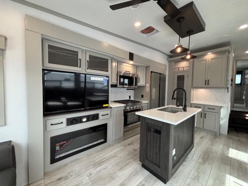 You can take this Montana High Country fifth wheel to the campsite of your choice! You'll have plenty of comfort with the king-size bed in the front master suite, and you can also let some friends or kids sleep on the hide-a-bed sofa in the rear living area. While you watch the 50" LCD TV, you can sit back in the power theater seating, and you can switch on the fireplace for some added heat if it's cool outside. The opposing slides in the main living area are what give you extra space to work freely around the kitchen island, and the coffee station allows you to prepare your afternoon pick-me-up with all of your coffee essentials sitting in one place just like at home.