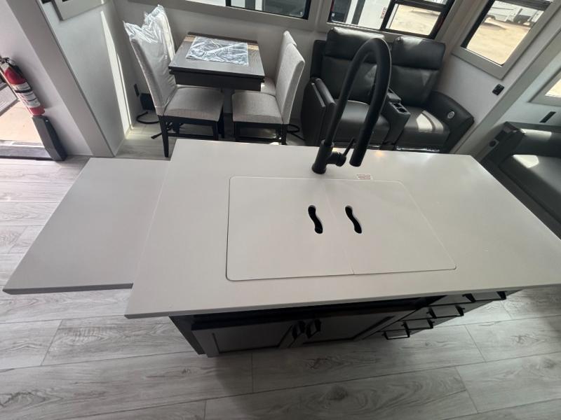 You can take this Montana High Country fifth wheel to the campsite of your choice! You'll have plenty of comfort with the king-size bed in the front master suite, and you can also let some friends or kids sleep on the hide-a-bed sofa in the rear living area. While you watch the 50" LCD TV, you can sit back in the power theater seating, and you can switch on the fireplace for some added heat if it's cool outside. The opposing slides in the main living area are what give you extra space to work freely around the kitchen island, and the coffee station allows you to prepare your afternoon pick-me-up with all of your coffee essentials sitting in one place just like at home.