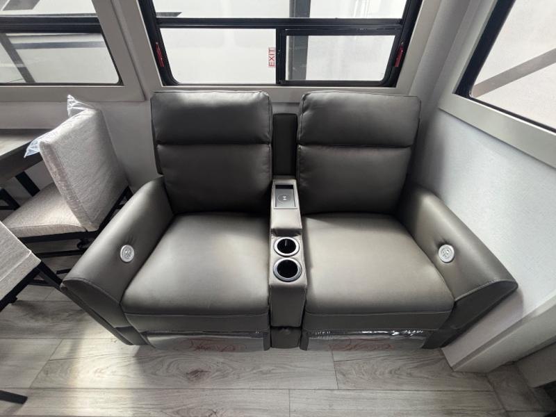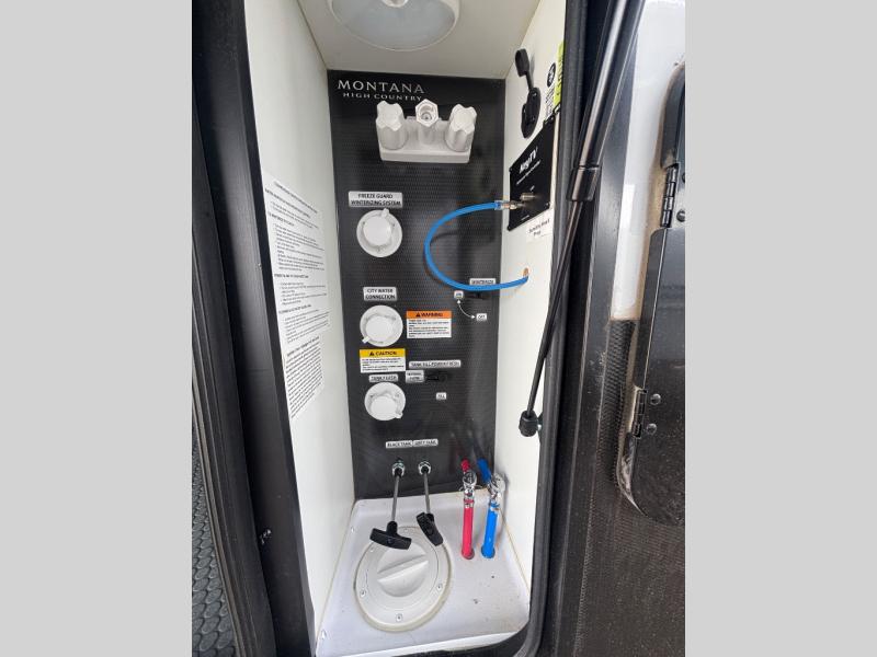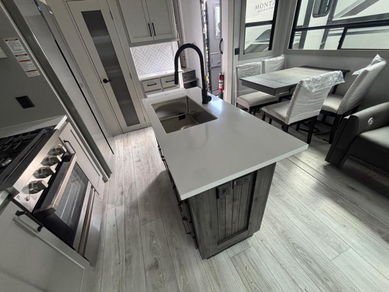You can take this Montana High Country fifth wheel to the campsite of your choice! You'll have plenty of comfort with the king-size bed in the front master suite, and you can also let some friends or kids sleep on the hide-a-bed sofa in the rear living area. While you watch the 50" LCD TV, you can sit back in the power theater seating, and you can switch on the fireplace for some added heat if it's cool outside. The opposing slides in the main living area are what give you extra space to work freely around the kitchen island, and the coffee station allows you to prepare your afternoon pick-me-up with all of your coffee essentials sitting in one place just like at home.