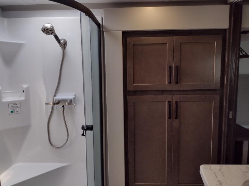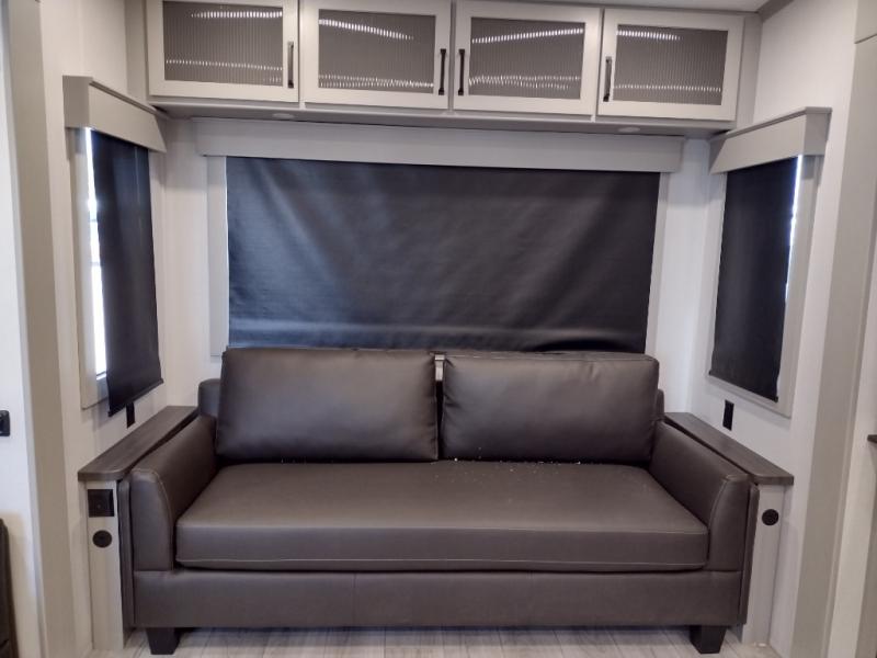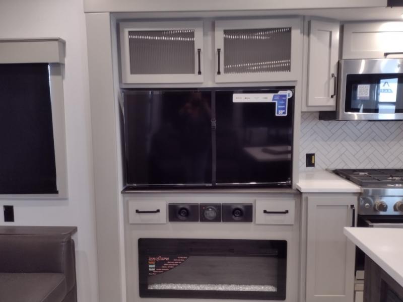 You can take this Montana High Country fifth wheel to the campsite of your choice! You'll have plenty of comfort with the king-size bed in the front master suite, and you can also let some friends or kids sleep on the hide-a-bed sofa in the rear living area. While you watch the 50" LCD TV, you can sit back in the power theater seating, and you can switch on the fireplace for some added heat if it's cool outside. The opposing slides in the main living area are what give you extra space to work freely around the kitchen island, and the coffee station allows you to prepare your afternoon pick-me-up with all of your coffee essentials sitting in one place just like at home.