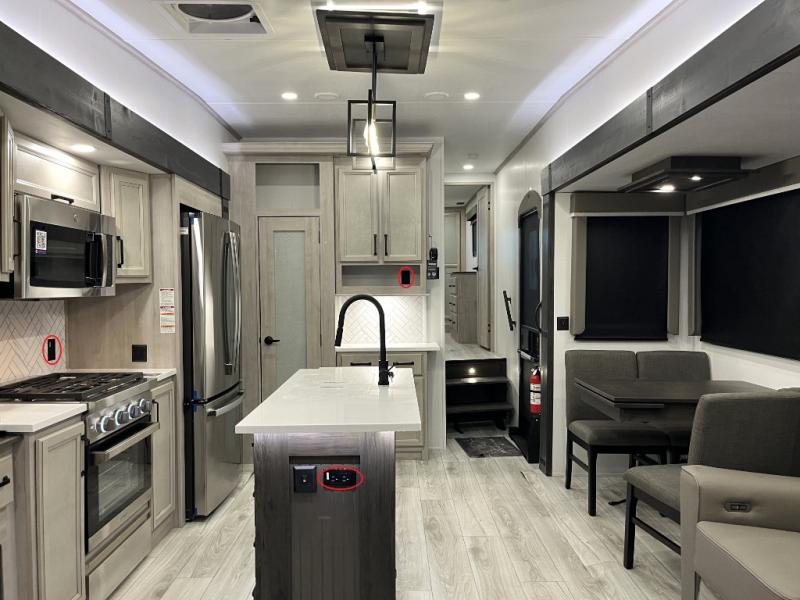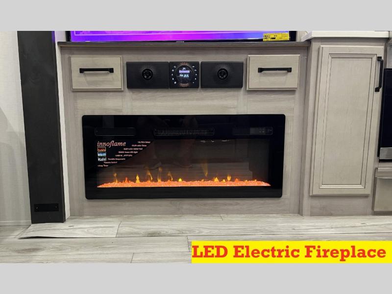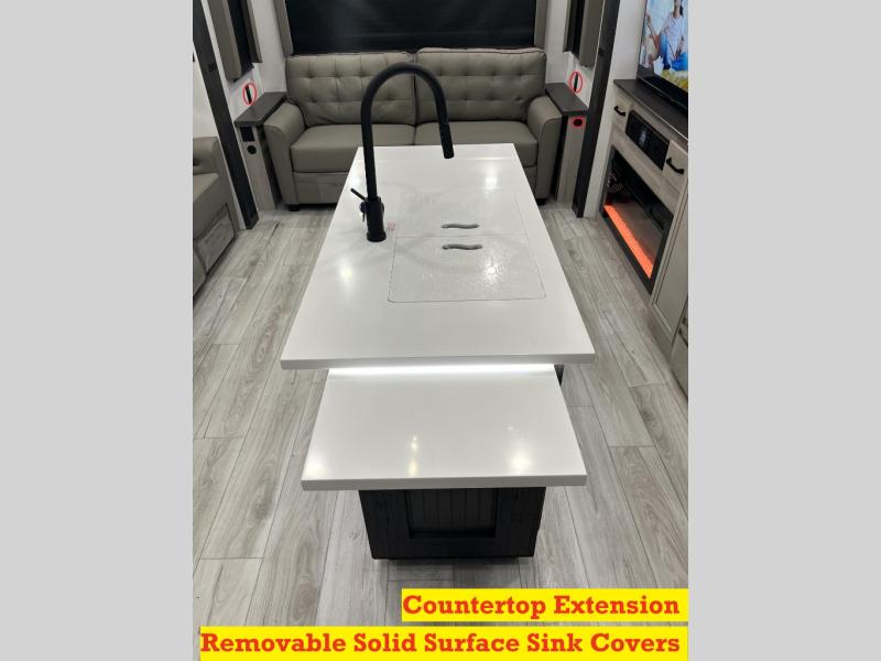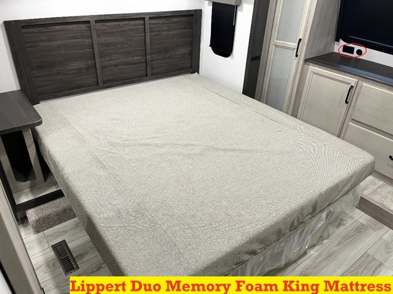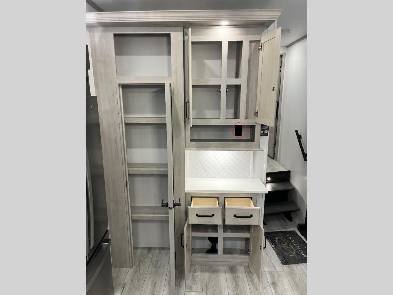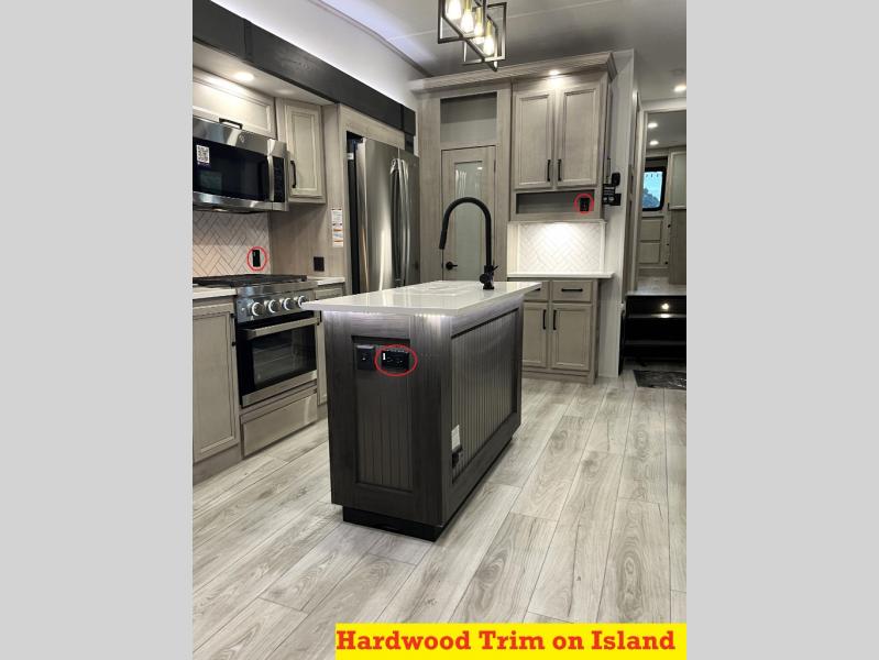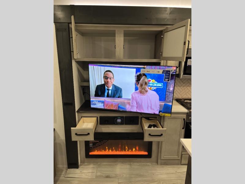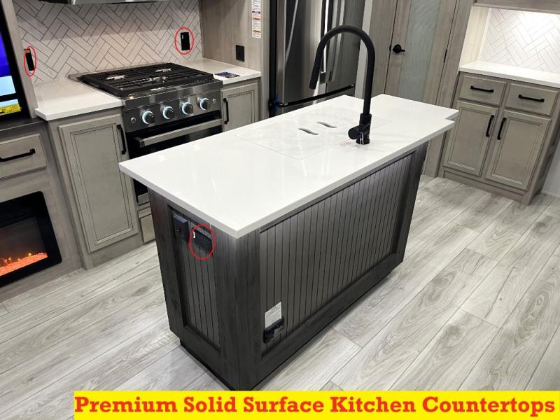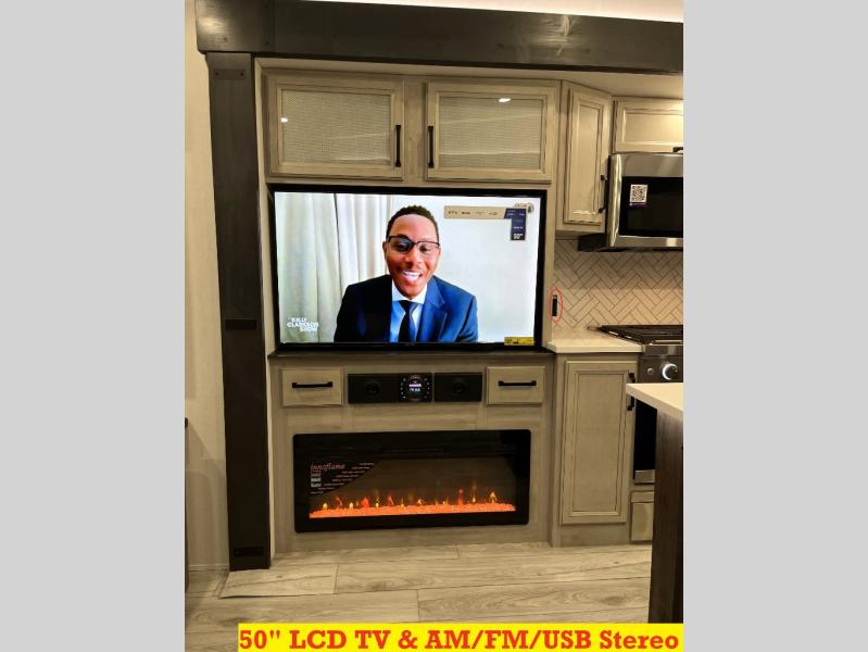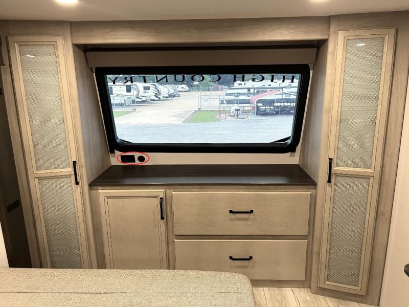 You can take this Montana High Country fifth wheel to the campsite of your choice! You'll have plenty of comfort with the king-size bed in the front master suite, and you can also let some friends or kids sleep on the hide-a-bed sofa in the rear living area. While you watch the 50" LCD TV, you can sit back in the power theater seating, and you can switch on the fireplace for some added heat if it's cool outside. The opposing slides in the main living area are what give you extra space to work freely around the kitchen island, and the coffee station allows you to prepare your afternoon pick-me-up with all of your coffee essentials sitting in one place just like at home.