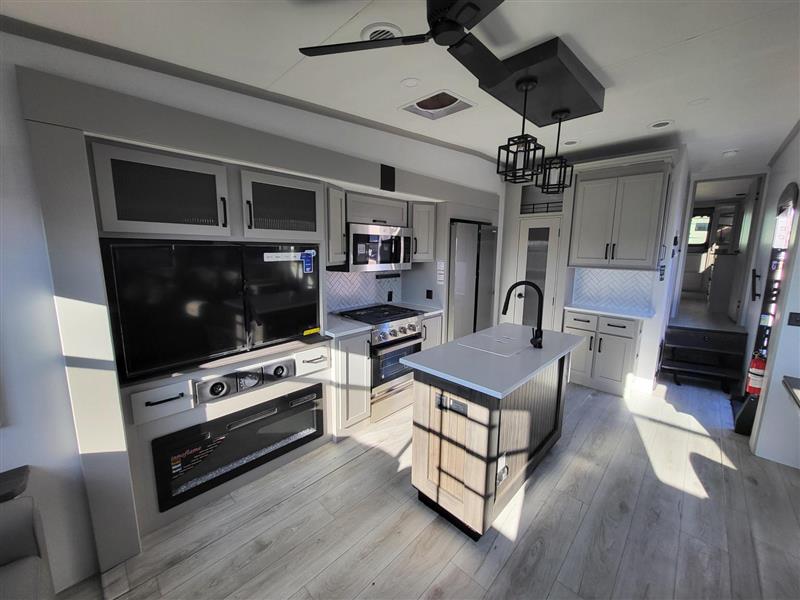 You can take this Montana High Country fifth wheel to the campsite of your choice! You'll have plenty of comfort with the king-size bed in the front master suite, and you can also let some friends or kids sleep on the hide-a-bed sofa in the rear living area. While you watch the 50" LCD TV, you can sit back in the power theater seating, and you can switch on the fireplace for some added heat if it's cool outside. The opposing slides in the main living area are what give you extra space to work freely around the kitchen island, and the coffee station allows you to prepare your afternoon pick-me-up with all of your coffee essentials sitting in one place just like at home.