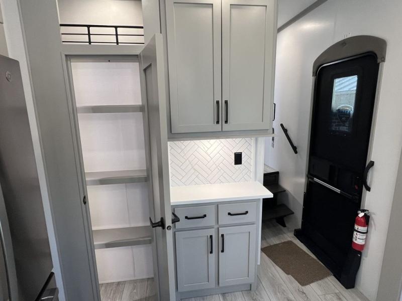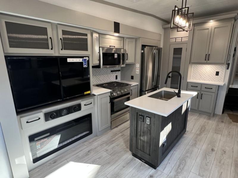 You can take this Montana High Country fifth wheel to the campsite of your choice! You'll have plenty of comfort with the king-size bed in the front master suite, and you can also let some friends or kids sleep on the hide-a-bed sofa in the rear living area. While you watch the 50" LCD TV, you can sit back in the power theater seating, and you can switch on the fireplace for some added heat if it's cool outside. The opposing slides in the main living area are what give you extra space to work freely around the kitchen island, and the coffee station allows you to prepare your afternoon pick-me-up with all of your coffee essentials sitting in one place just like at home.