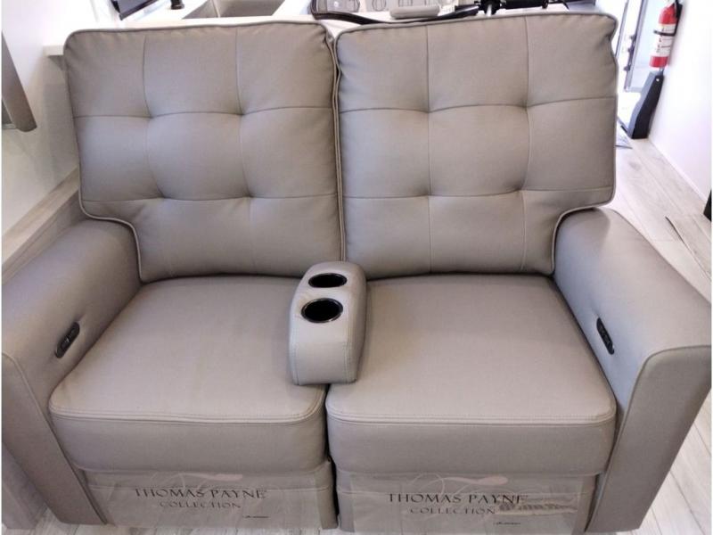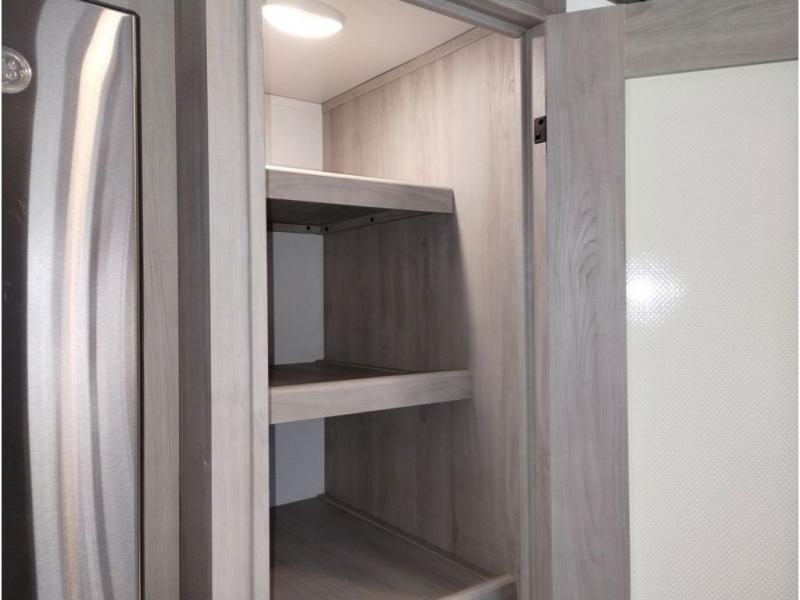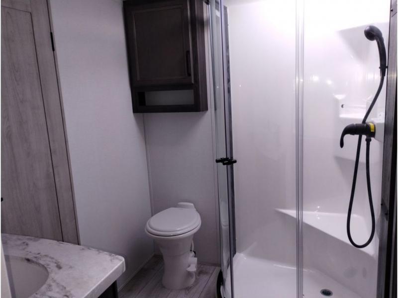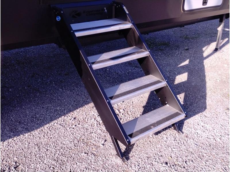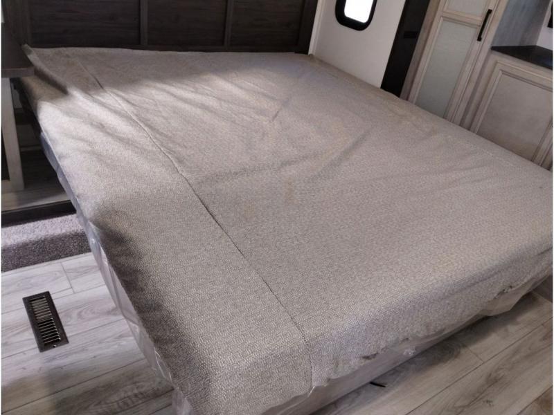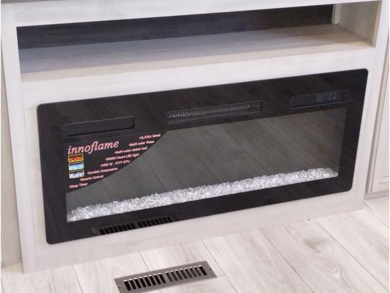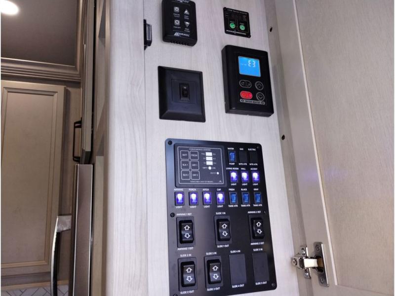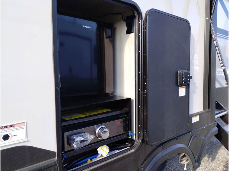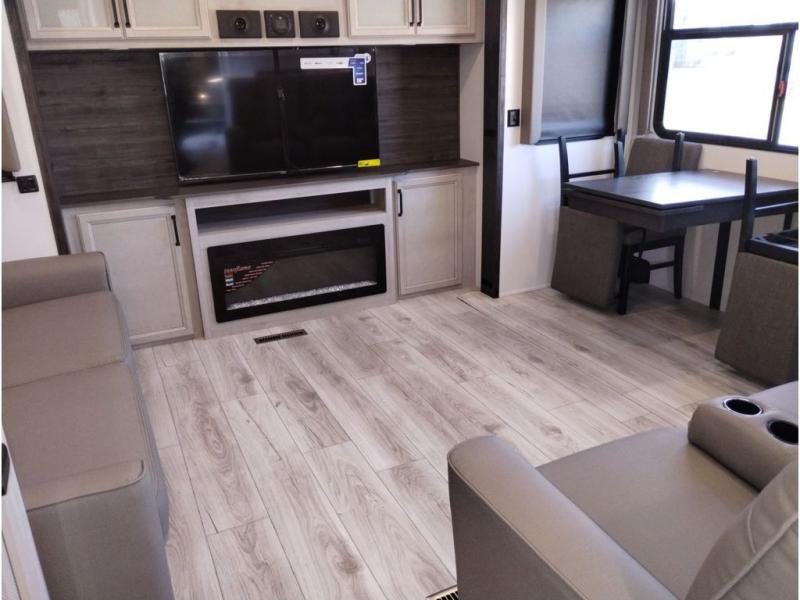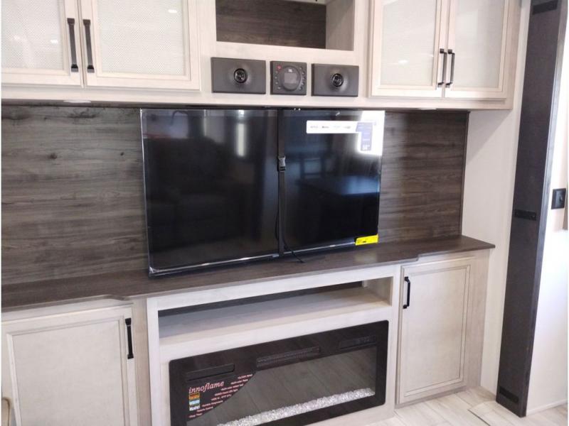 This couples coach will have you excited about traveling to all of your favorite places, and new locations too! The triple slide unit features an open concept living/dining area with dual opposing slides at the very back featuring a hide-a-bed sofa along the curbside, and a dining space opposite with a booth dinette or choose the optional table and four chairs. Power theater seats will be a comfortable place to kick back for a movie, and you will love the all-new entertainment center design featuring a fireplace, Smart TV, and overhead cabinets. In the evening, head up to your private retreat with a spacious bath including dual entry doors from the hall at the top of the stairs or from within the private bedroom. Get cleaned up in the large radius shower with seat and snuggle up in a king bed slide. The bedroom slide also features a large wardrobe that has been prepped for a washer/dryer if you choose to add the convenience. You will find plenty more storage spaces for your clothing and belongings in the two dressers or dual wardrobes along the full front wall. Another bonus with this unit is the outdoor kitchen which gives you a choice to cook inside or out!