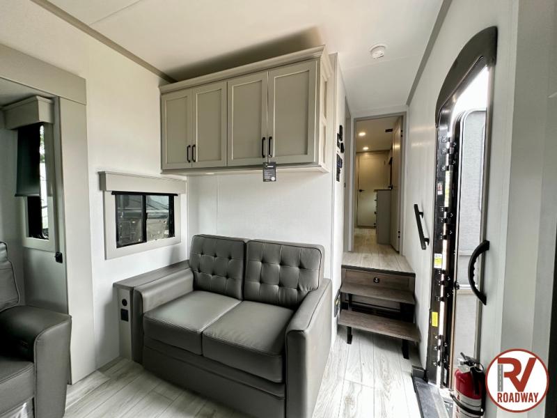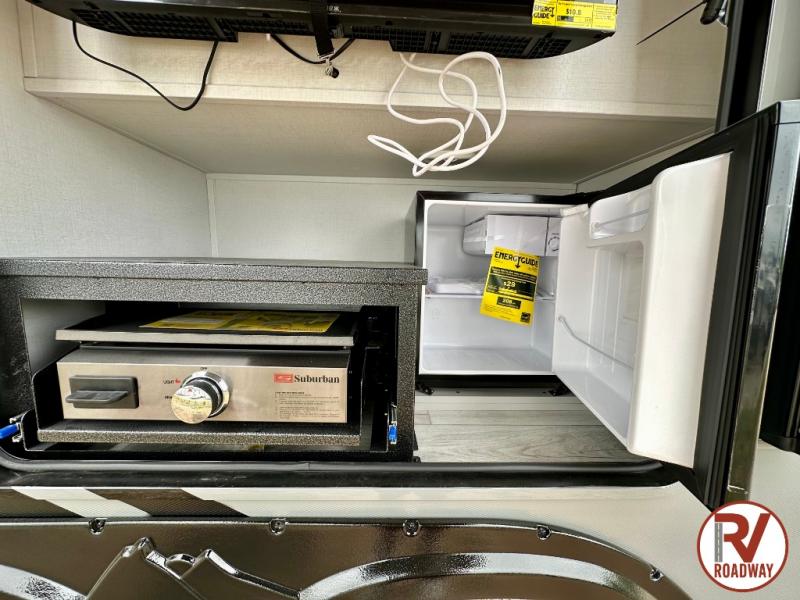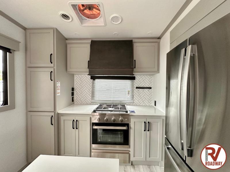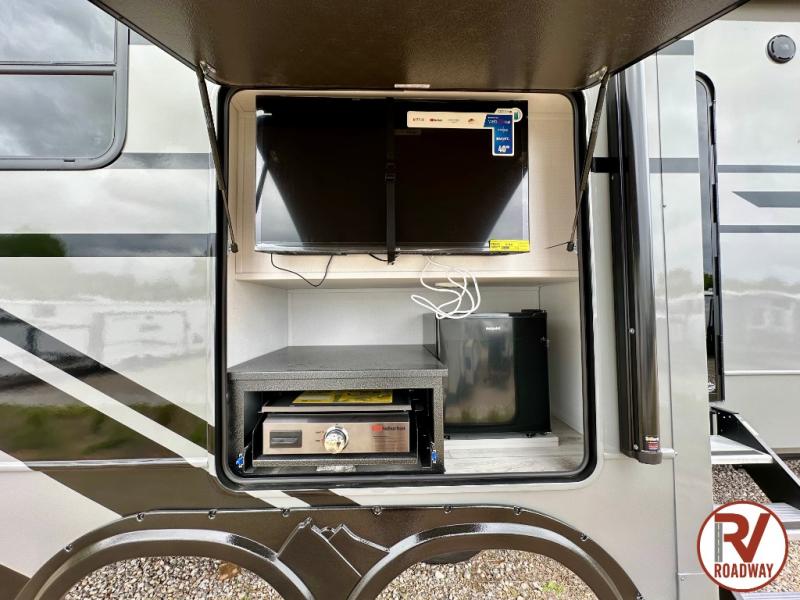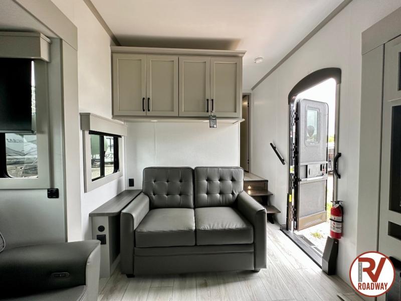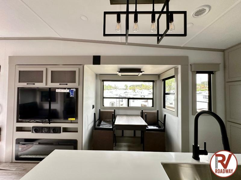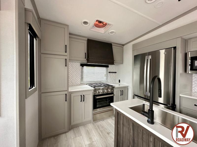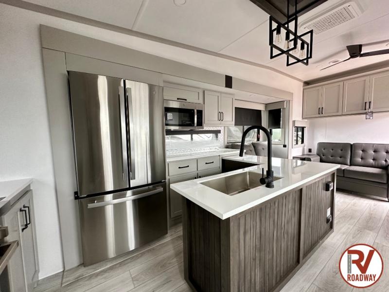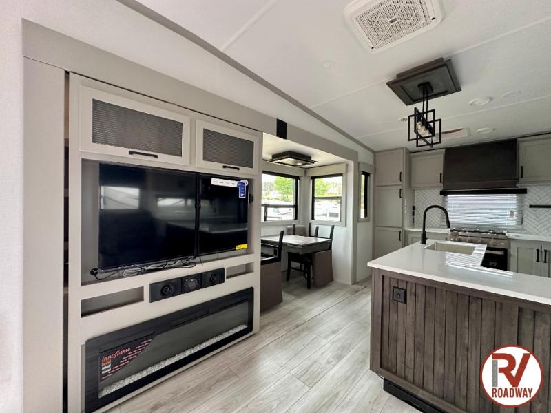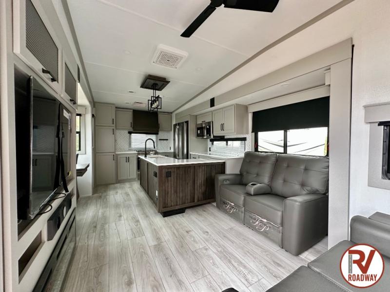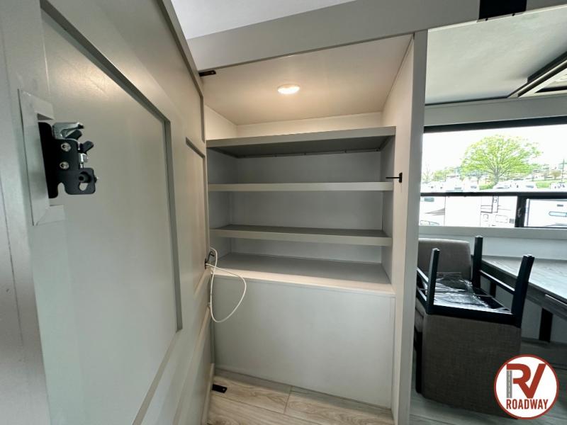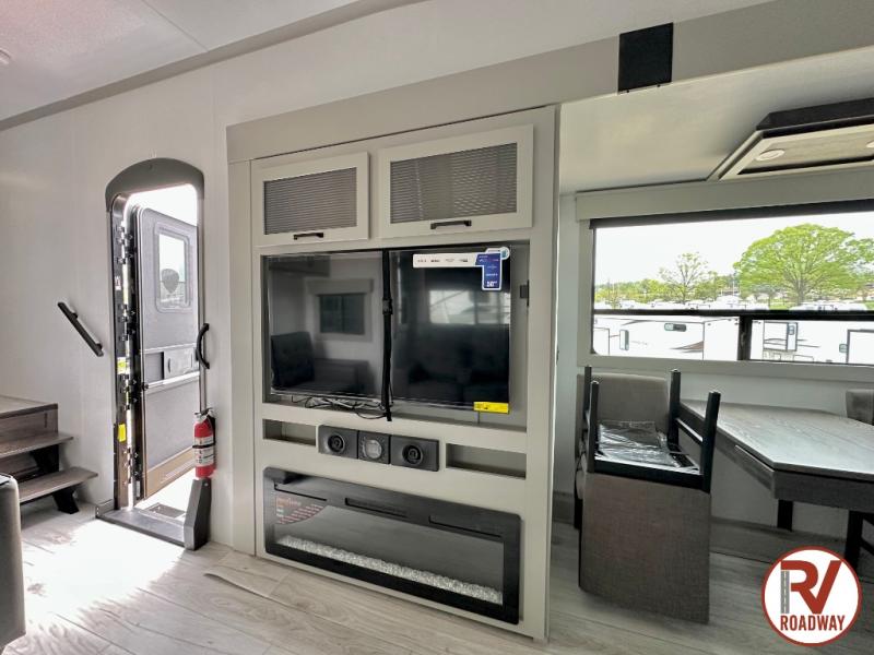 This rear kitchen fifth wheel features ample counter space, an L-shaped counter, plus a spacious pantry and residential refrigerator for food storage. Your crew can relax on the hide-a-bed sofa and power theater seating, or dine at the booth dinette. There is also an entertainment center and fireplace with a hidden pantry behind it for board games and movies. A full bath includes a shower with a seat for added comfort, and the front private bedroom with a king bed slide is sure to bring a great night's rest. You'll find a spacious wardrobe and a dresser to keep your clothes organized, plus washer and dryer prep if you want to add these appliances.