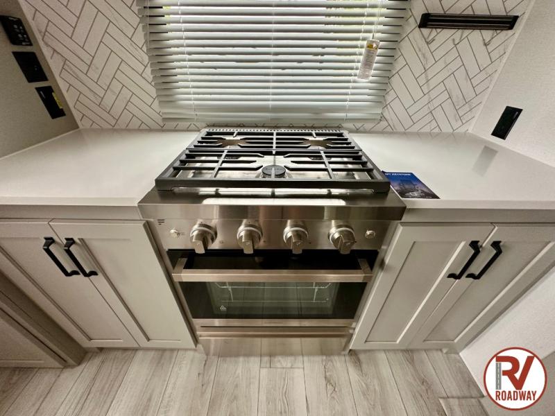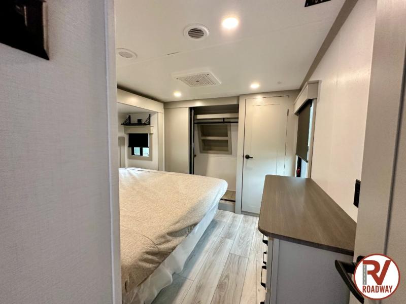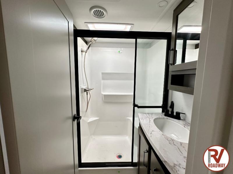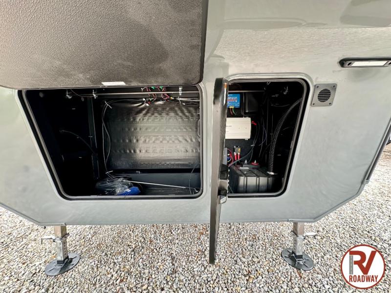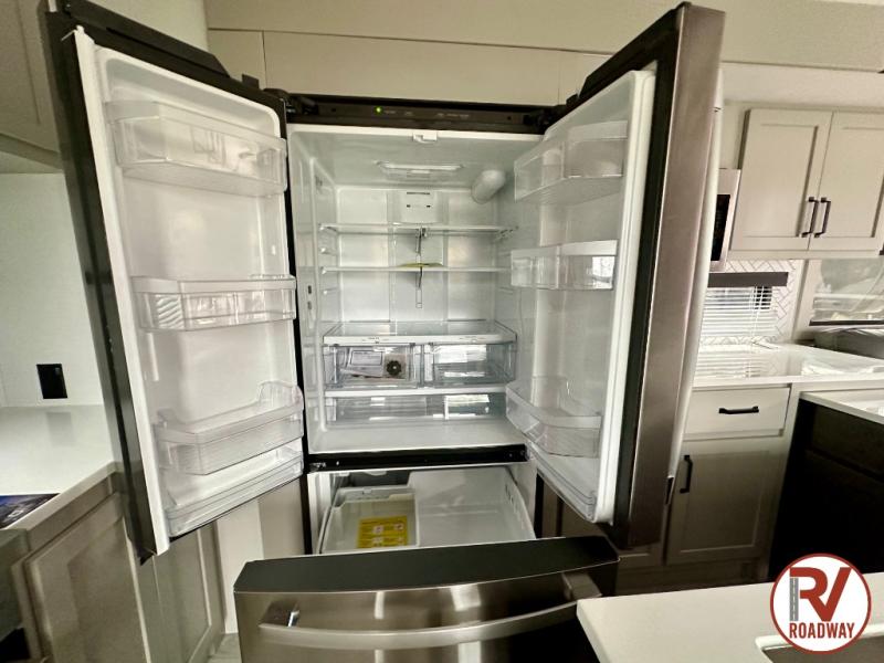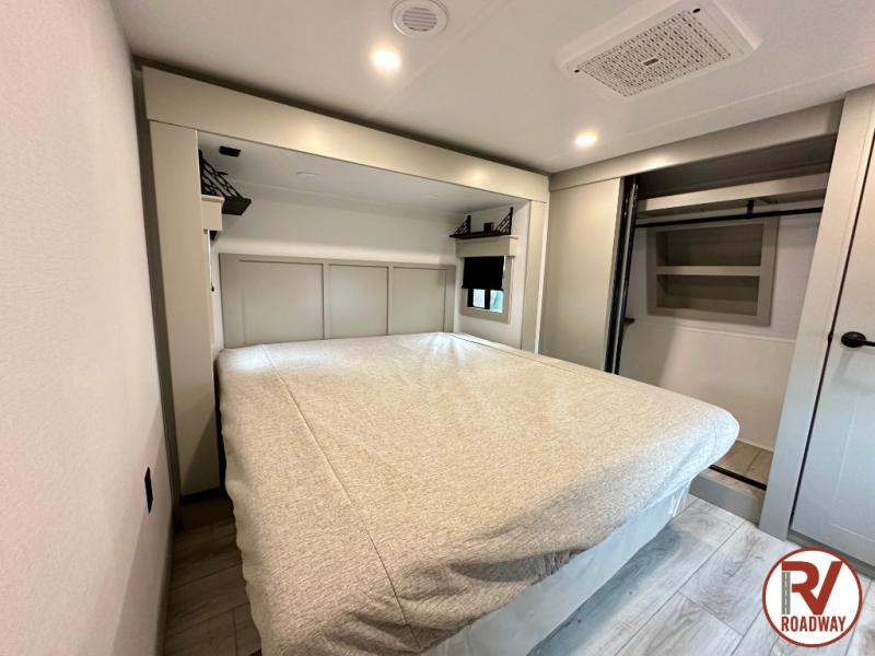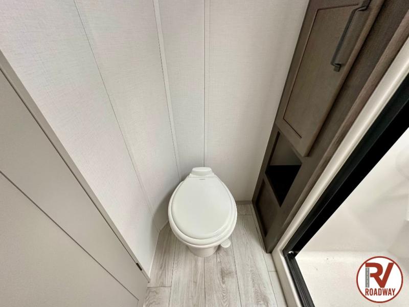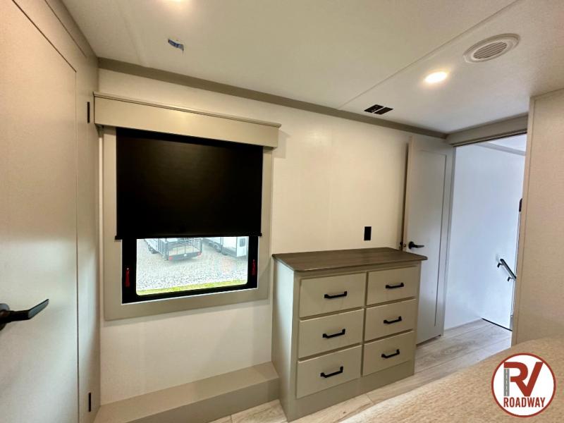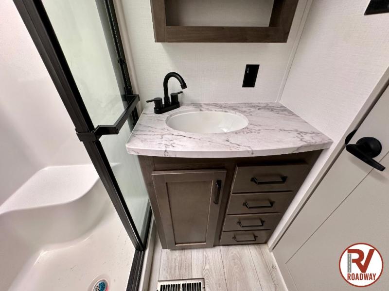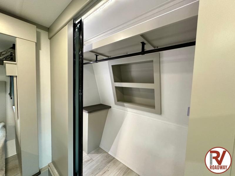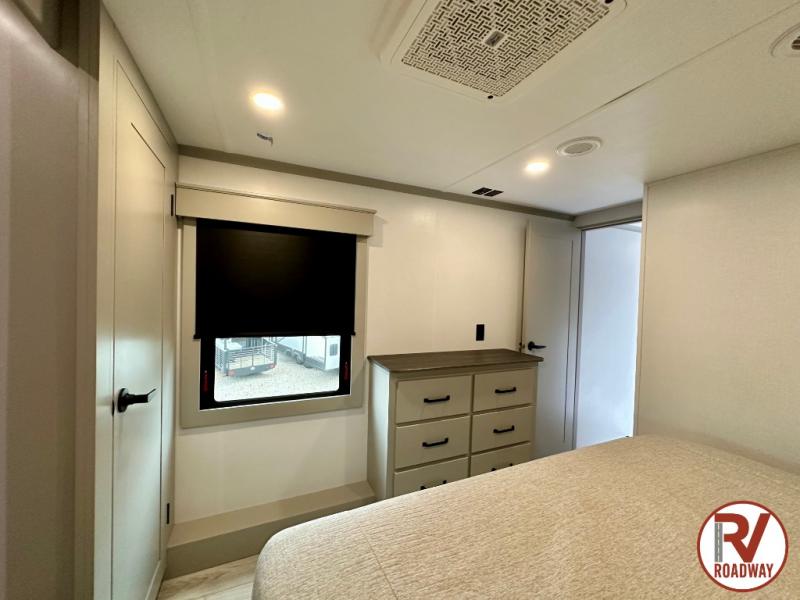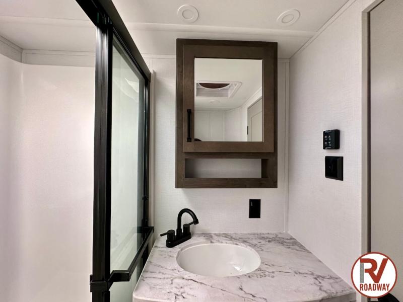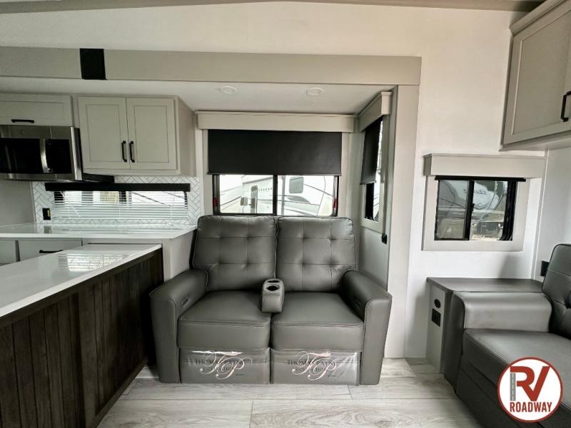 This rear kitchen fifth wheel features ample counter space, an L-shaped counter, plus a spacious pantry and residential refrigerator for food storage. Your crew can relax on the hide-a-bed sofa and power theater seating, or dine at the booth dinette. There is also an entertainment center and fireplace with a hidden pantry behind it for board games and movies. A full bath includes a shower with a seat for added comfort, and the front private bedroom with a king bed slide is sure to bring a great night's rest. You'll find a spacious wardrobe and a dresser to keep your clothes organized, plus washer and dryer prep if you want to add these appliances.