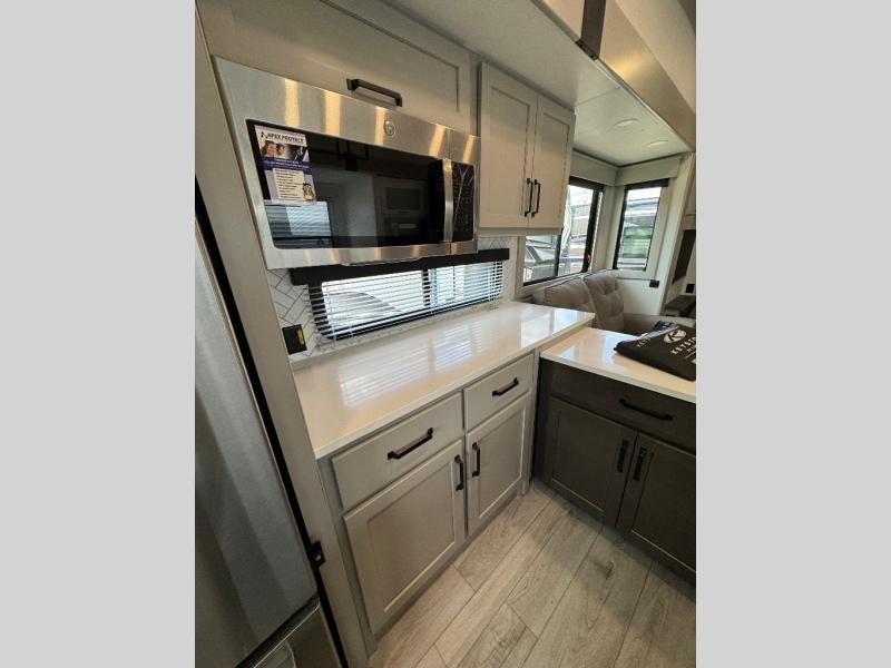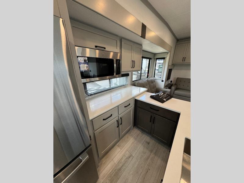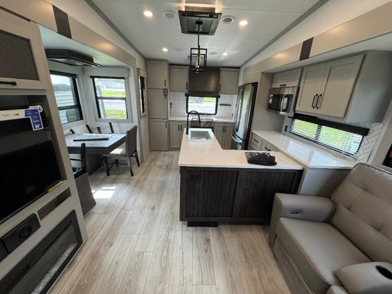 This rear kitchen fifth wheel features ample counter space, an L-shaped counter, plus a spacious pantry and residential refrigerator for food storage. Your crew can relax on the hide-a-bed sofa and power theater seating, or dine at the booth dinette. There is also an entertainment center and fireplace with a hidden pantry behind it for board games and movies. A full bath includes a shower with a seat for added comfort, and the front private bedroom with a king bed slide is sure to bring a great night's rest. You'll find a spacious wardrobe and a dresser to keep your clothes organized, plus washer and dryer prep if you want to add these appliances.