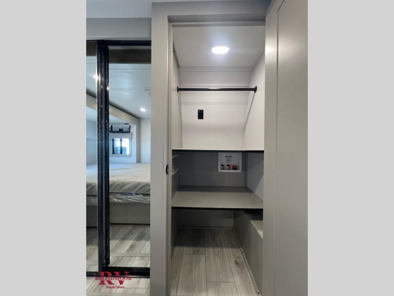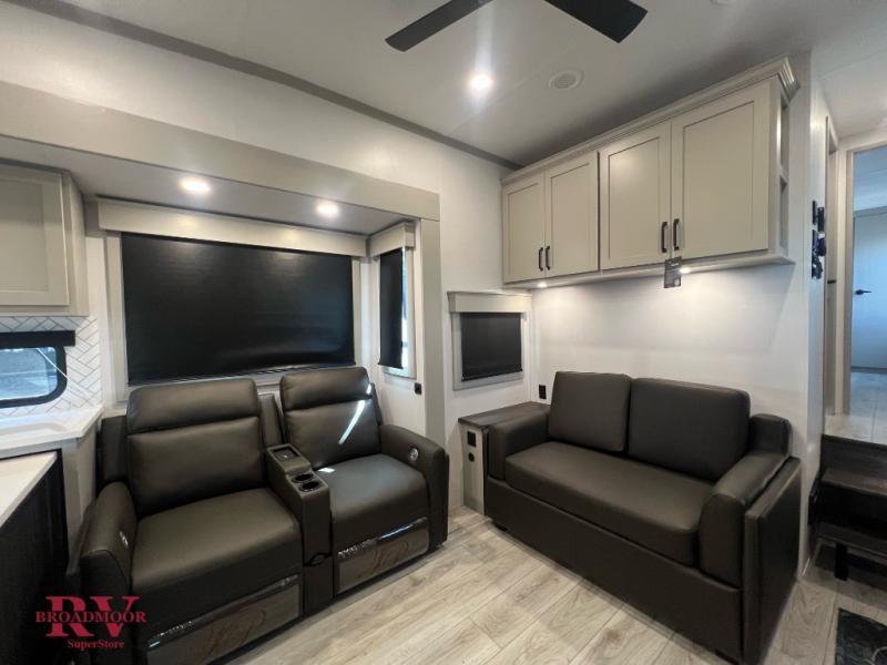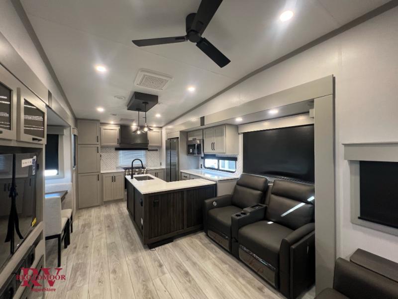 This rear kitchen fifth wheel features ample counter space, an L-shaped counter, plus a spacious pantry and residential refrigerator for food storage. Your crew can relax on the hide-a-bed sofa and power theater seating, or dine at the booth dinette. There is also an entertainment center and fireplace with a hidden pantry behind it for board games and movies. A full bath includes a shower with a seat for added comfort, and the front private bedroom with a king bed slide is sure to bring a great night's rest. You'll find a spacious wardrobe and a dresser to keep your clothes organized, plus washer and dryer prep if you want to add these appliances.