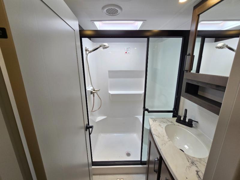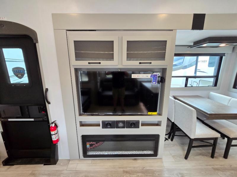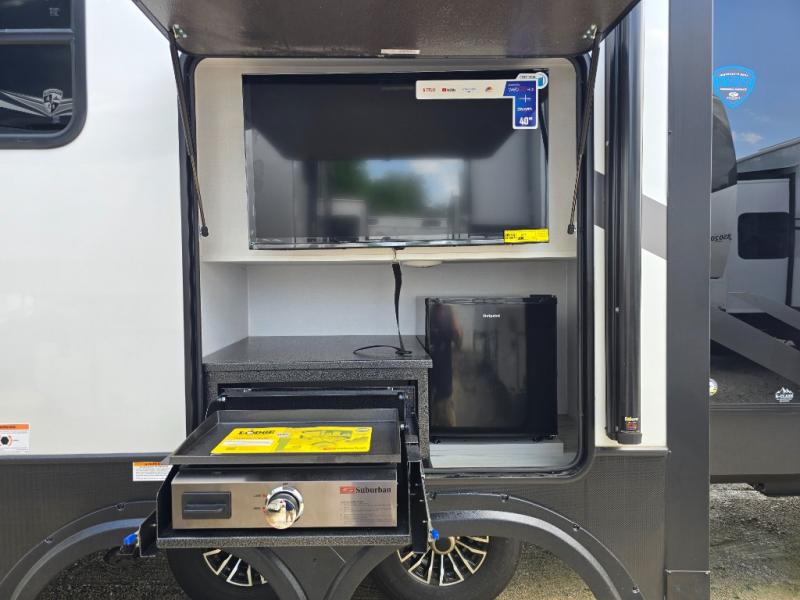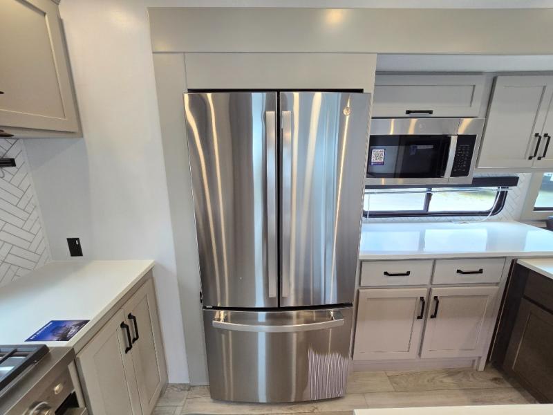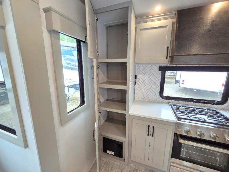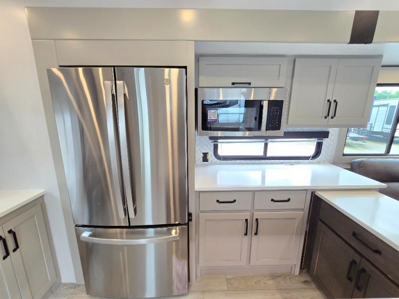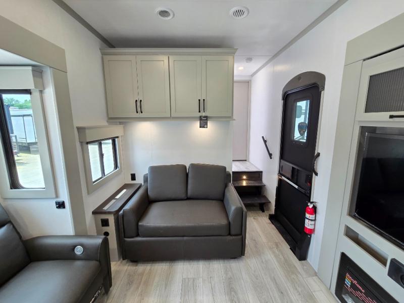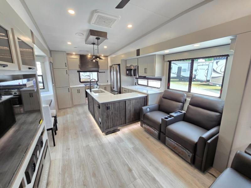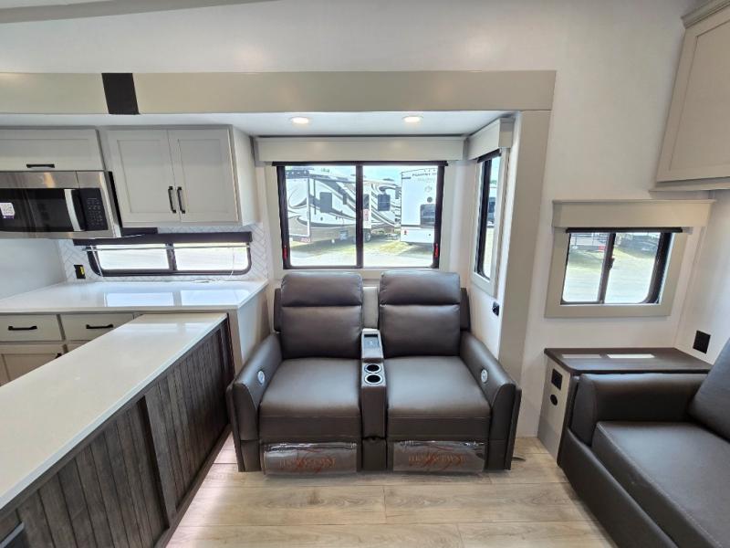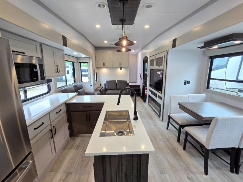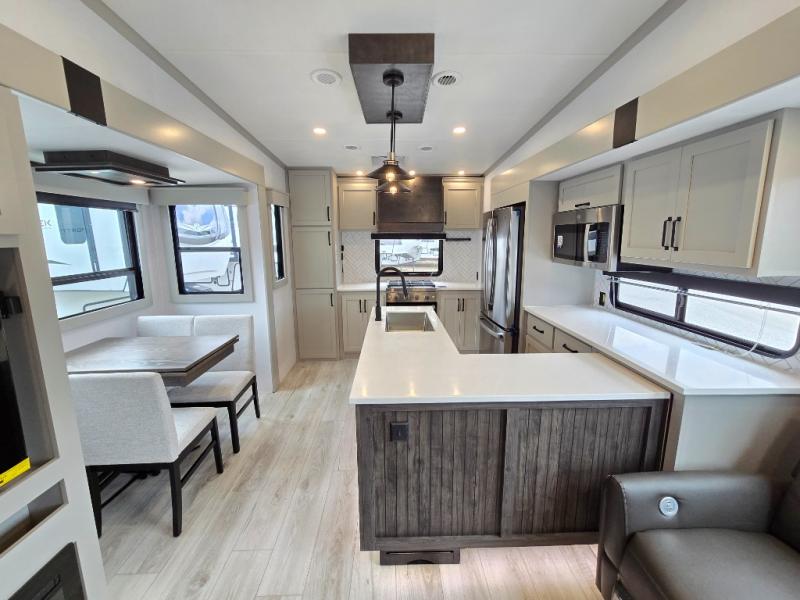 This rear kitchen fifth wheel features ample counter space, an L-shaped counter, plus a spacious pantry and residential refrigerator for food storage. Your crew can relax on the hide-a-bed sofa and power theater seating, or dine at the booth dinette. There is also an entertainment center and fireplace with a hidden pantry behind it for board games and movies. A full bath includes a shower with a seat for added comfort, and the front private bedroom with a king bed slide is sure to bring a great night's rest. You'll find a spacious wardrobe and a dresser to keep your clothes organized, plus washer and dryer prep if you want to add these appliances.