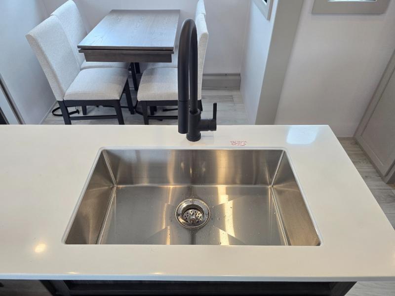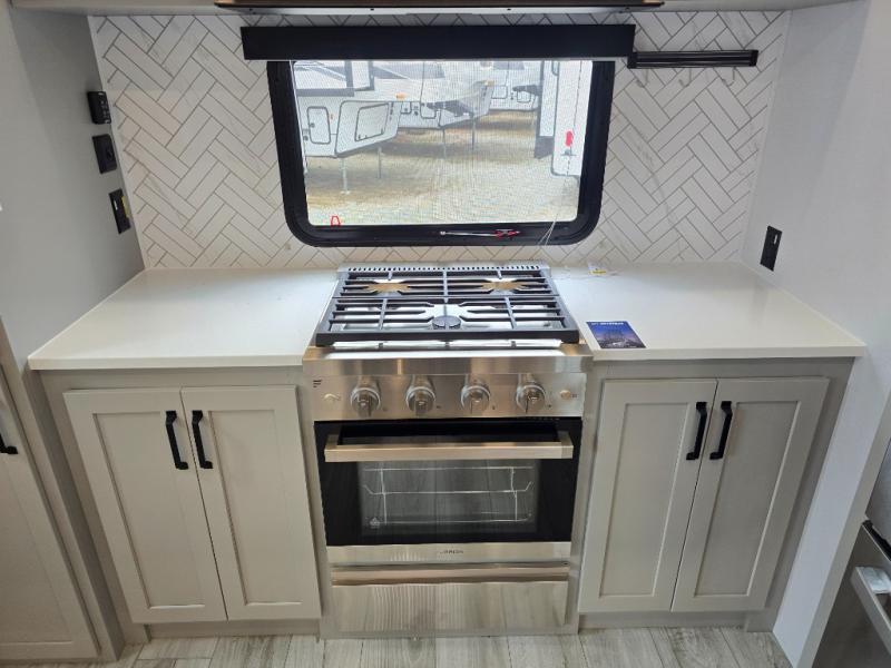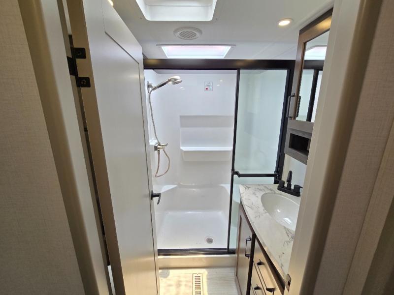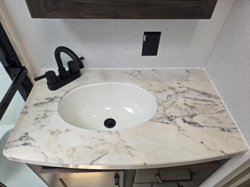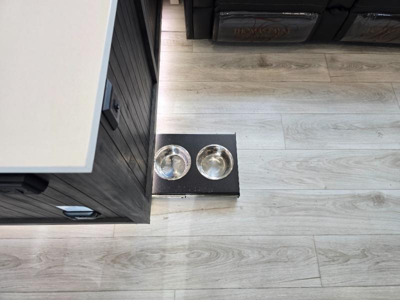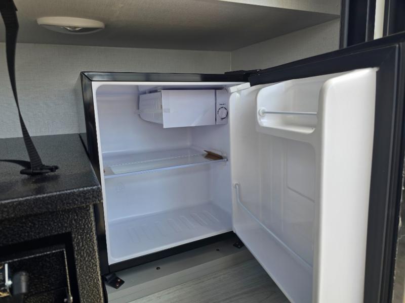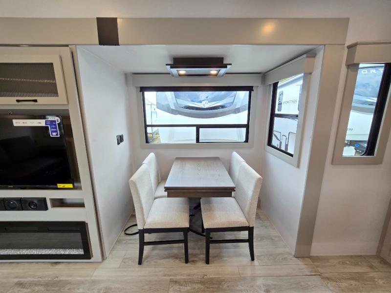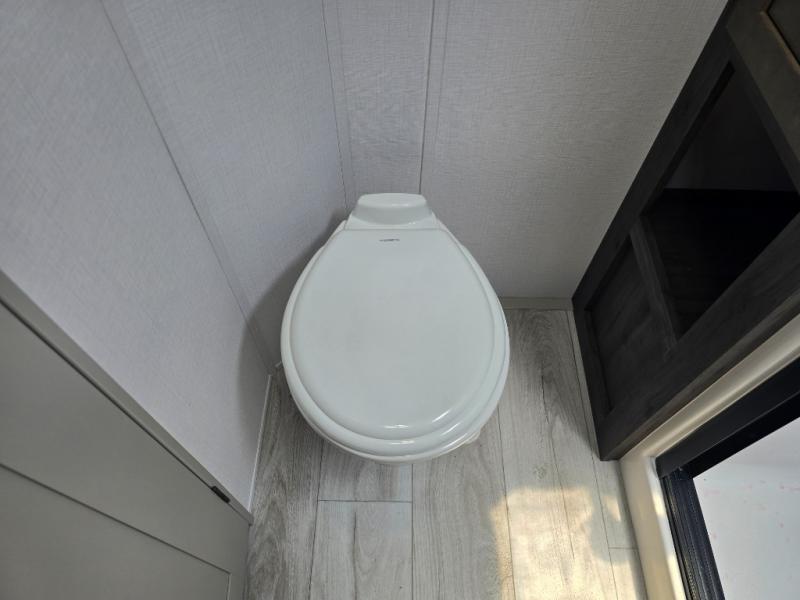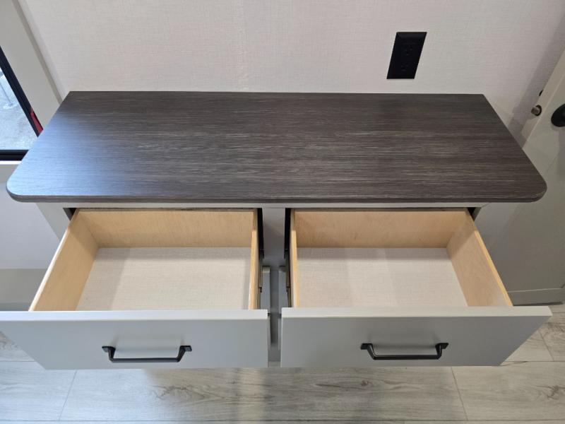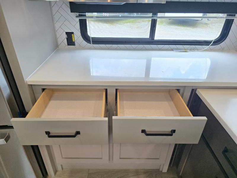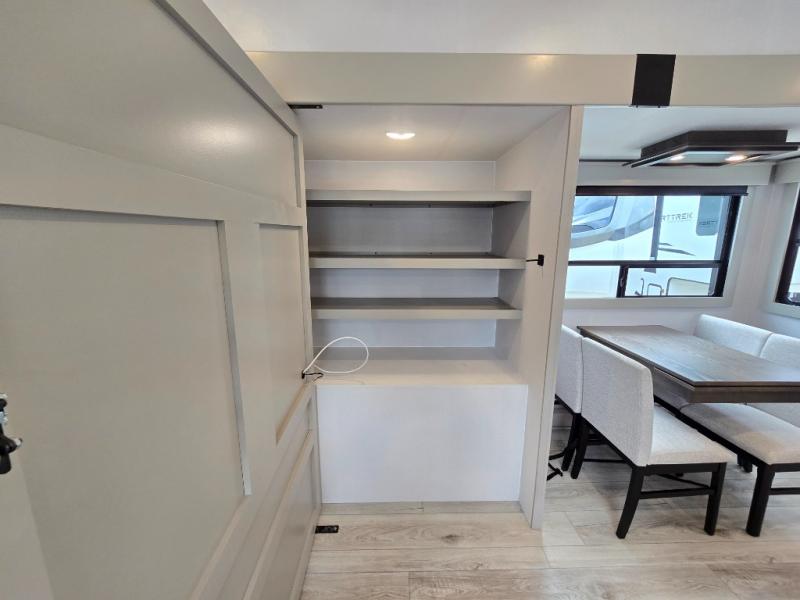 This rear kitchen fifth wheel features ample counter space, an L-shaped counter, plus a spacious pantry and residential refrigerator for food storage. Your crew can relax on the hide-a-bed sofa and power theater seating, or dine at the booth dinette. There is also an entertainment center and fireplace with a hidden pantry behind it for board games and movies. A full bath includes a shower with a seat for added comfort, and the front private bedroom with a king bed slide is sure to bring a great night's rest. You'll find a spacious wardrobe and a dresser to keep your clothes organized, plus washer and dryer prep if you want to add these appliances.