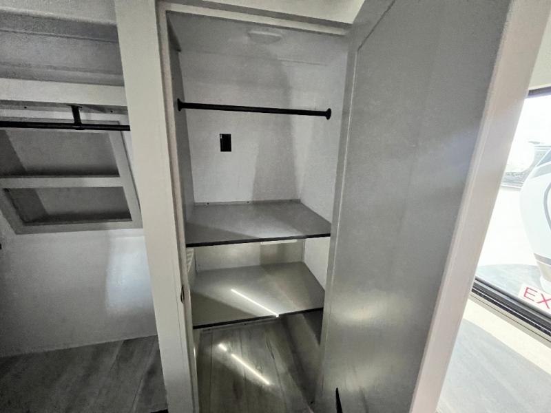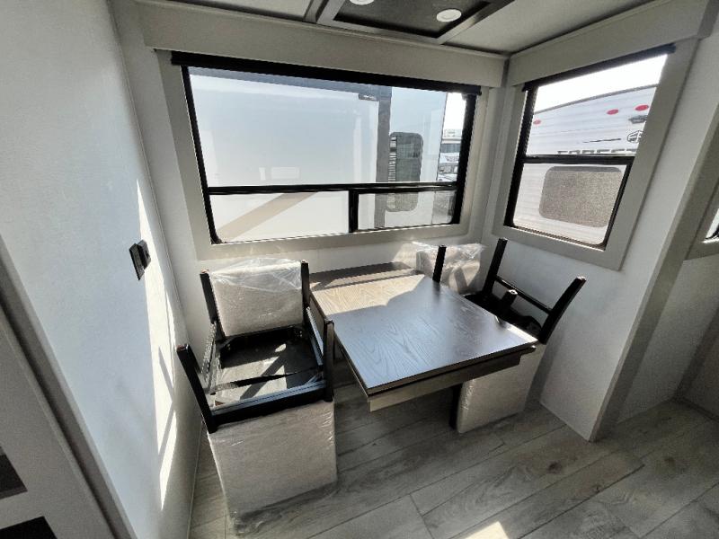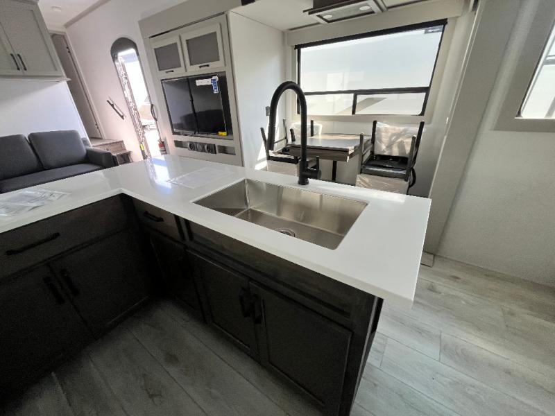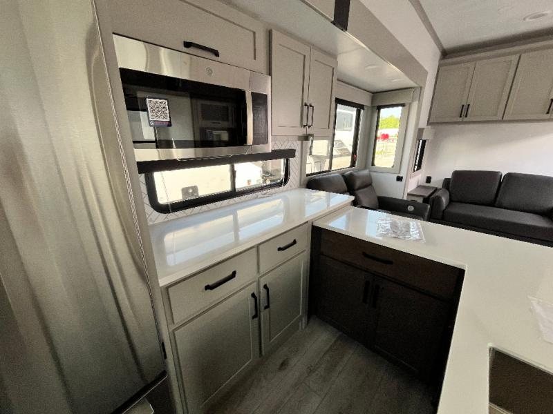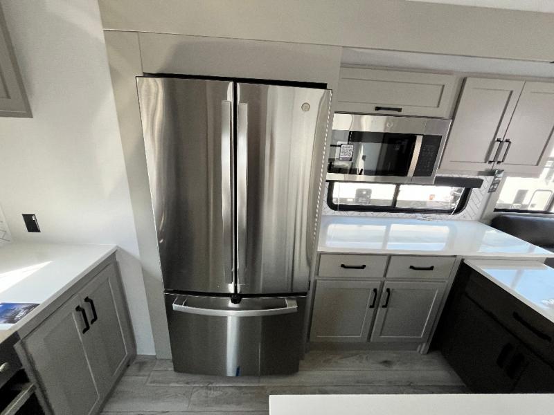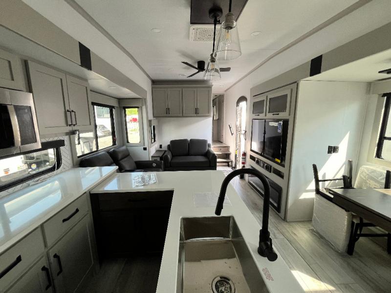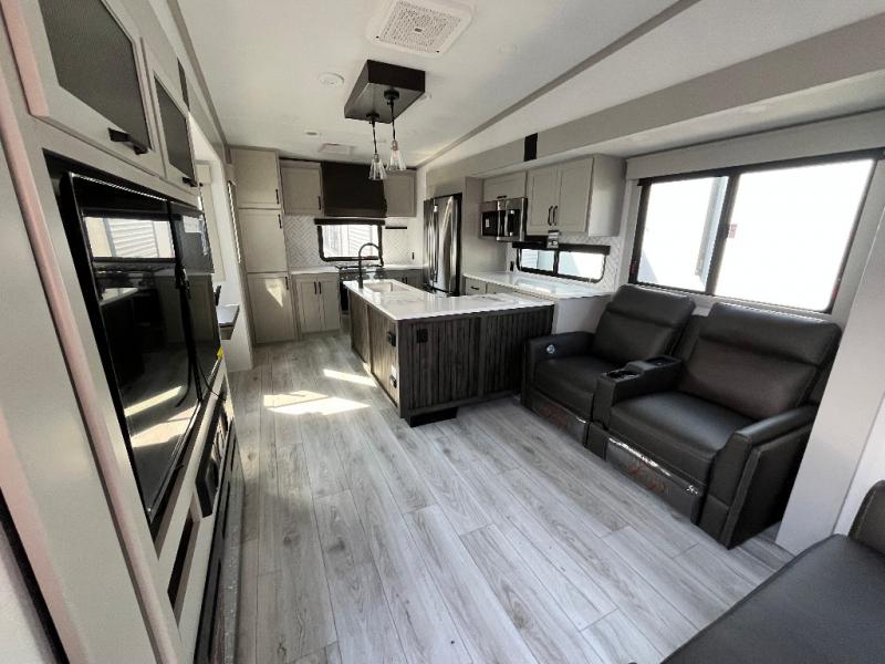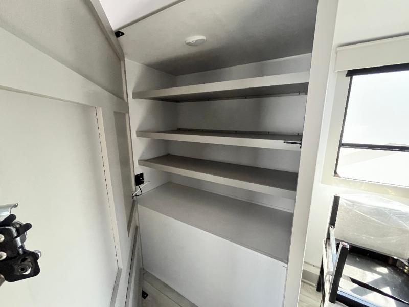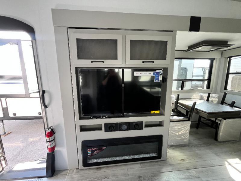 This rear kitchen fifth wheel features ample counter space, an L-shaped counter, plus a spacious pantry and residential refrigerator for food storage. Your crew can relax on the hide-a-bed sofa and power theater seating, or dine at the booth dinette. There is also an entertainment center and fireplace with a hidden pantry behind it for board games and movies. A full bath includes a shower with a seat for added comfort, and the front private bedroom with a king bed slide is sure to bring a great night's rest. You'll find a spacious wardrobe and a dresser to keep your clothes organized, plus washer and dryer prep if you want to add these appliances.