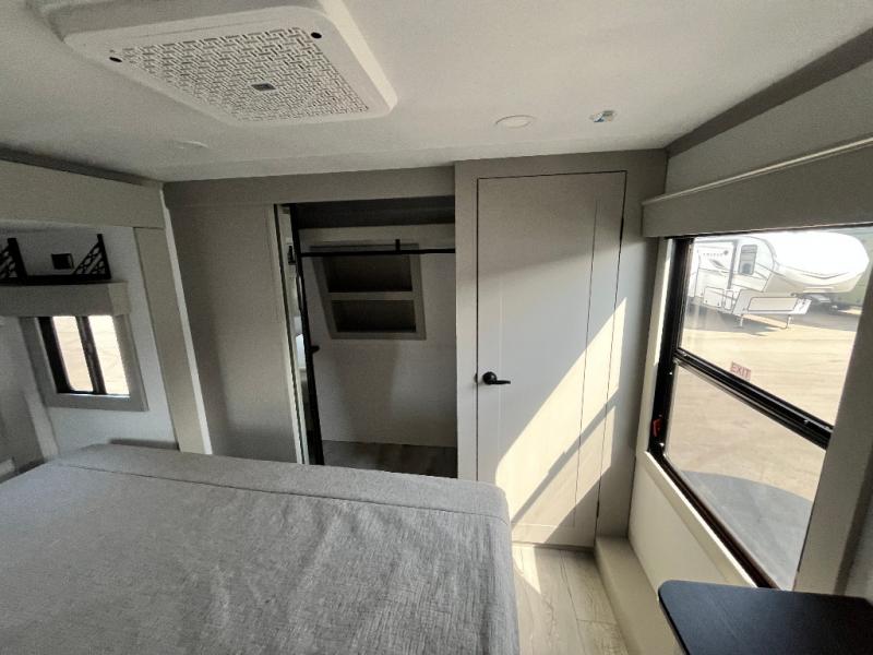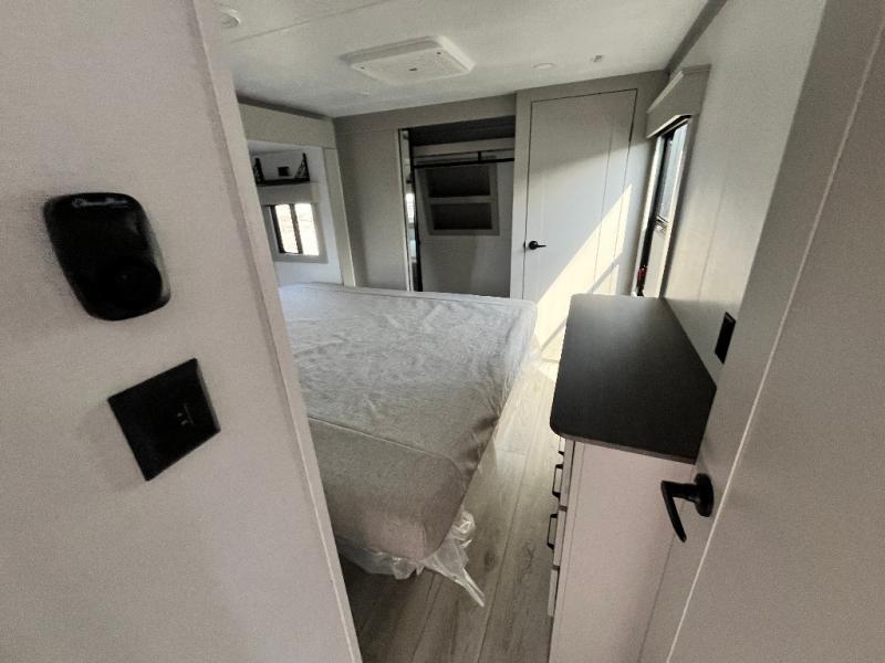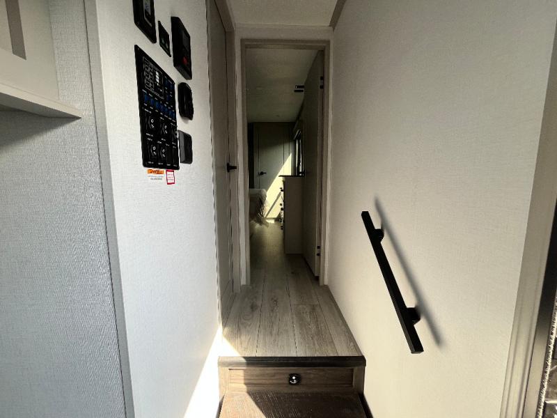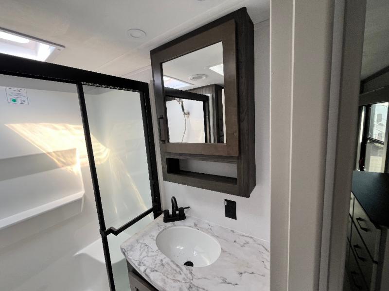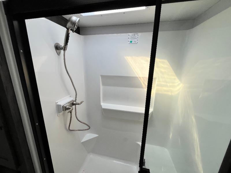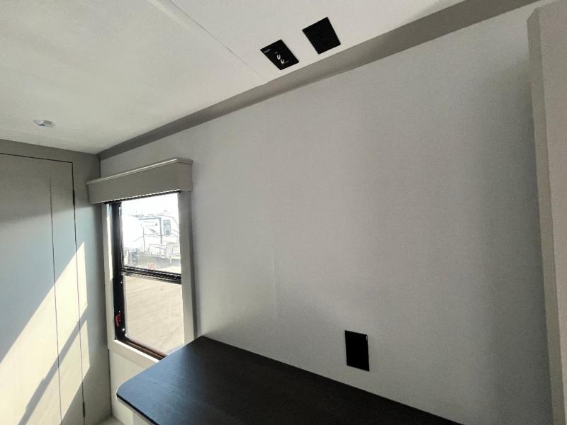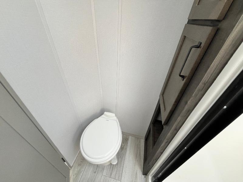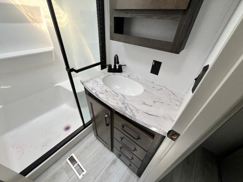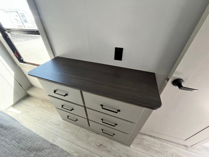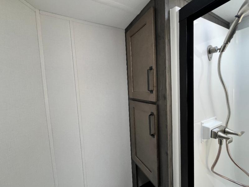 This rear kitchen fifth wheel features ample counter space, an L-shaped counter, plus a spacious pantry and residential refrigerator for food storage. Your crew can relax on the hide-a-bed sofa and power theater seating, or dine at the booth dinette. There is also an entertainment center and fireplace with a hidden pantry behind it for board games and movies. A full bath includes a shower with a seat for added comfort, and the front private bedroom with a king bed slide is sure to bring a great night's rest. You'll find a spacious wardrobe and a dresser to keep your clothes organized, plus washer and dryer prep if you want to add these appliances.
