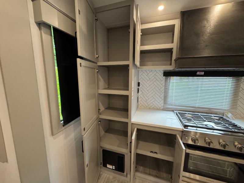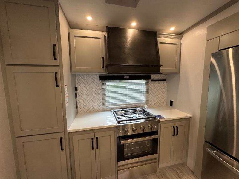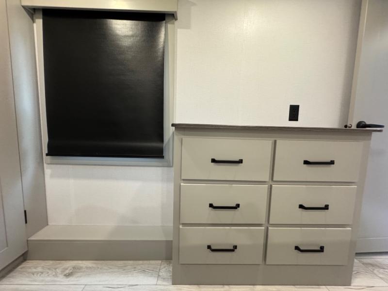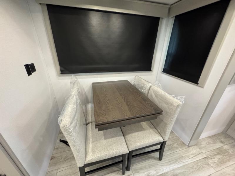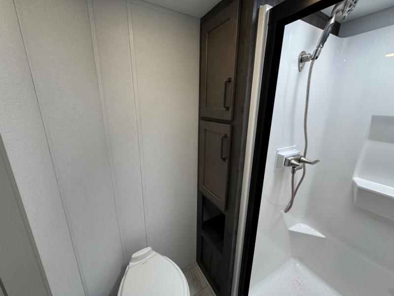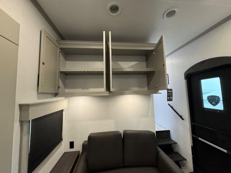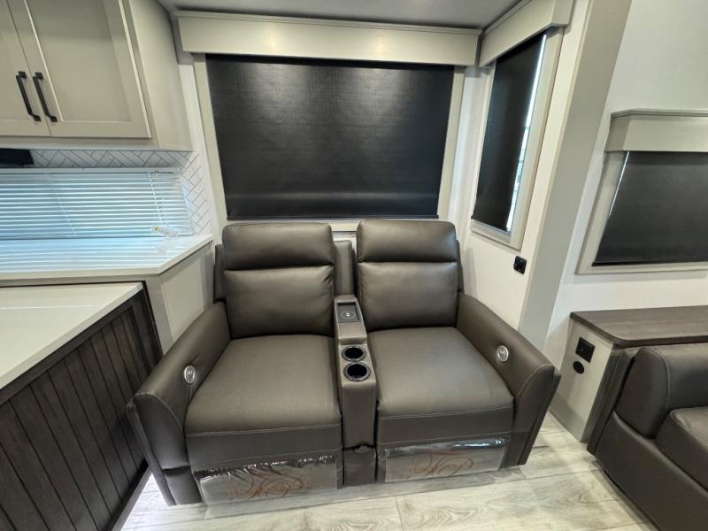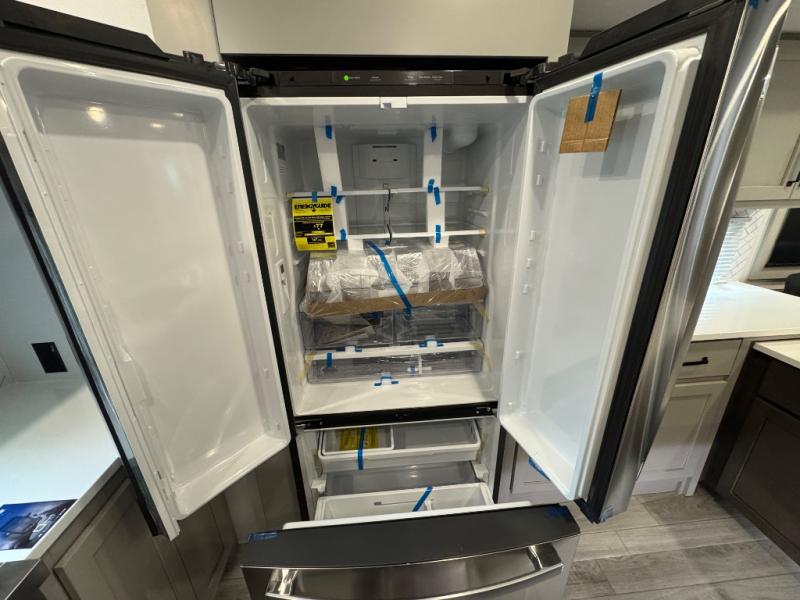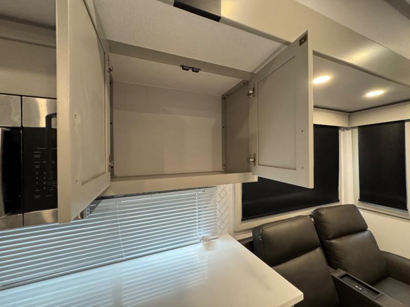 This rear kitchen fifth wheel features ample counter space, an L-shaped counter, plus a spacious pantry and residential refrigerator for food storage. Your crew can relax on the hide-a-bed sofa and power theater seating, or dine at the booth dinette. There is also an entertainment center and fireplace with a hidden pantry behind it for board games and movies. A full bath includes a shower with a seat for added comfort, and the front private bedroom with a king bed slide is sure to bring a great night's rest. You'll find a spacious wardrobe and a dresser to keep your clothes organized, plus washer and dryer prep if you want to add these appliances.