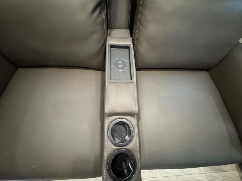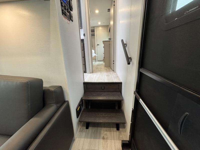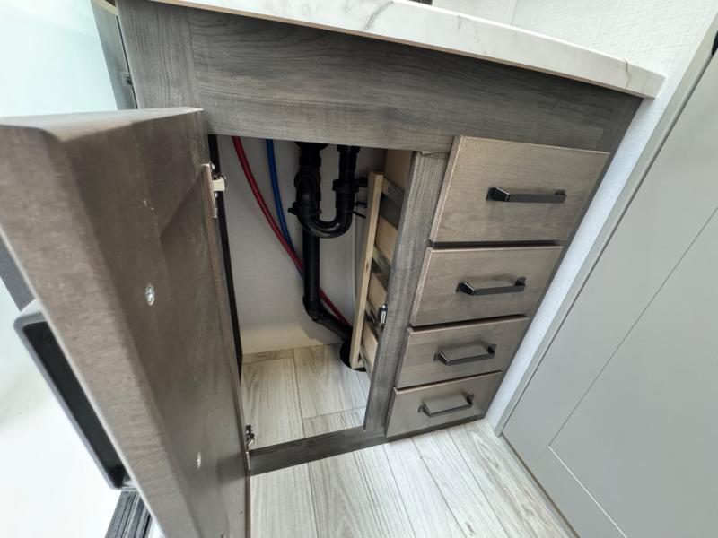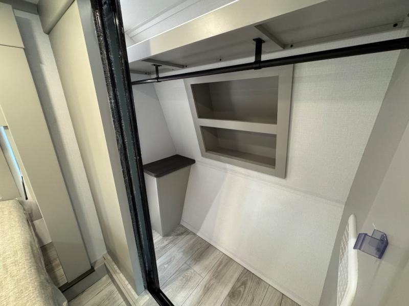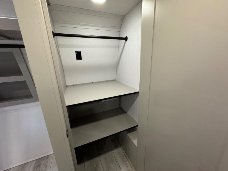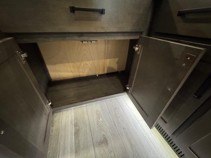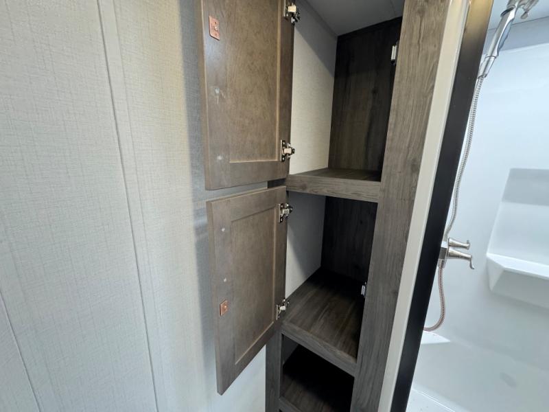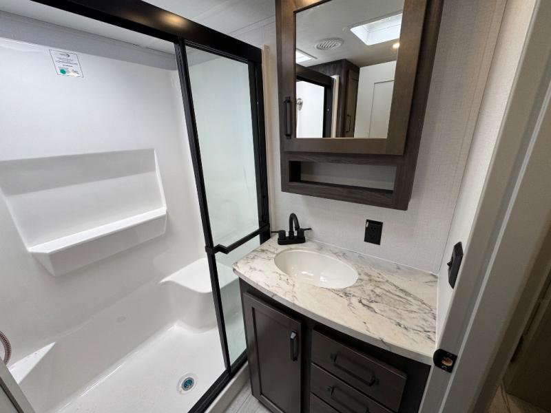 This rear kitchen fifth wheel features ample counter space, an L-shaped counter, plus a spacious pantry and residential refrigerator for food storage. Your crew can relax on the hide-a-bed sofa and power theater seating, or dine at the booth dinette. There is also an entertainment center and fireplace with a hidden pantry behind it for board games and movies. A full bath includes a shower with a seat for added comfort, and the front private bedroom with a king bed slide is sure to bring a great night's rest. You'll find a spacious wardrobe and a dresser to keep your clothes organized, plus washer and dryer prep if you want to add these appliances.