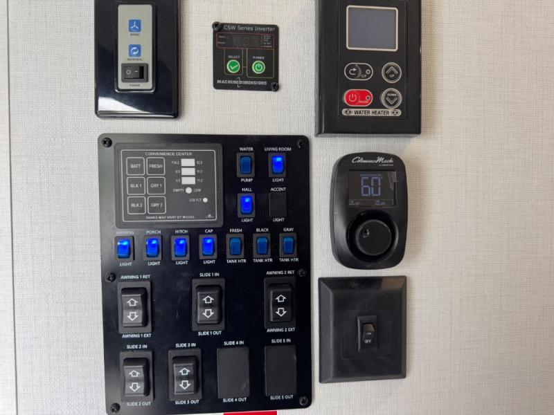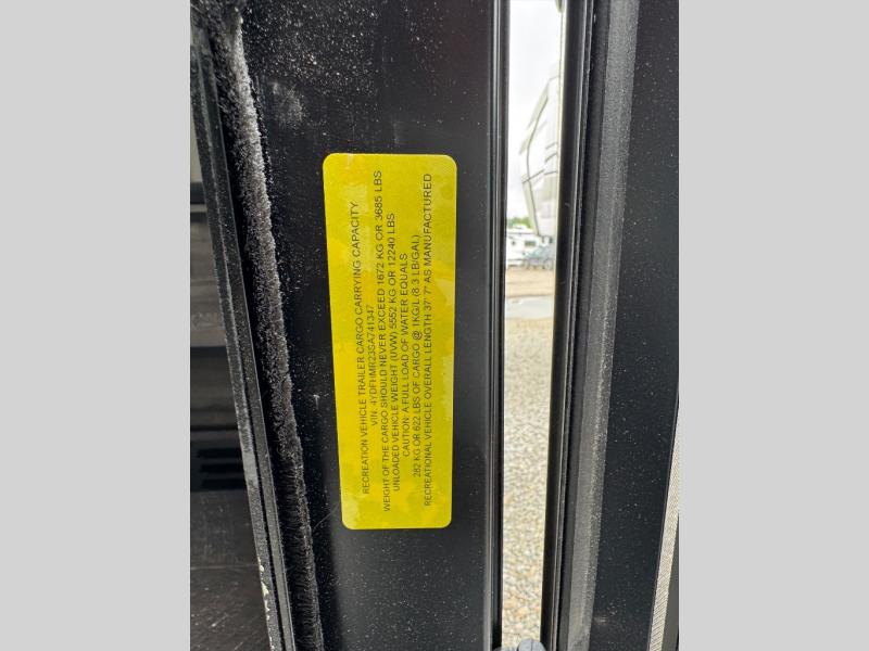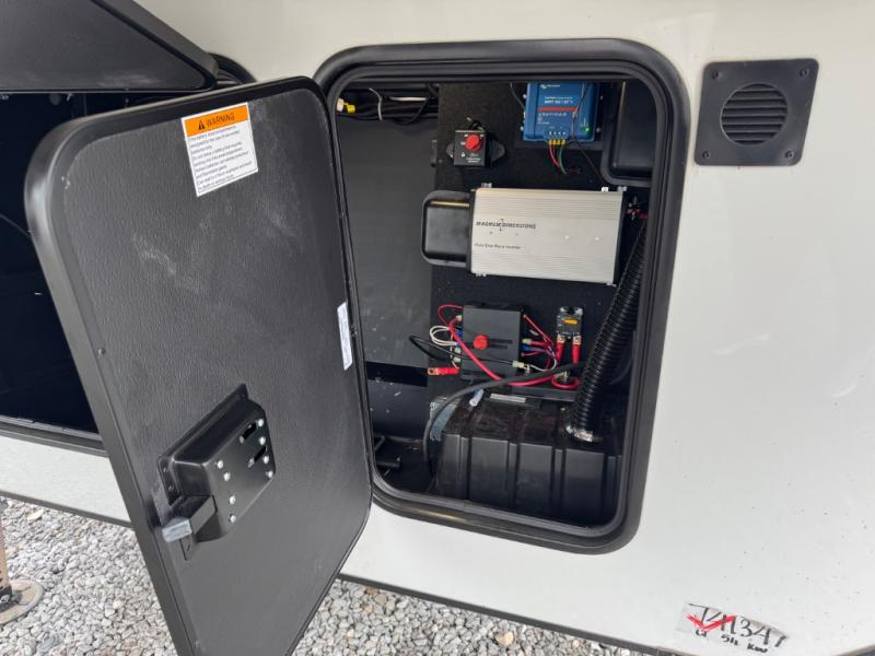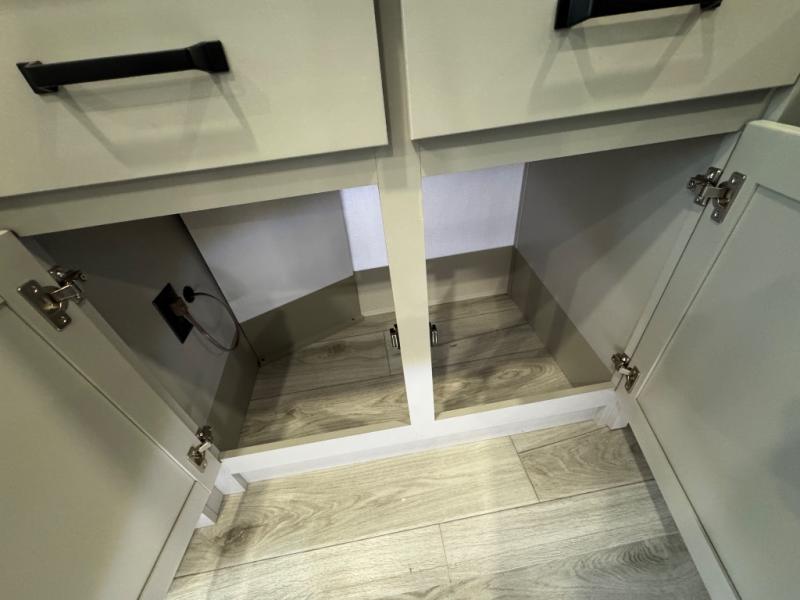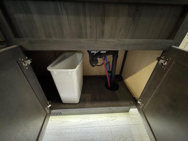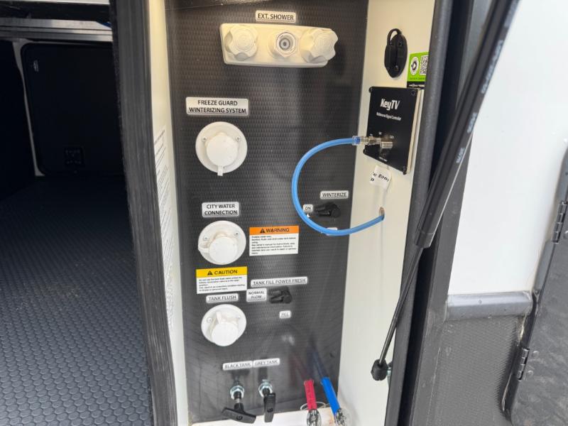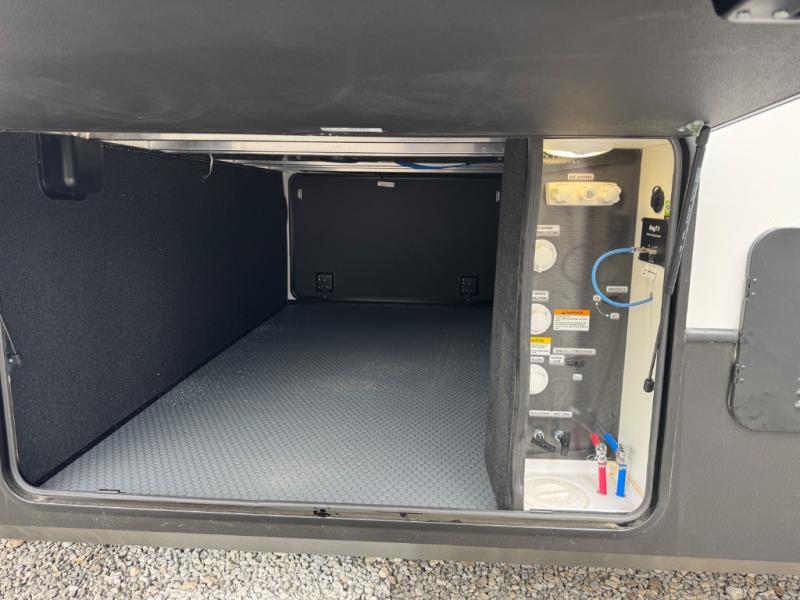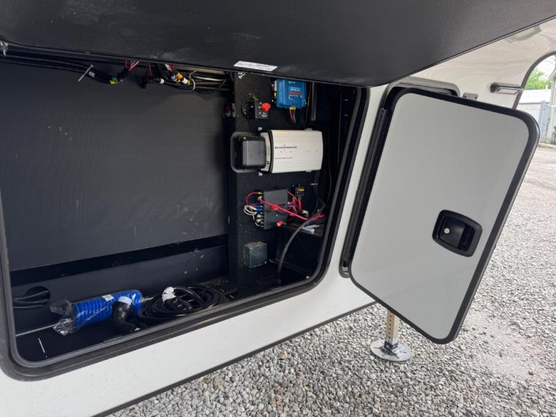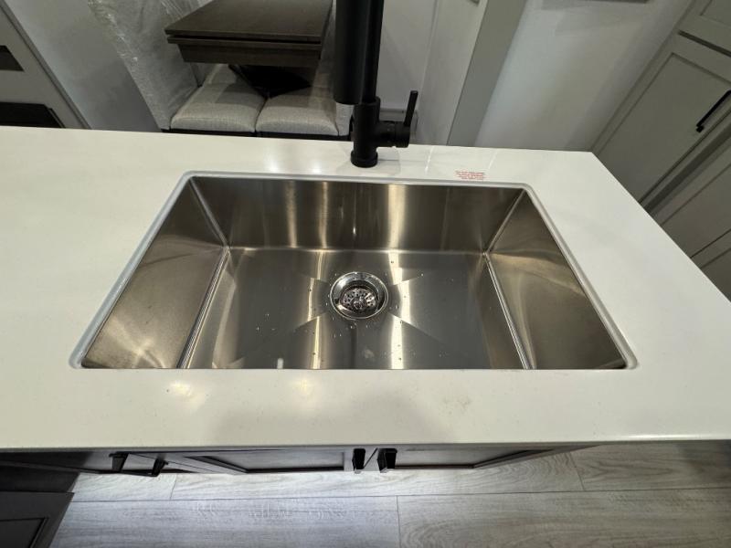 This rear kitchen fifth wheel features ample counter space, an L-shaped counter, plus a spacious pantry and residential refrigerator for food storage. Your crew can relax on the hide-a-bed sofa and power theater seating, or dine at the booth dinette. There is also an entertainment center and fireplace with a hidden pantry behind it for board games and movies. A full bath includes a shower with a seat for added comfort, and the front private bedroom with a king bed slide is sure to bring a great night's rest. You'll find a spacious wardrobe and a dresser to keep your clothes organized, plus washer and dryer prep if you want to add these appliances.