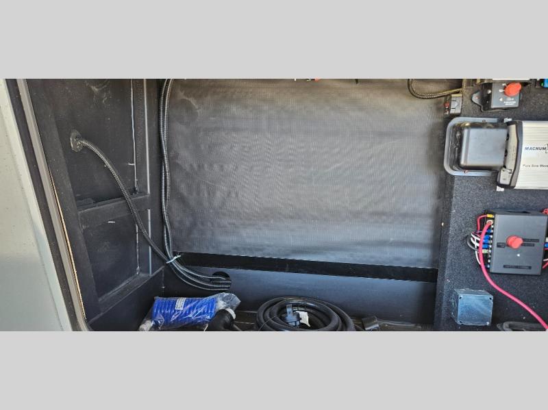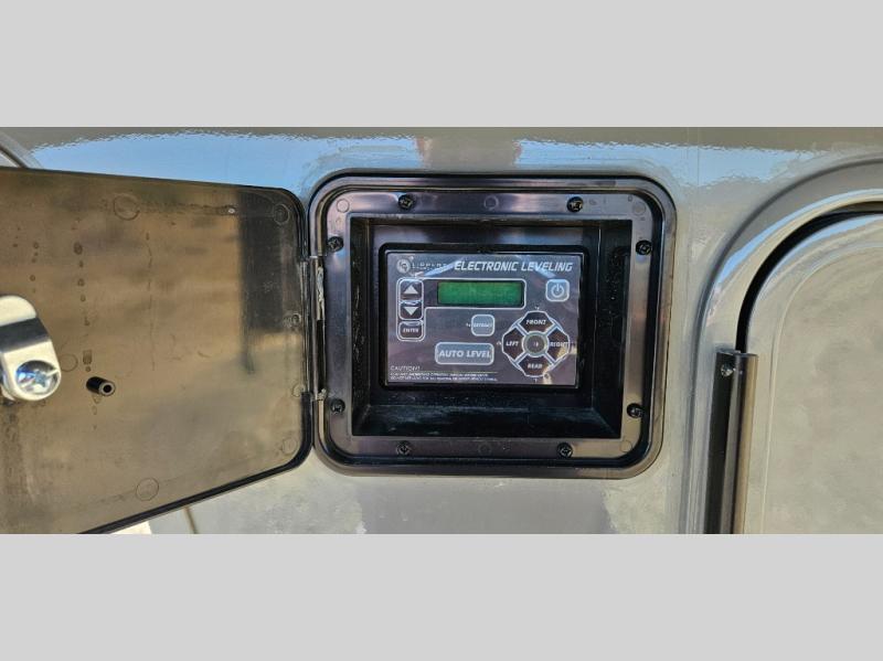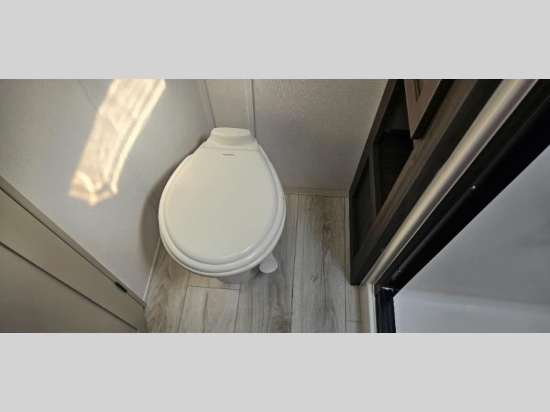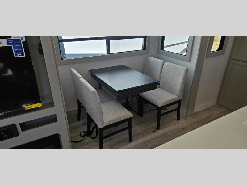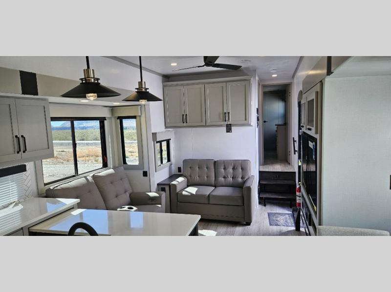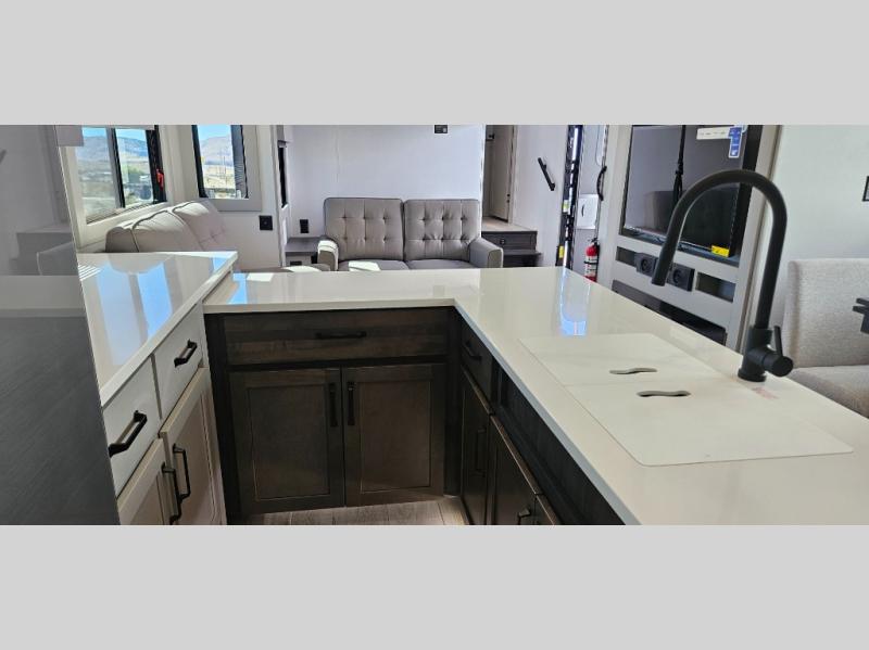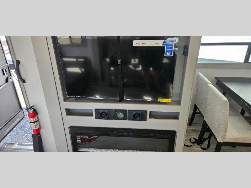 This rear kitchen fifth wheel features ample counter space, an L-shaped counter, plus a spacious pantry and residential refrigerator for food storage. Your crew can relax on the hide-a-bed sofa and power theater seating, or dine at the booth dinette. There is also an entertainment center and fireplace with a hidden pantry behind it for board games and movies. A full bath includes a shower with a seat for added comfort, and the front private bedroom with a king bed slide is sure to bring a great night's rest. You'll find a spacious wardrobe and a dresser to keep your clothes organized, plus washer and dryer prep if you want to add these appliances.