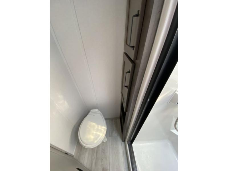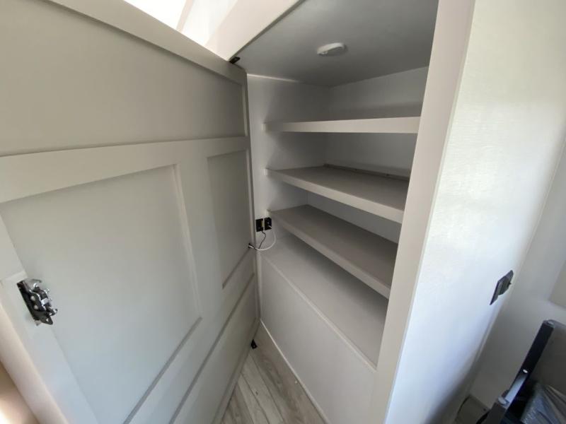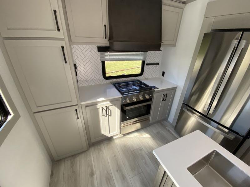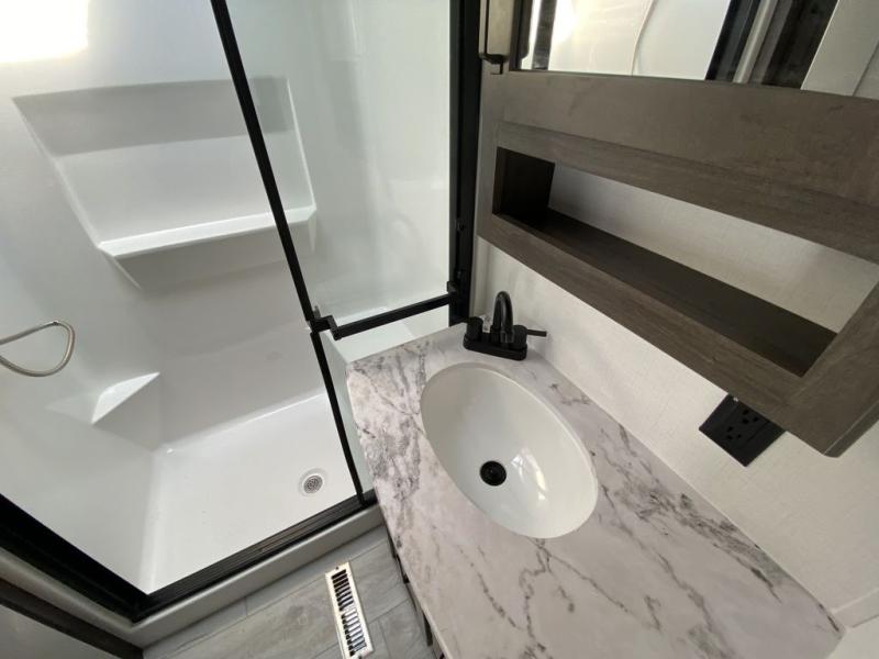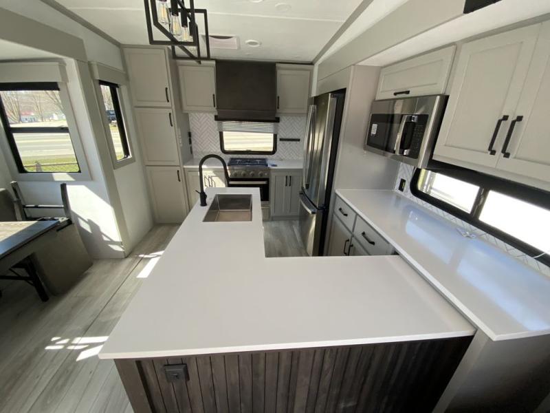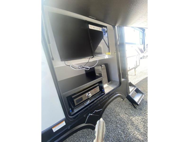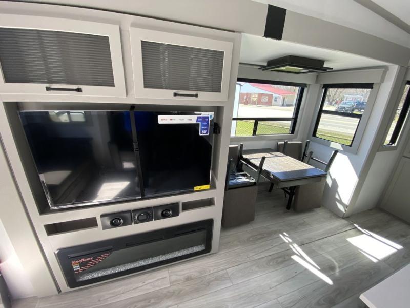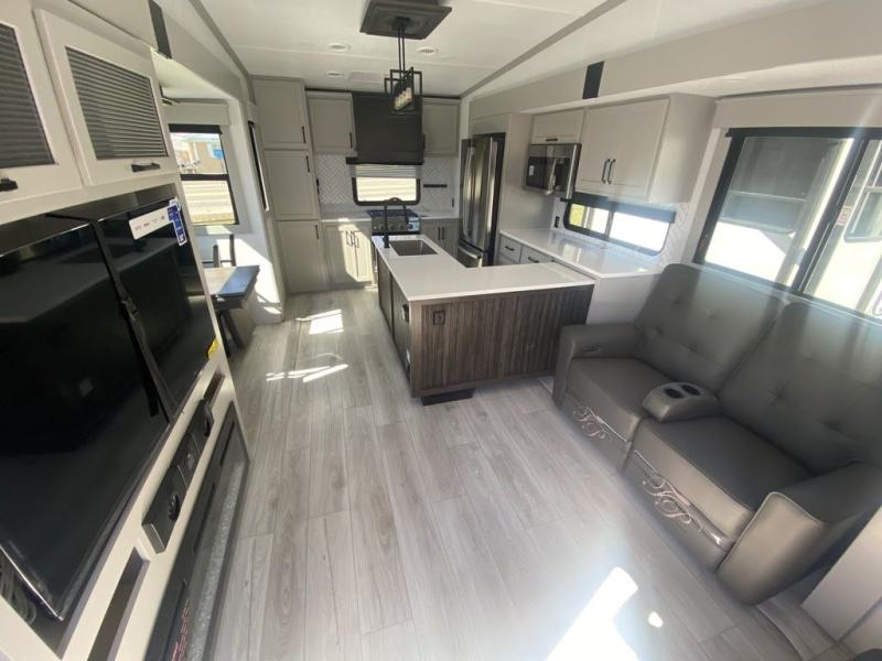 This rear kitchen fifth wheel features ample counter space, an L-shaped counter, plus a spacious pantry and residential refrigerator for food storage. Your crew can relax on the hide-a-bed sofa and power theater seating, or dine at the booth dinette. There is also an entertainment center and fireplace with a hidden pantry behind it for board games and movies. A full bath includes a shower with a seat for added comfort, and the front private bedroom with a king bed slide is sure to bring a great night's rest. You'll find a spacious wardrobe and a dresser to keep your clothes organized, plus washer and dryer prep if you want to add these appliances.
