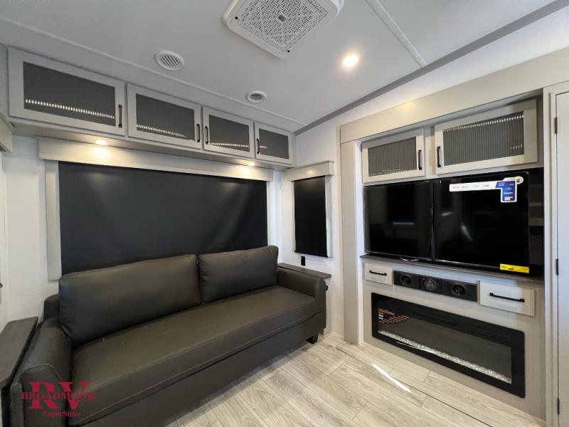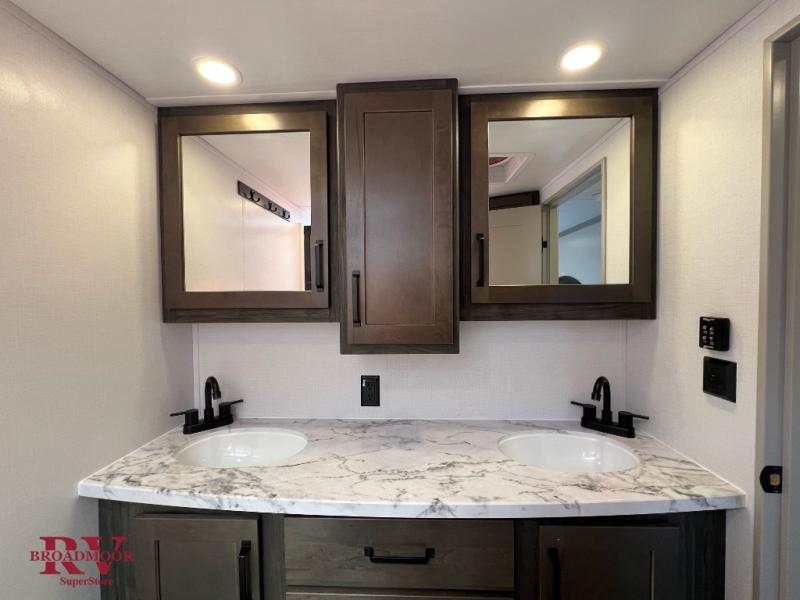 You can live life to its fullest in this Montana High Country fifth wheel! There are opposing slides in the main living area for more space, and the fireplace adds coziness to this space. Spend time relaxing on the power theater seating, and use the hide-a-bed sofa as an extra bed when you have friends turn into overnight guests. The pantry will help you keep your snacks stored away, and full bathroom has a dual-sink vanity and 48" x 30" shower with seat for a convenient way to get clean. The front bedroom has a king bed slide with storage underneath the bed, and the wardrobe and dresser provide more storage space.