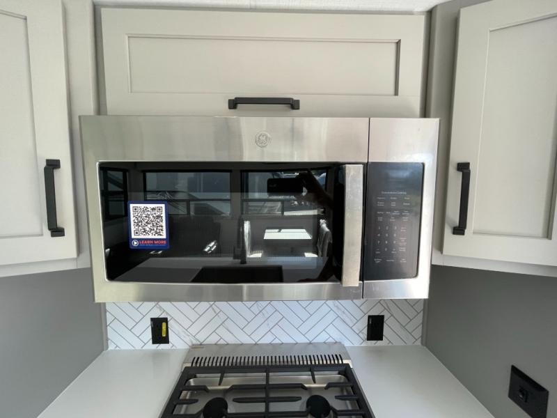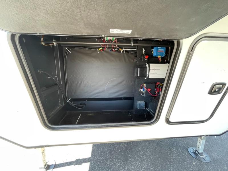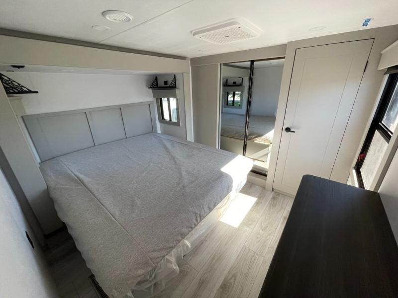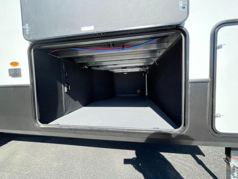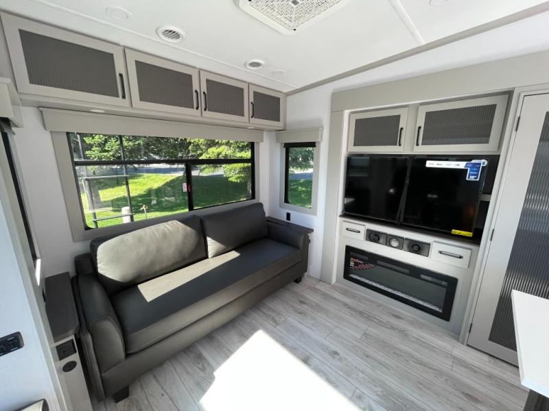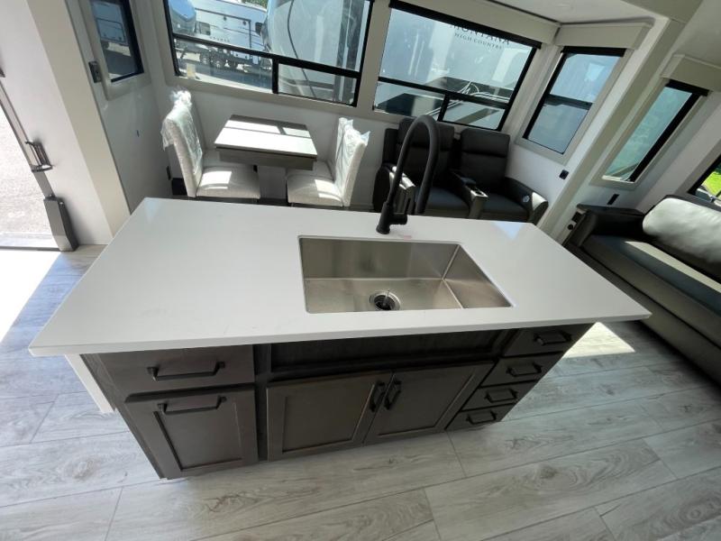 You can live life to its fullest in this Montana High Country fifth wheel! There are opposing slides in the main living area for more space, and the fireplace adds coziness to this space. Spend time relaxing on the power theater seating, and use the hide-a-bed sofa as an extra bed when you have friends turn into overnight guests. The pantry will help you keep your snacks stored away, and full bathroom has a dual-sink vanity and 48" x 30" shower with seat for a convenient way to get clean. The front bedroom has a king bed slide with storage underneath the bed, and the wardrobe and dresser provide more storage space.
