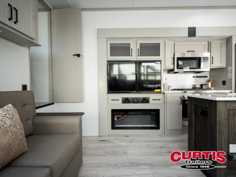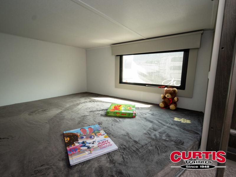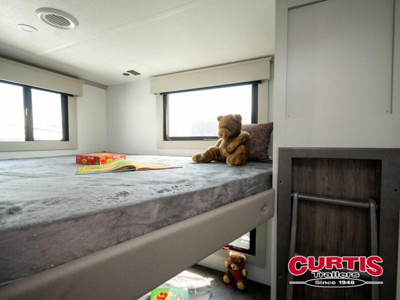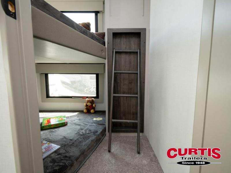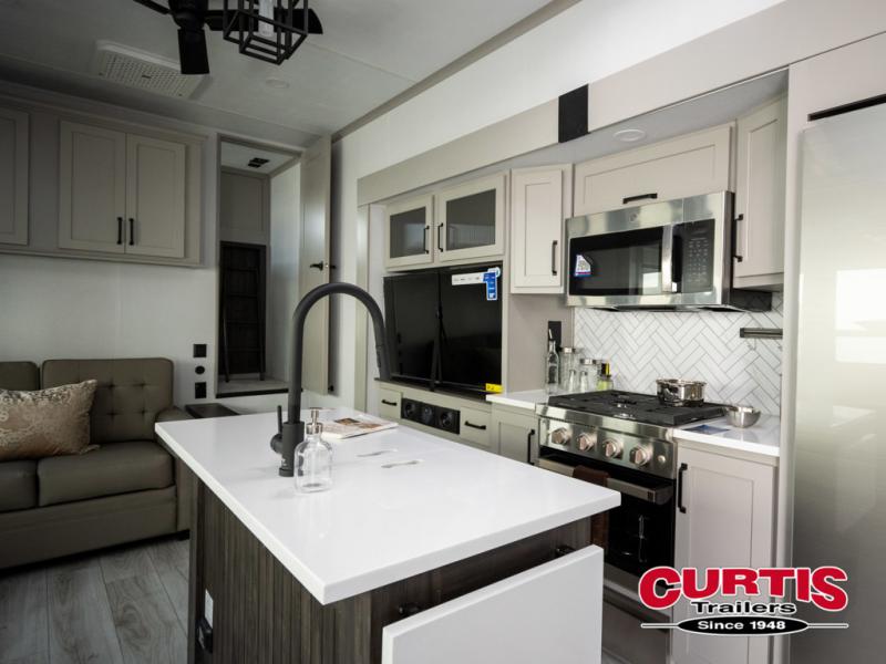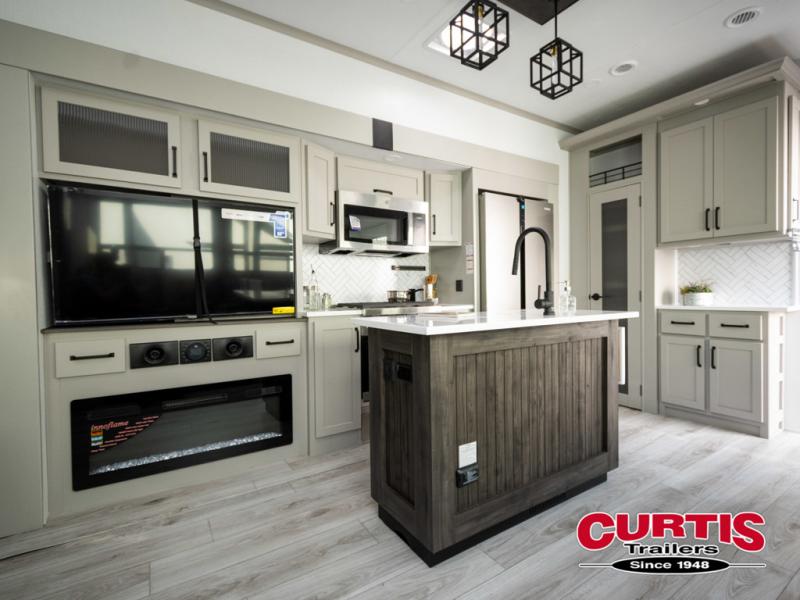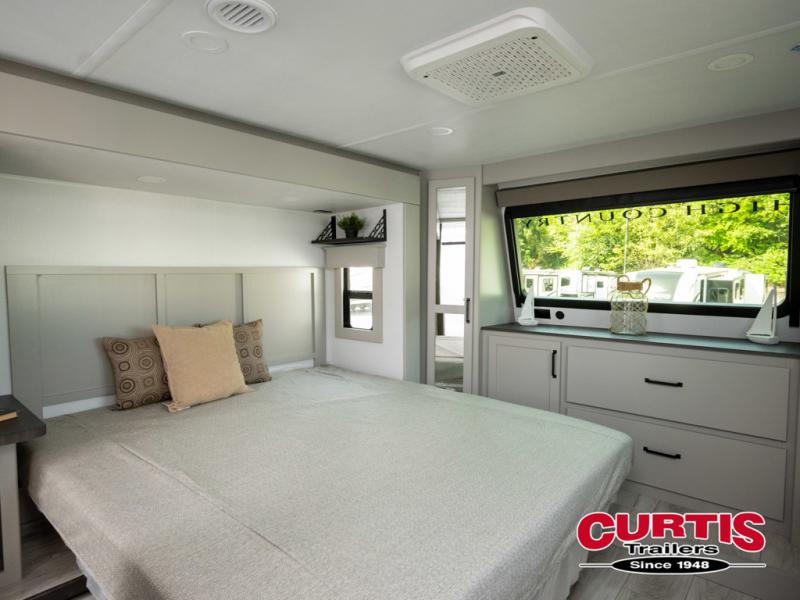 You will be living in true luxury with this Montana High Country fifth wheel! First of all, you'll have your own master suite up at the front which happens to have a Lippert duo memory foam mattress for great comfort. The bedroom also has great storage space for your clothes with the two dressers and two wardrobes. Second, there is a great sleeping area in the back for the extra travelers you have with you. The RV queen-size bunks allow four adults to sleep comfortably each night in this area, and there is even a hide-a-bed sofa next to the bunks for yet another set of sleepy campers. The power theater seating sits directly across from the fireplace and 50" LCD TV, and the kitchen island has a countertop extension for even more prep space in the kitchen.