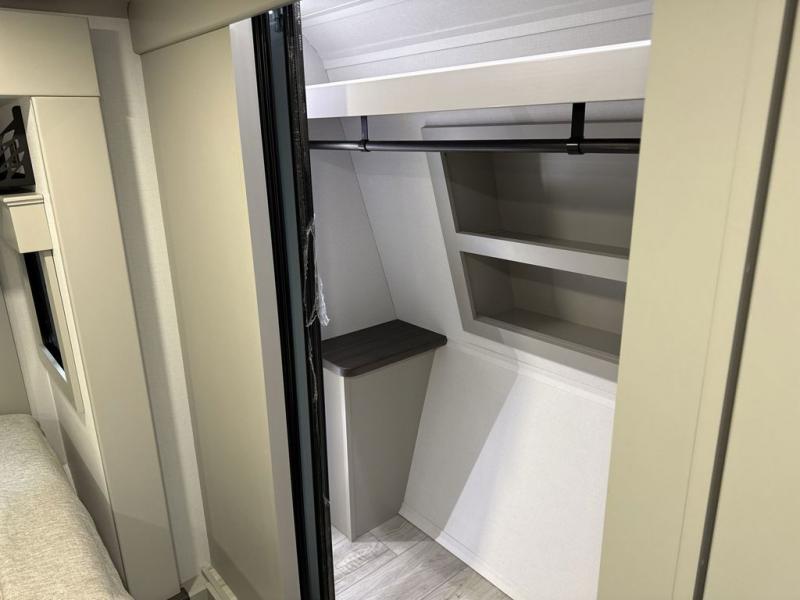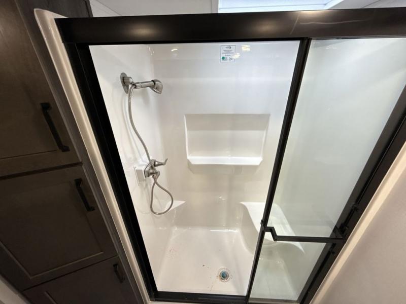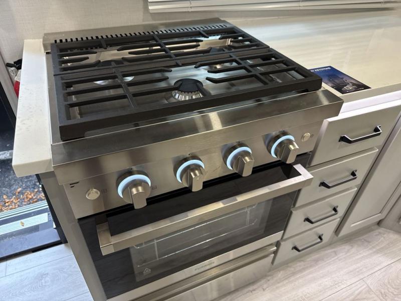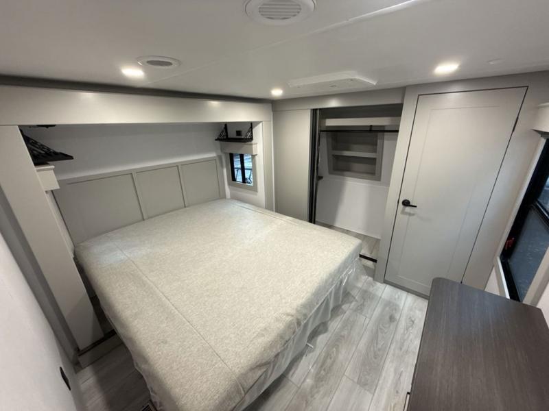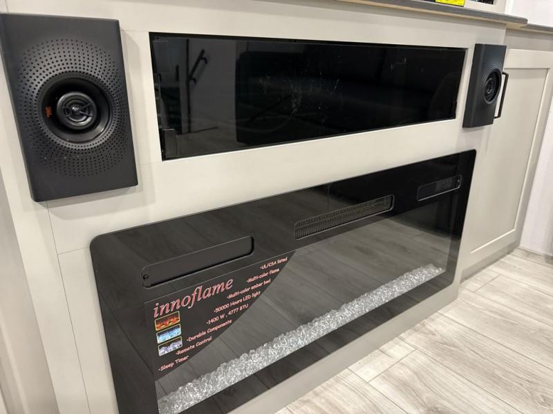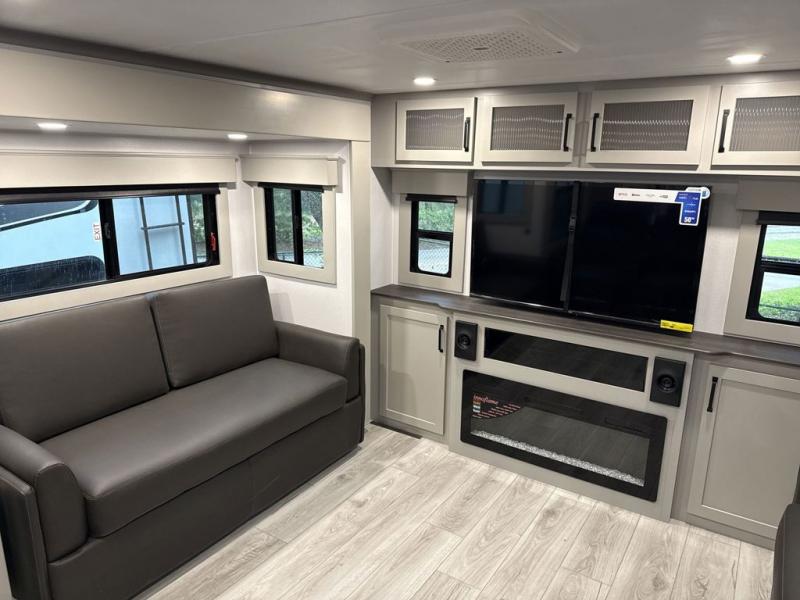 You'll be able to love this Montana High Country fifth wheel for years and years and years! The separated living room in the back feels just like your living room at home with its power theater seating, two hide-a-bed sofas, fireplace, and 50" LCD TV. The kitchen is also very residential with its three-burner range with glass top, residential microwave, residential refrigerator, pantry, and coffee station. When you enter this unit, there is a coat closet for you to place your boots and hats in, and for more clothing storage, just use the under-bed storage up in the private bedroom.