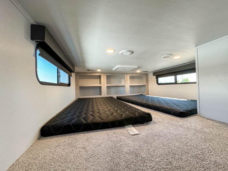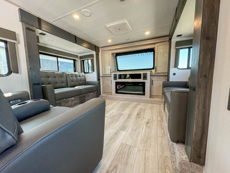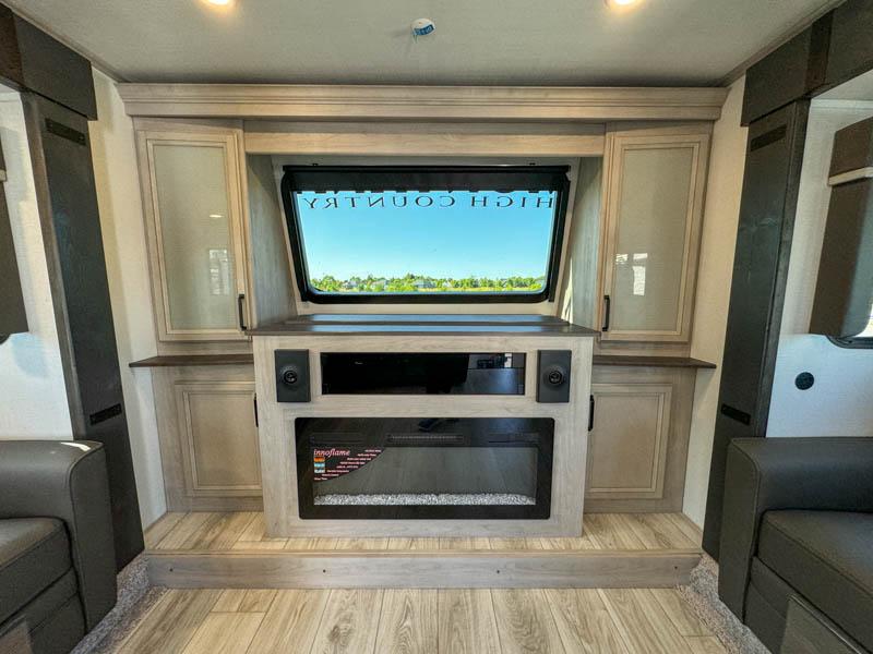 Include all of your favorite people on your next adventure in this Montana High Country fifth wheel! Not only is there a rear private bedroom with a king-size bed for you, but there is also a loft above with stairs that take you to the bunk mats. Now your kids will have their own space too. You can even host a few other travelers up front in the separate living room on the two hide-a-bed sofas. This area will be perfect for cozy sleeping because of the fireplace, and you can even watch a movie as you drift off to sleep because of the 50" LCD TV too. The full bathroom has a pivot-hinge door and a 48" x 30" shower with seat, and the kitchen has a breakfast bar that you can sit at to eat your cereal each morning