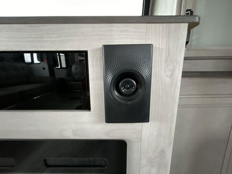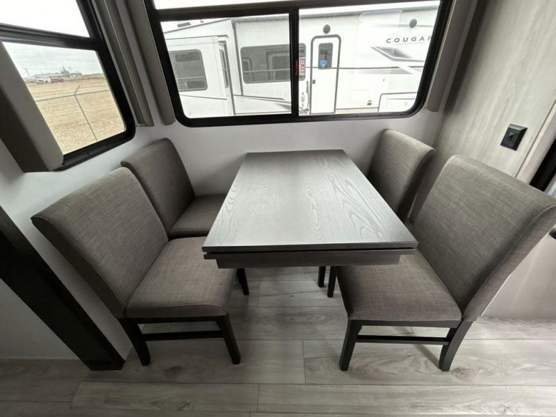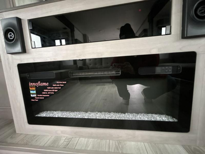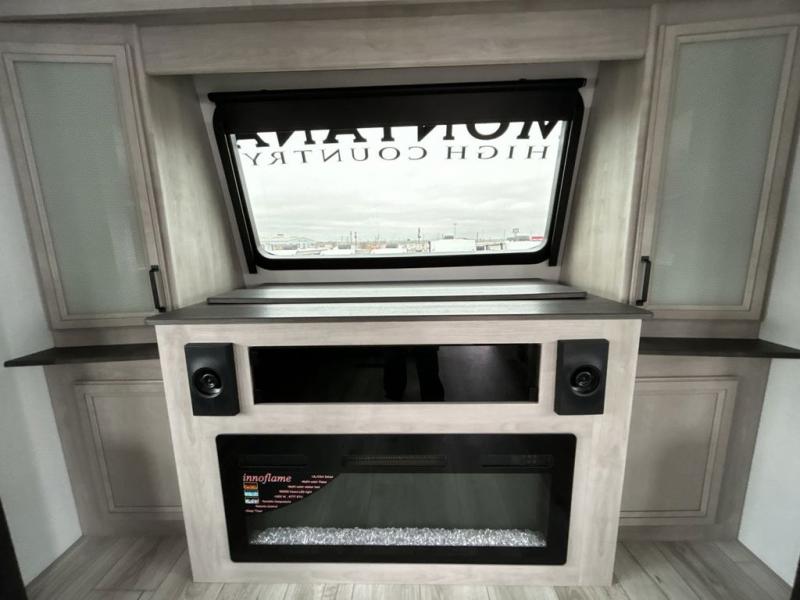 Include all of your favorite people on your next adventure in this Montana High Country fifth wheel! Not only is there a rear private bedroom with a king-size bed for you, but there is also a loft above with stairs that take you to the bunk mats. Now your kids will have their own space too. You can even host a few other travelers up front in the separate living room on the two hide-a-bed sofas. This area will be perfect for cozy sleeping because of the fireplace, and you can even watch a movie as you drift off to sleep because of the 50" LCD TV too. The full bathroom has a pivot-hinge door and a 48" x 30" shower with seat, and the kitchen has a breakfast bar that you can sit at to eat your cereal each morning