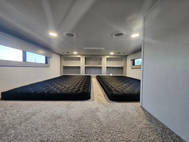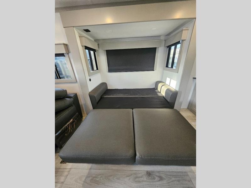 Include all of your favorite people on your next adventure in this Montana High Country fifth wheel! Not only is there a rear private bedroom with a king-size bed for you, but there is also a loft above with stairs that take you to the bunk mats. Now your kids will have their own space too. You can even host a few other travelers up front in the separate living room on the two hide-a-bed sofas. This area will be perfect for cozy sleeping because of the fireplace, and you can even watch a movie as you drift off to sleep because of the 50" LCD TV too. The full bathroom has a pivot-hinge door and a 48" x 30" shower with seat, and the kitchen has a breakfast bar that you can sit at to eat your cereal each morning