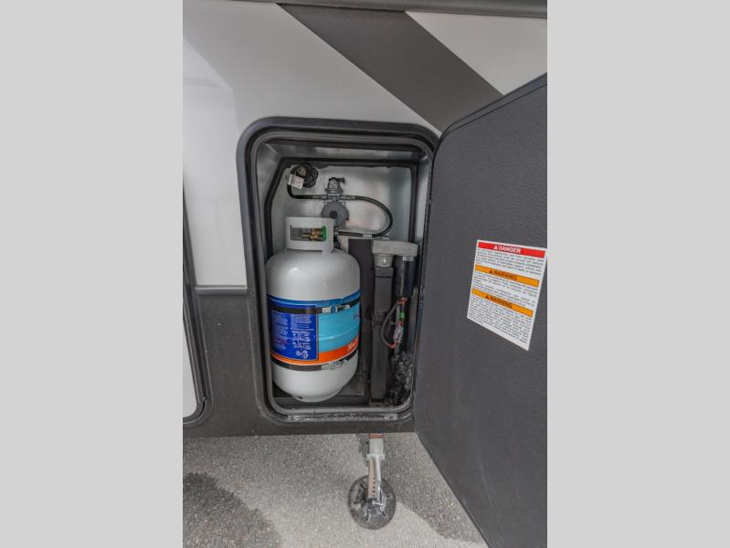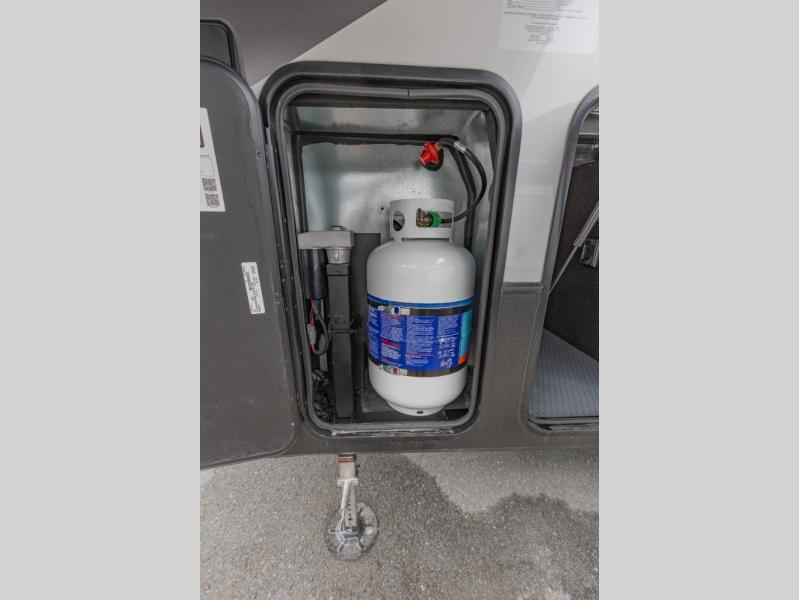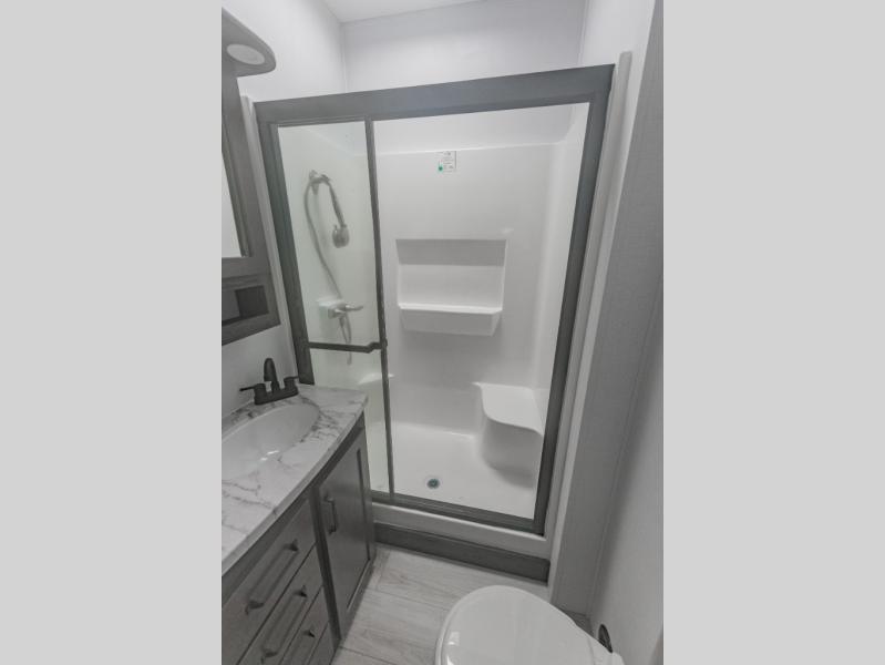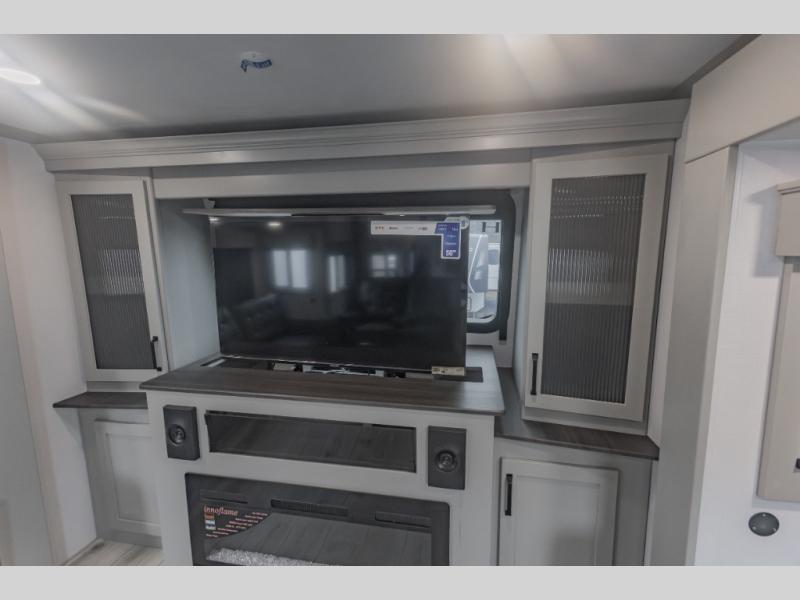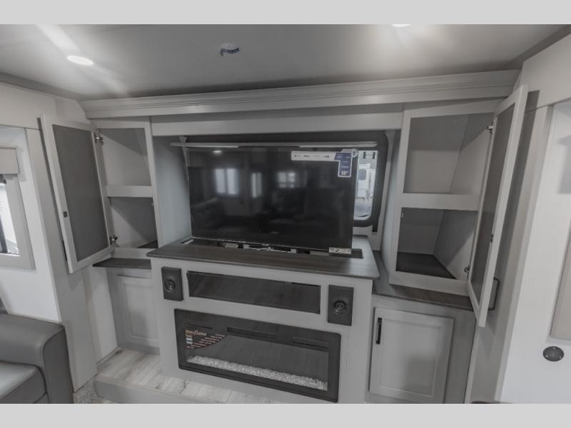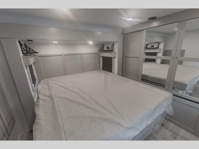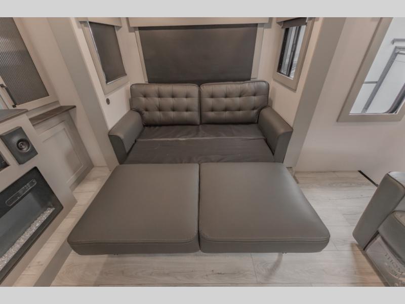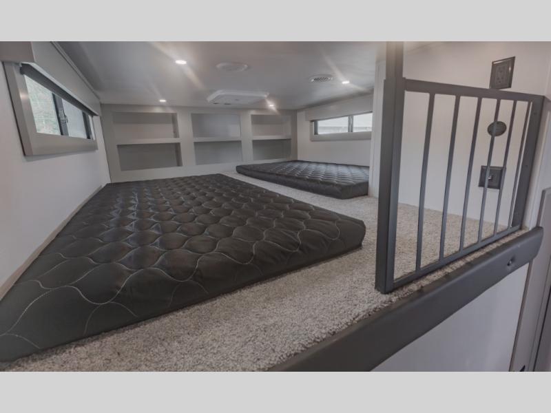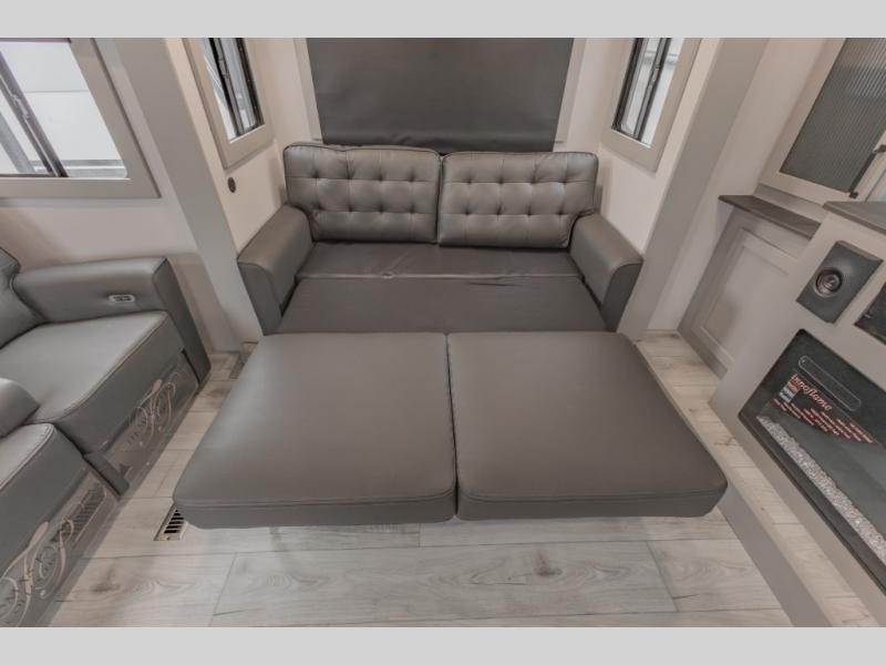 Include all of your favorite people on your next adventure in this Montana High Country fifth wheel! Not only is there a rear private bedroom with a king-size bed for you, but there is also a loft above with stairs that take you to the bunk mats. Now your kids will have their own space too. You can even host a few other travelers up front in the separate living room on the two hide-a-bed sofas. This area will be perfect for cozy sleeping because of the fireplace, and you can even watch a movie as you drift off to sleep because of the 50" LCD TV too. The full bathroom has a pivot-hinge door and a 48" x 30" shower with seat, and the kitchen has a breakfast bar that you can sit at to eat your cereal each morning
