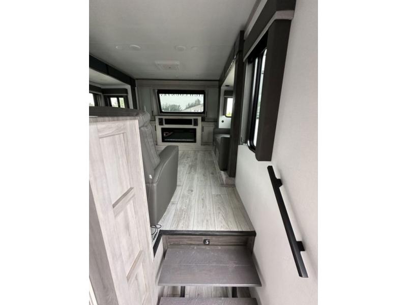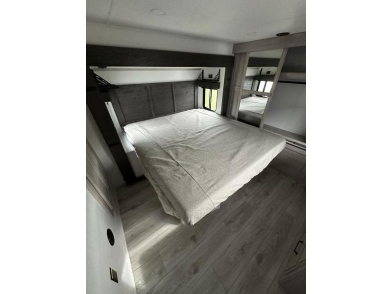 Include all of your favorite people on your next adventure in this Montana High Country fifth wheel! Not only is there a rear private bedroom with a king-size bed for you, but there is also a loft above with stairs that take you to the bunk mats. Now your kids will have their own space too. You can even host a few other travelers up front in the separate living room on the two hide-a-bed sofas. This area will be perfect for cozy sleeping because of the fireplace, and you can even watch a movie as you drift off to sleep because of the 50" LCD TV too. The full bathroom has a pivot-hinge door and a 48" x 30" shower with seat, and the kitchen has a breakfast bar that you can sit at to eat your cereal each morning