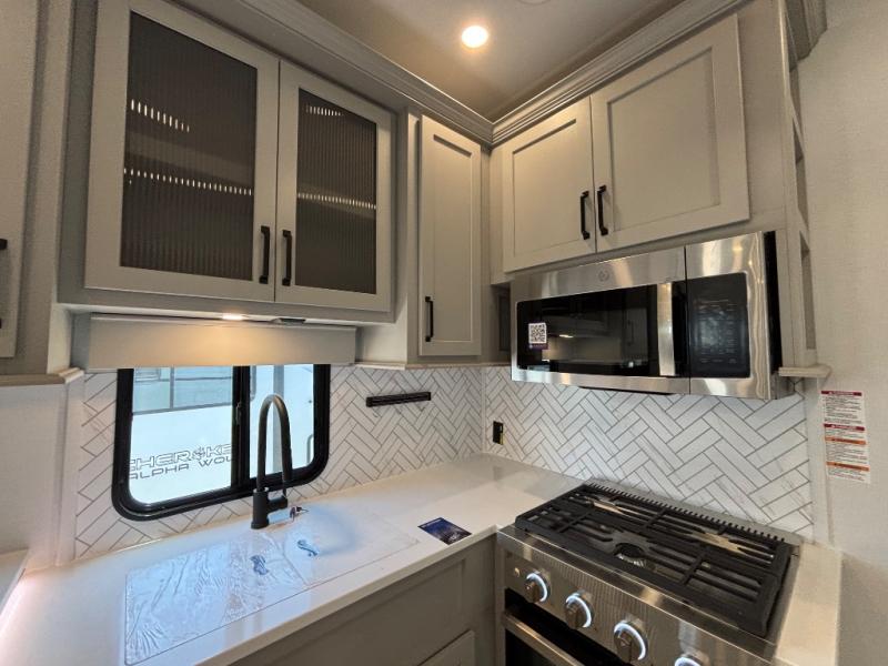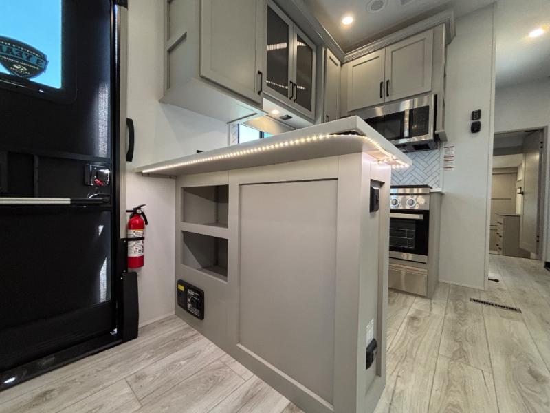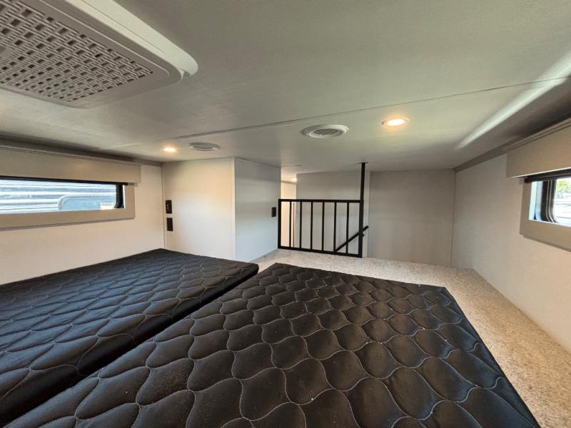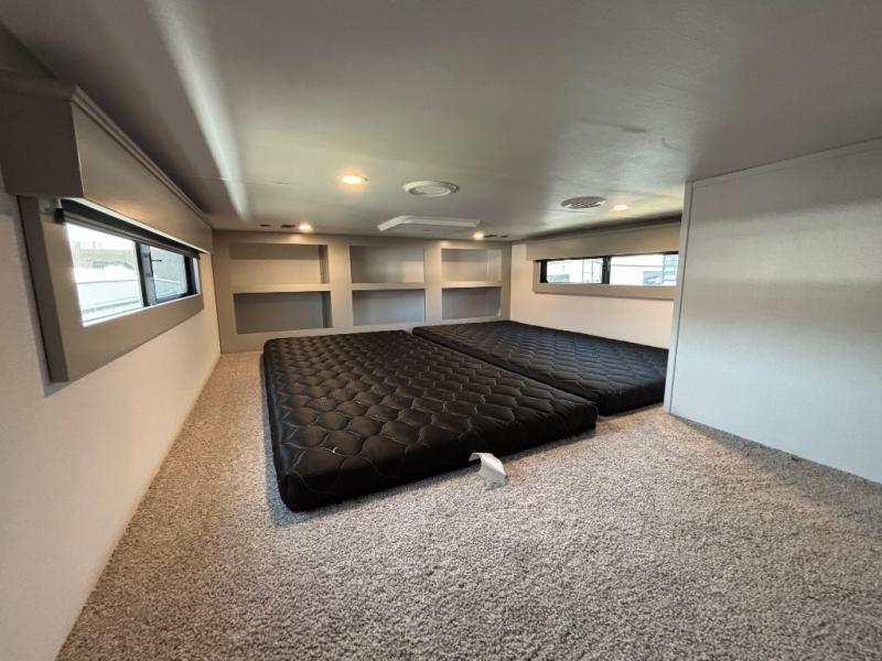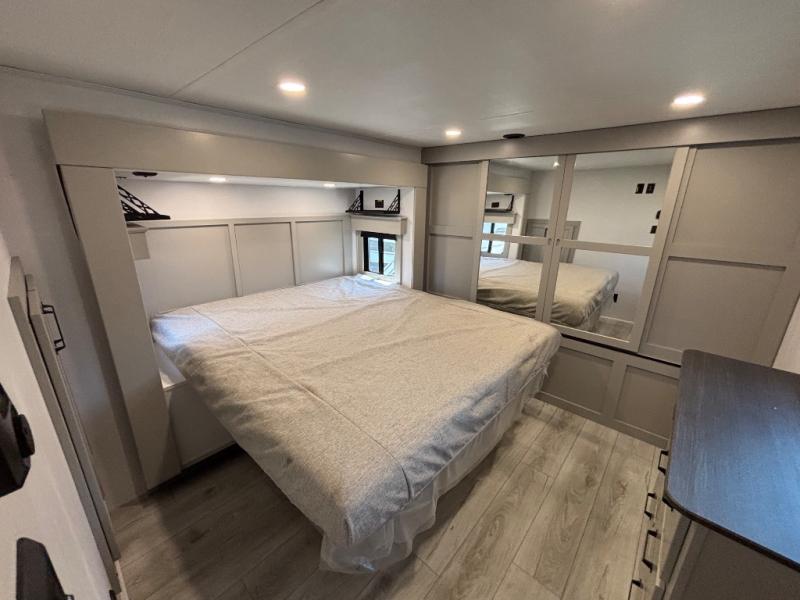 Include all of your favorite people on your next adventure in this Montana High Country fifth wheel! Not only is there a rear private bedroom with a king-size bed for you, but there is also a loft above with stairs that take you to the bunk mats. Now your kids will have their own space too. You can even host a few other travelers up front in the separate living room on the two hide-a-bed sofas. This area will be perfect for cozy sleeping because of the fireplace, and you can even watch a movie as you drift off to sleep because of the 50" LCD TV too. The full bathroom has a pivot-hinge door and a 48" x 30" shower with seat, and the kitchen has a breakfast bar that you can sit at to eat your cereal each morning