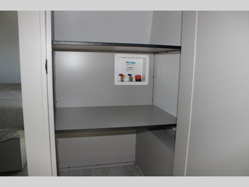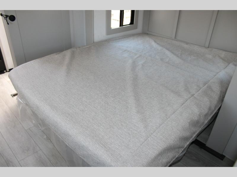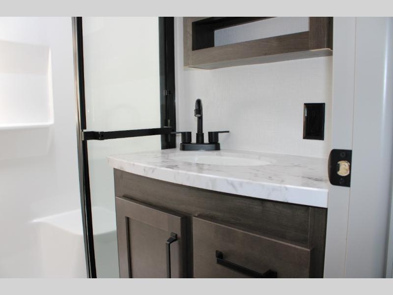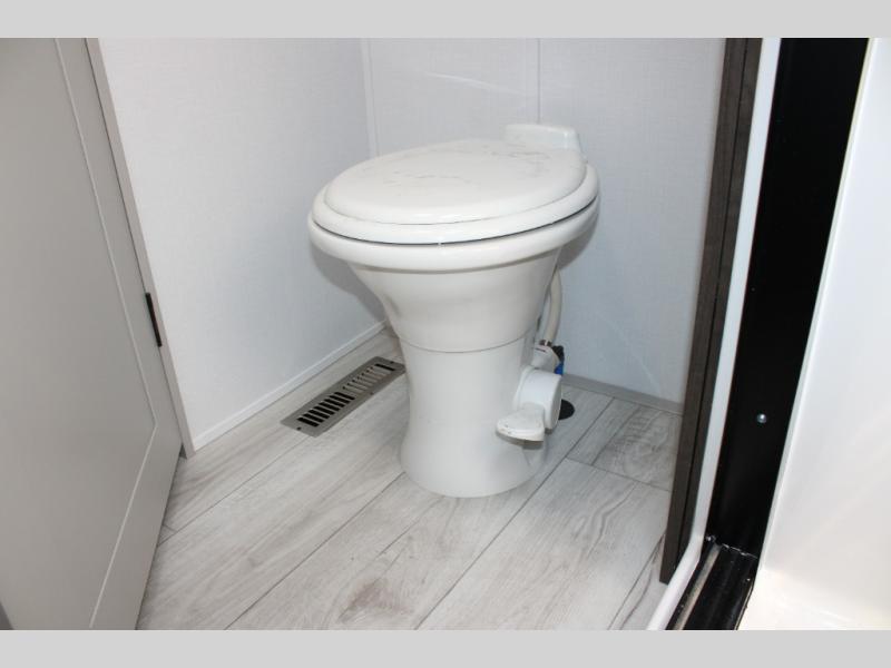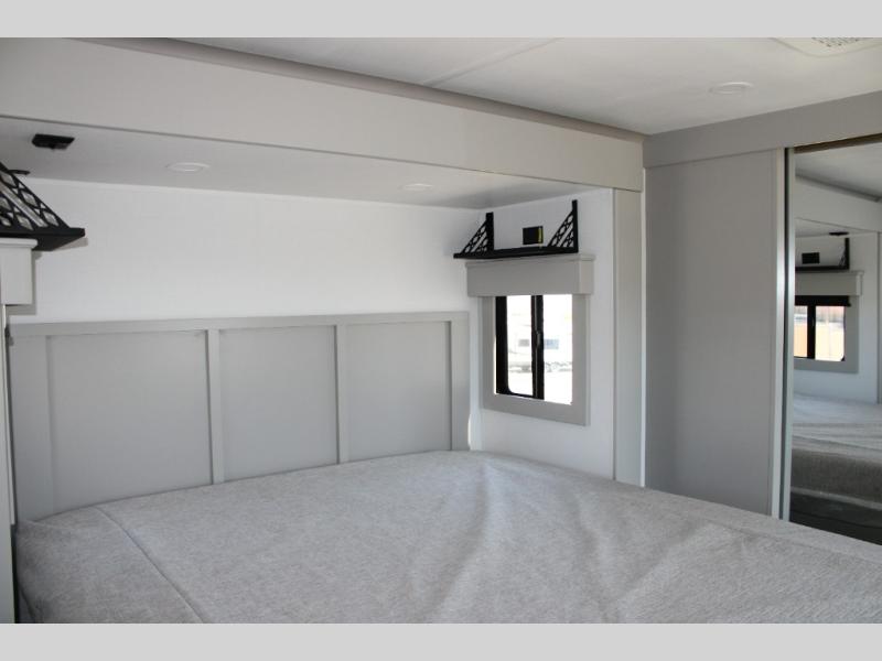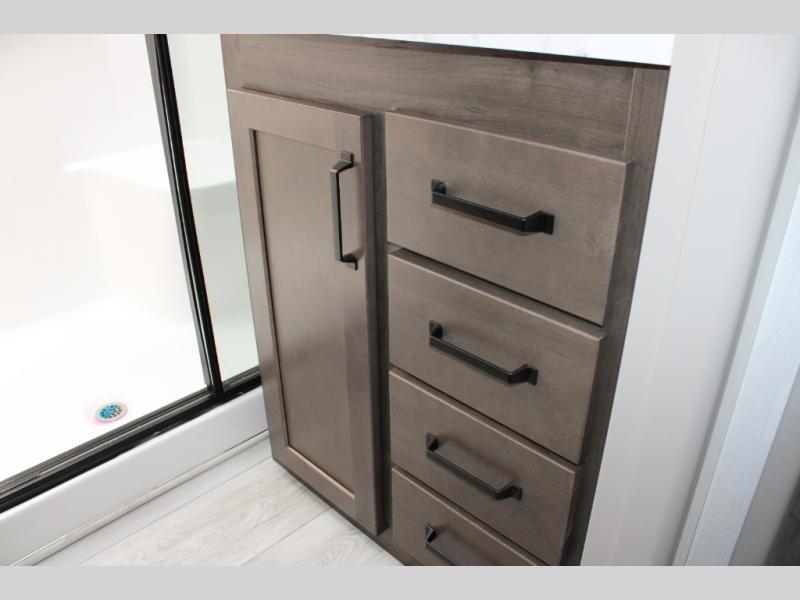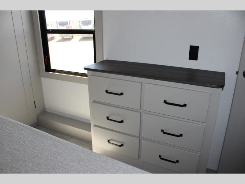 - Rear Master Suite with Private Full Bath: This unique rear bedroom includes a queen bed with two large closets, a dresser, and underbed storage. The attached full bathroom has its own exterior entry, allowing for easy access without tracking through the entire RV.
