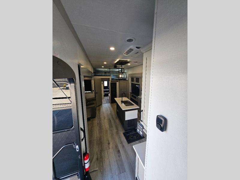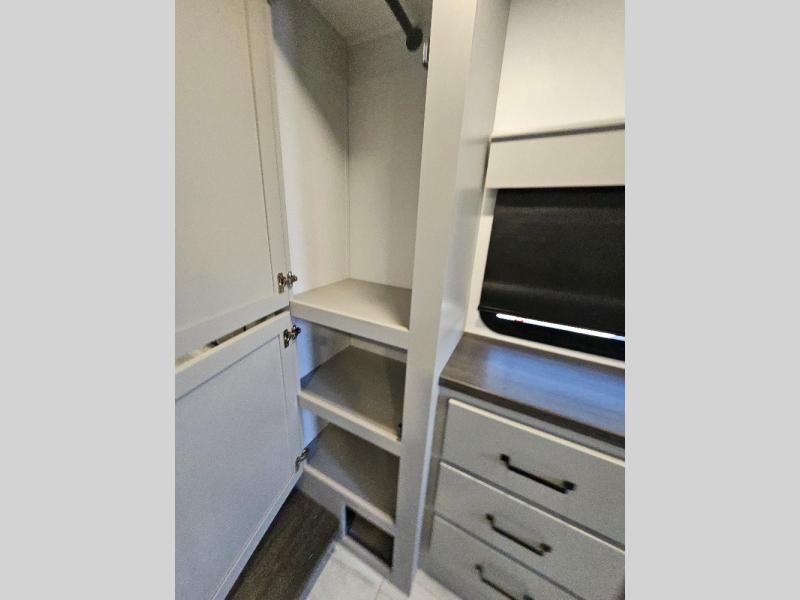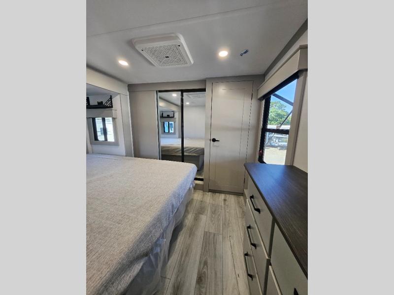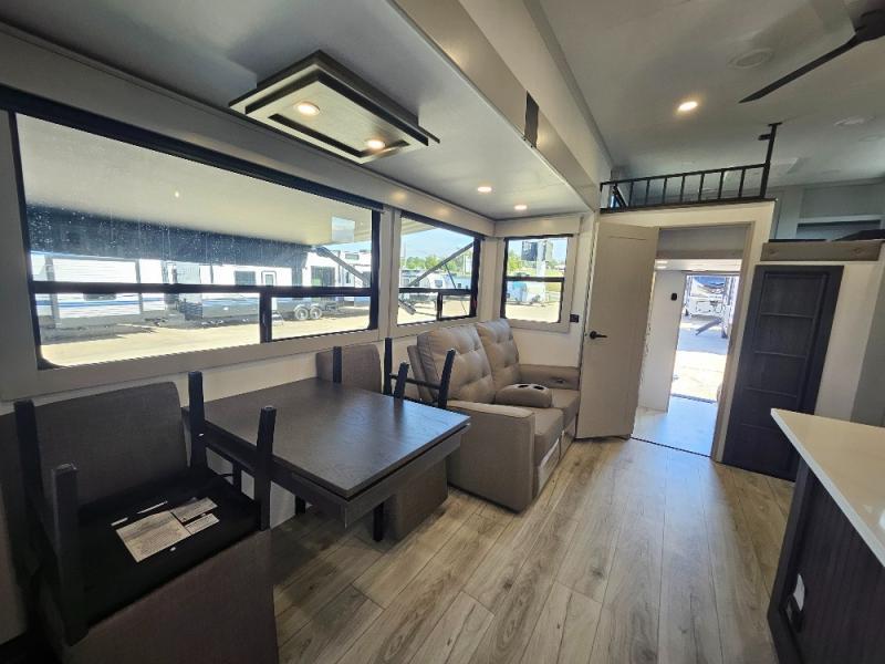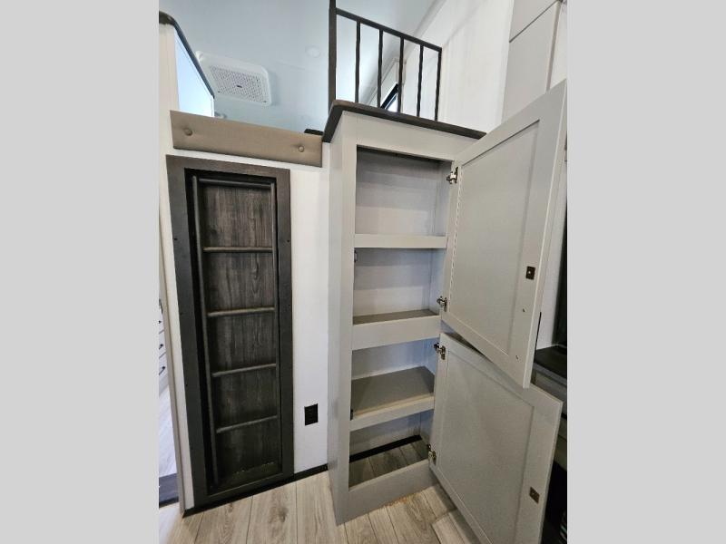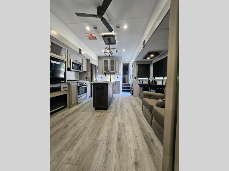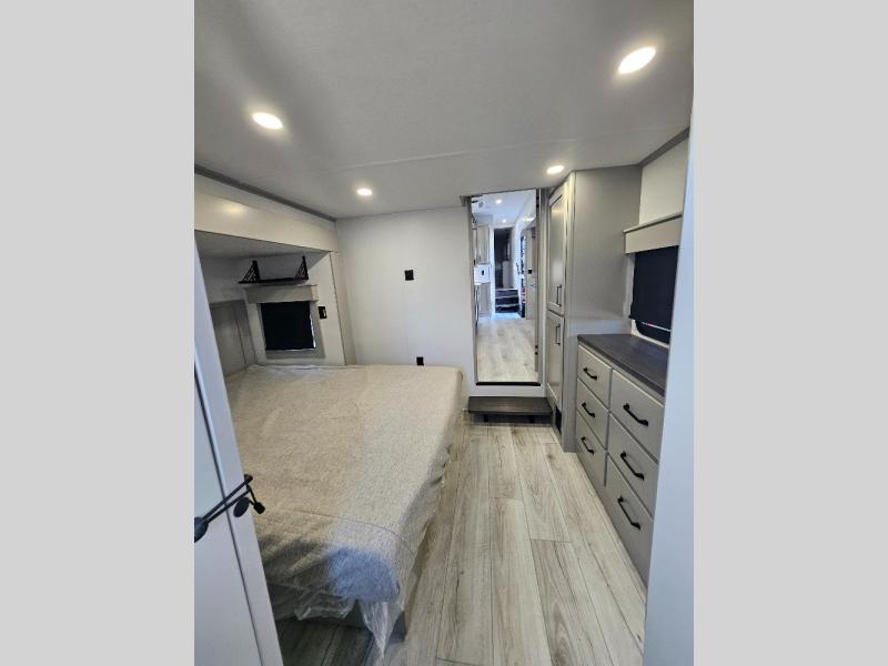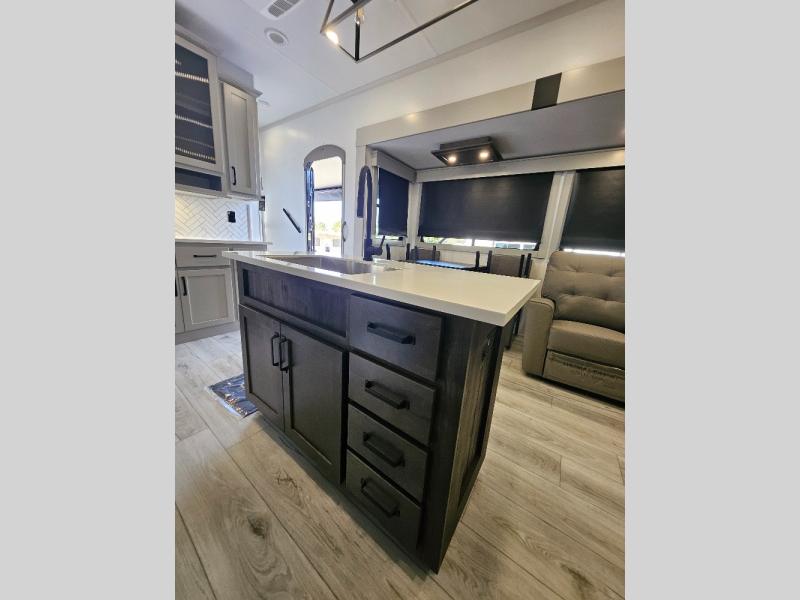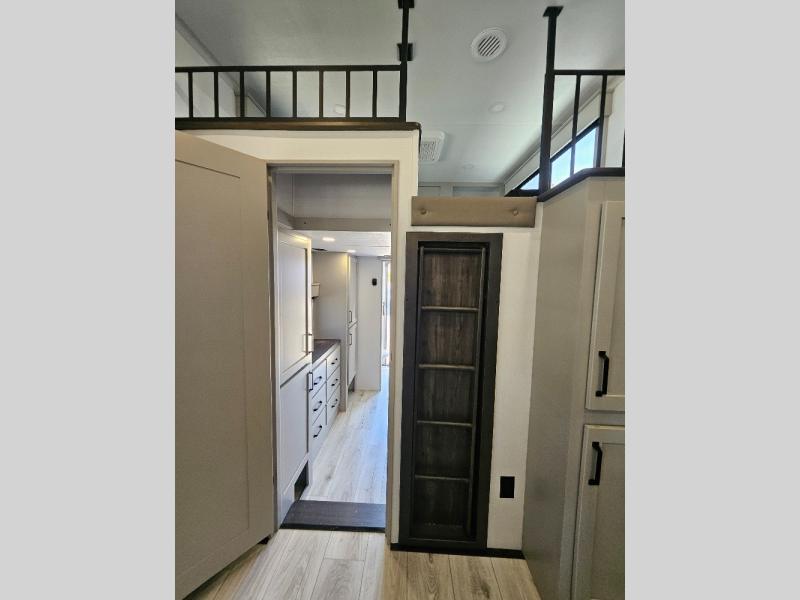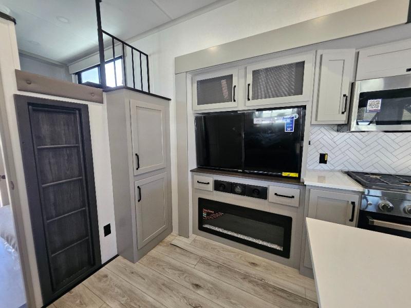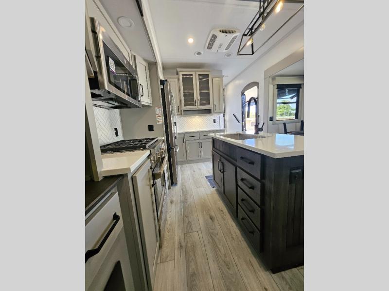 Two full bathrooms and two private bedrooms make this fifth wheel perfect for camping with friends and family. The front bedroom includes a king bed with a queen bed option, a large front wardrobe, plus stackable washer and dryer prep. The rear master bedroom has two closets plus a dresser and underbed storage, plus its own full bath with an exterior entry door for convenience. There is even a loft above the rear bedroom for even more sleeping space! Everyone can meet in the main living area/kitchen to relax on the power theater seat as the chef cooks dinner, and you can watch a show on the Smart HDTV to pass the time. The kitchen island will provide more counter space, along with the hutch that includes overhead cabinets as well. Don't let this luxury fifth wheel slip away!