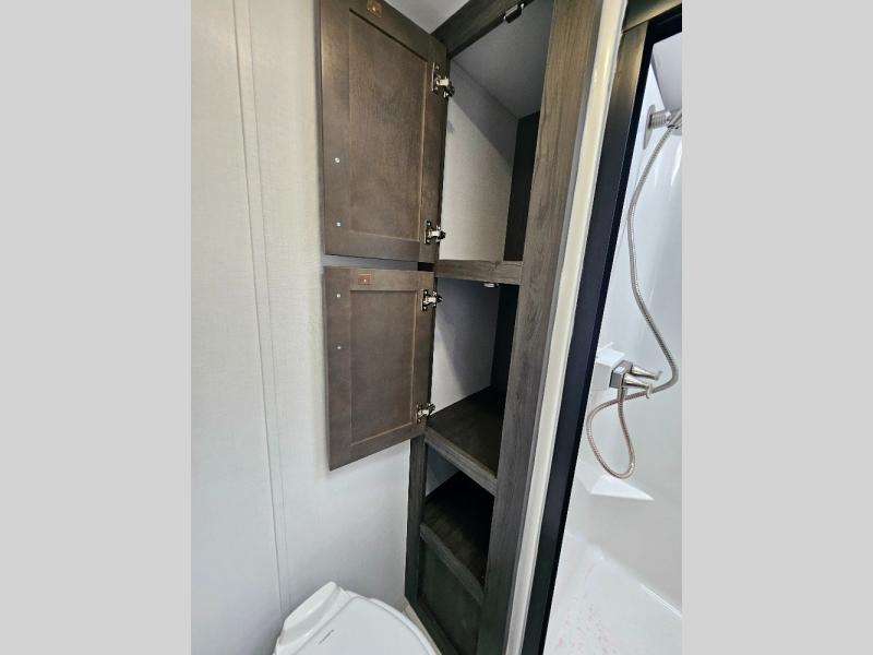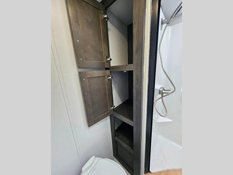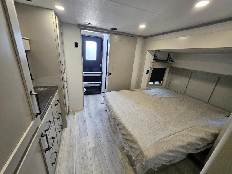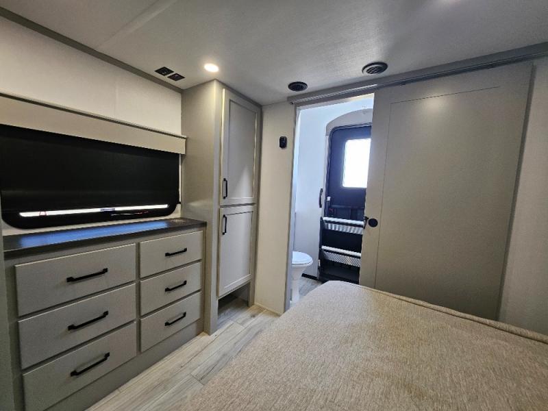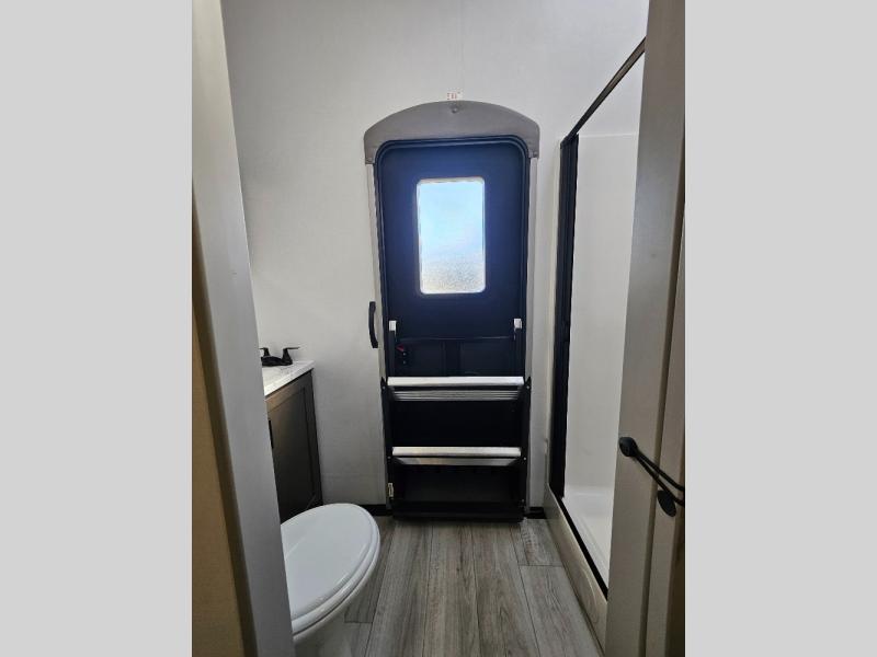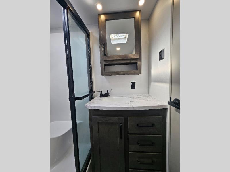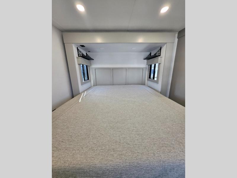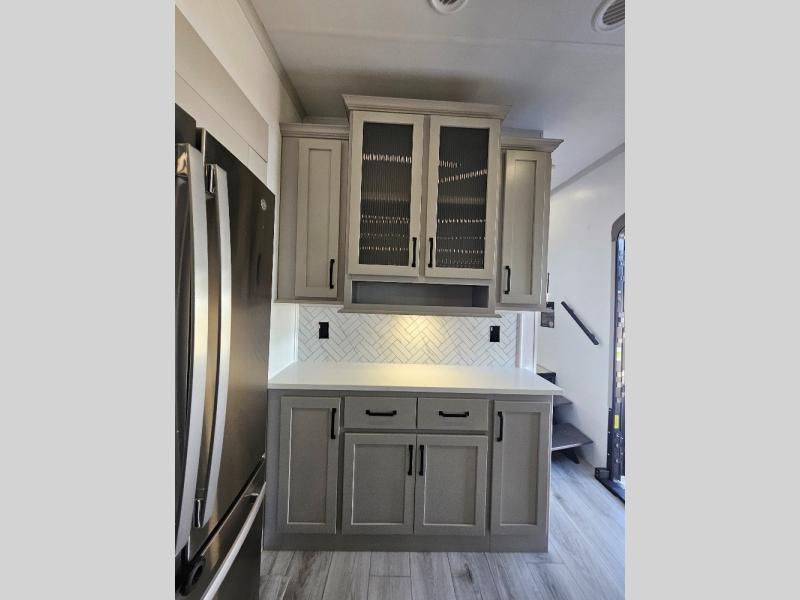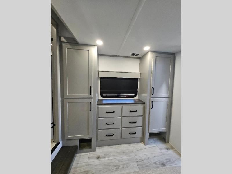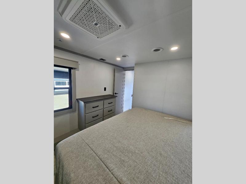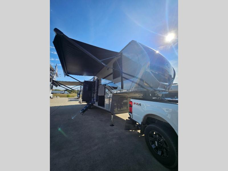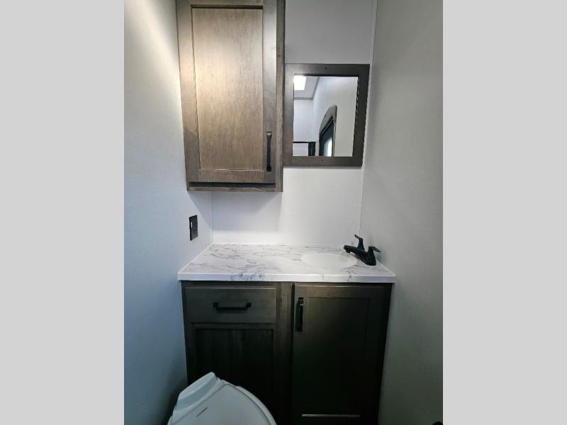 Two full bathrooms and two private bedrooms make this fifth wheel perfect for camping with friends and family. The front bedroom includes a king bed with a queen bed option, a large front wardrobe, plus stackable washer and dryer prep. The rear master bedroom has two closets plus a dresser and underbed storage, plus its own full bath with an exterior entry door for convenience. There is even a loft above the rear bedroom for even more sleeping space! Everyone can meet in the main living area/kitchen to relax on the power theater seat as the chef cooks dinner, and you can watch a show on the Smart HDTV to pass the time. The kitchen island will provide more counter space, along with the hutch that includes overhead cabinets as well. Don't let this luxury fifth wheel slip away!