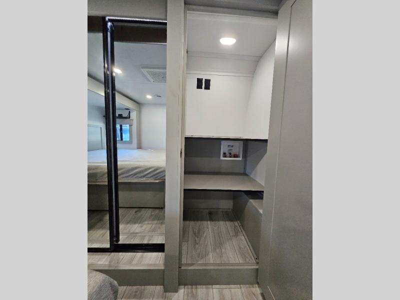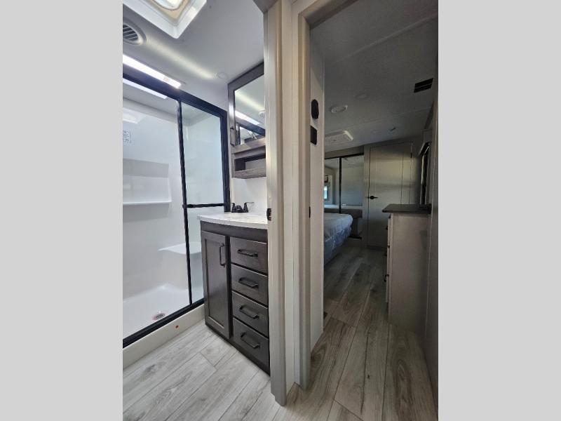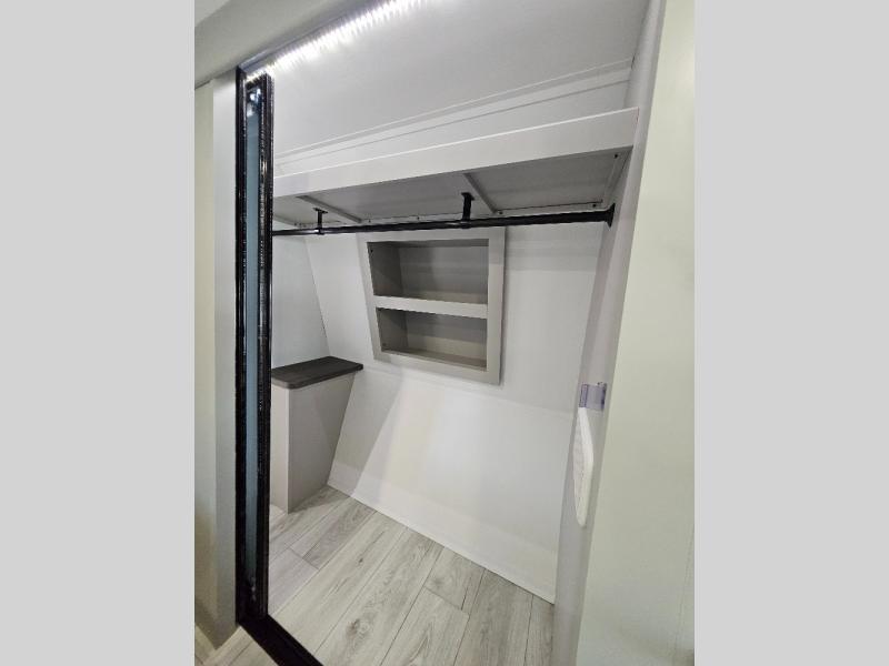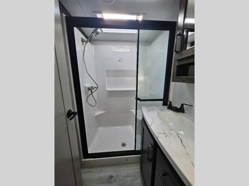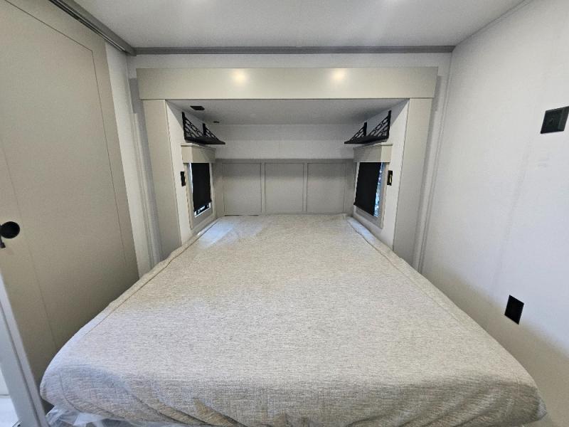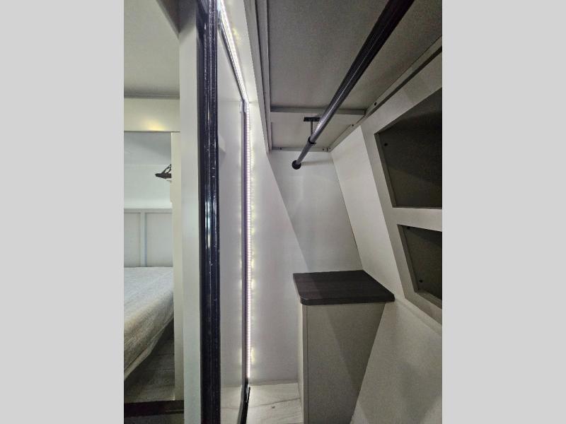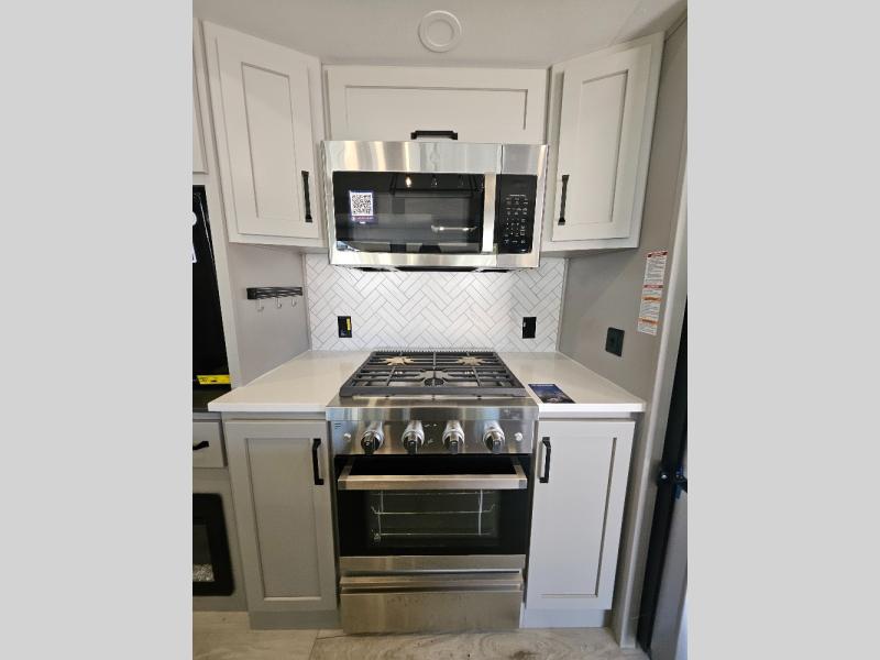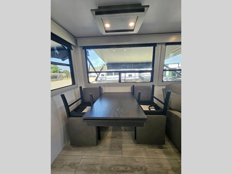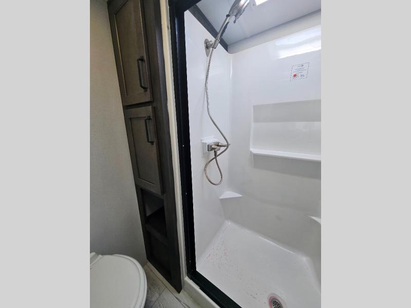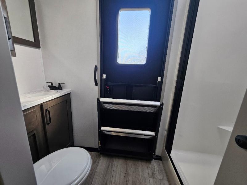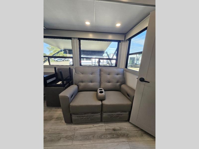 Two full bathrooms and two private bedrooms make this fifth wheel perfect for camping with friends and family. The front bedroom includes a king bed with a queen bed option, a large front wardrobe, plus stackable washer and dryer prep. The rear master bedroom has two closets plus a dresser and underbed storage, plus its own full bath with an exterior entry door for convenience. There is even a loft above the rear bedroom for even more sleeping space! Everyone can meet in the main living area/kitchen to relax on the power theater seat as the chef cooks dinner, and you can watch a show on the Smart HDTV to pass the time. The kitchen island will provide more counter space, along with the hutch that includes overhead cabinets as well. Don't let this luxury fifth wheel slip away!