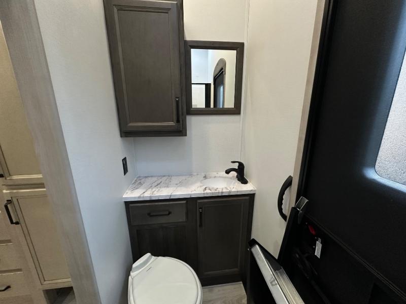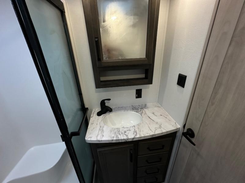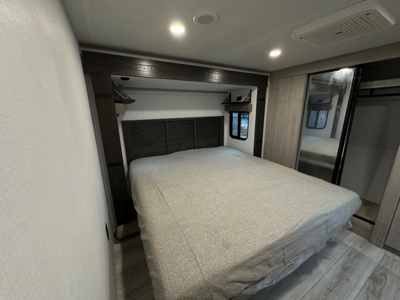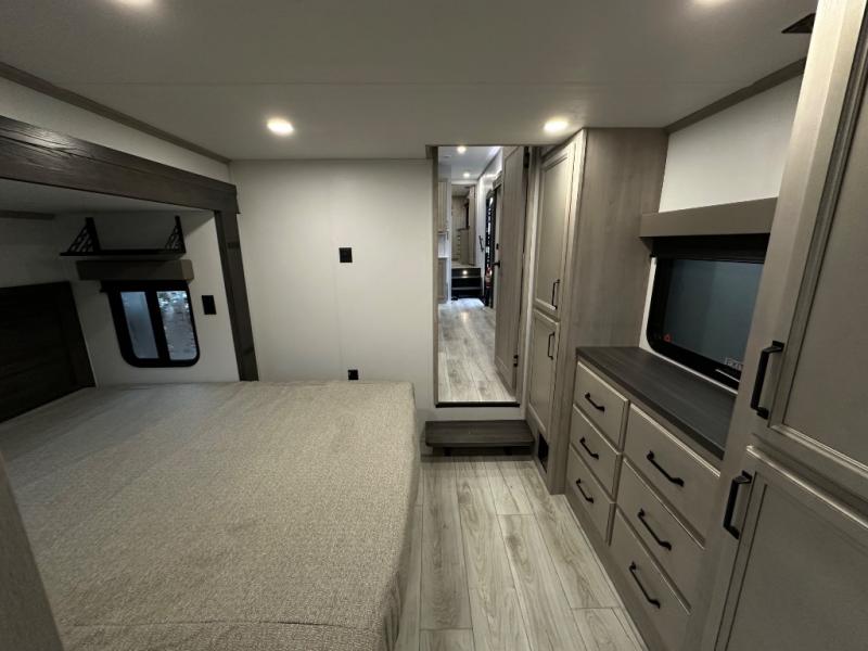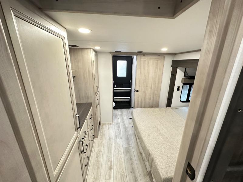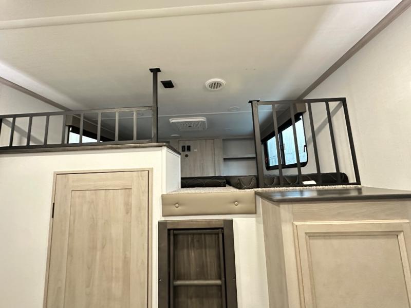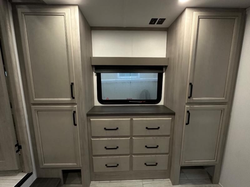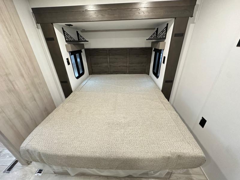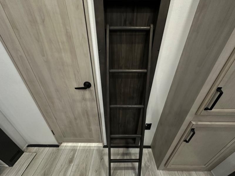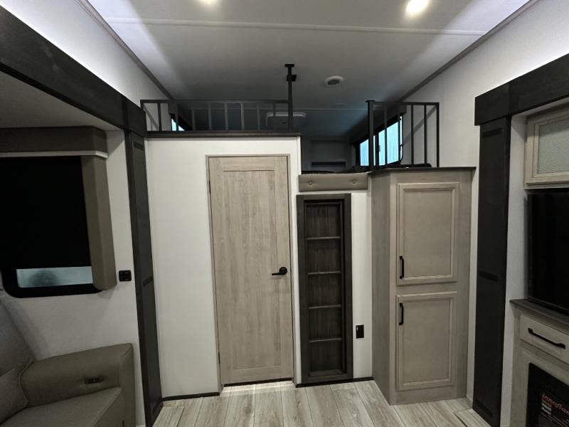 Two full bathrooms and two private bedrooms make this fifth wheel perfect for camping with friends and family. The front bedroom includes a king bed with a queen bed option, a large front wardrobe, plus stackable washer and dryer prep. The rear master bedroom has two closets plus a dresser and underbed storage, plus its own full bath with an exterior entry door for convenience. There is even a loft above the rear bedroom for even more sleeping space! Everyone can meet in the main living area/kitchen to relax on the power theater seat as the chef cooks dinner, and you can watch a show on the Smart HDTV to pass the time. The kitchen island will provide more counter space, along with the hutch that includes overhead cabinets as well. Don't let this luxury fifth wheel slip away!