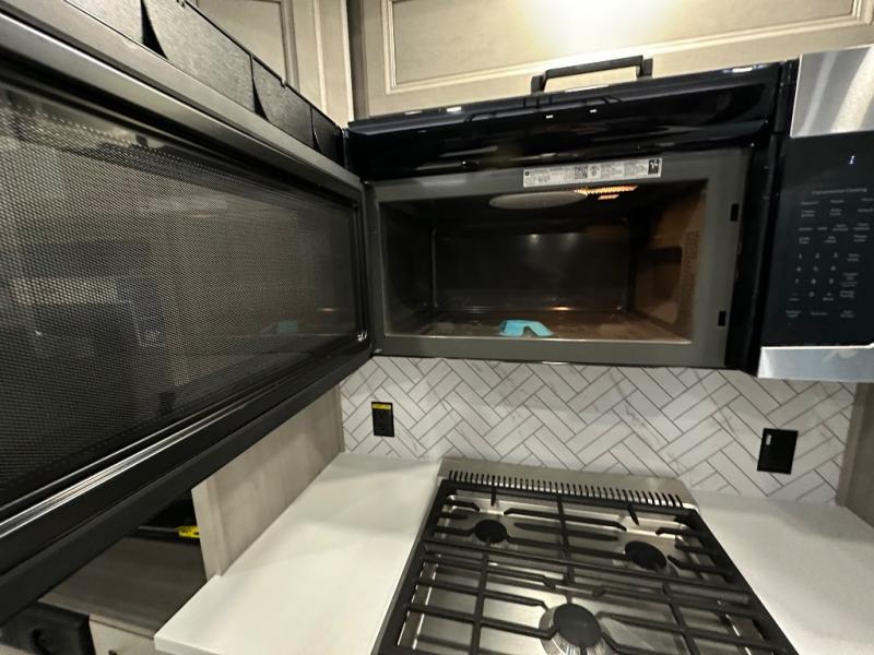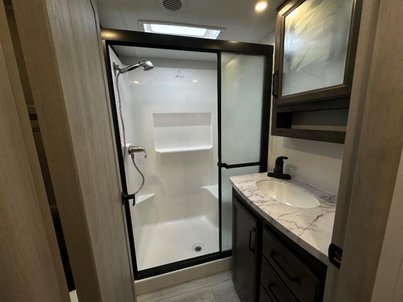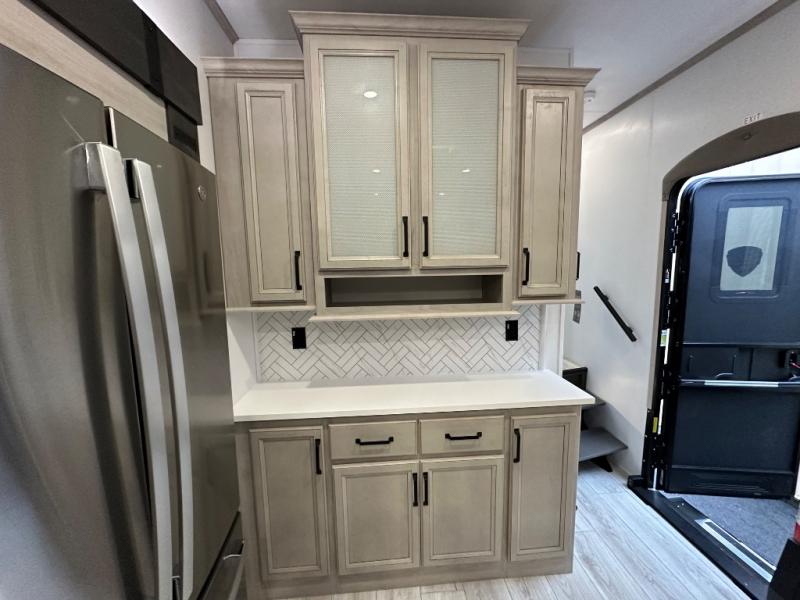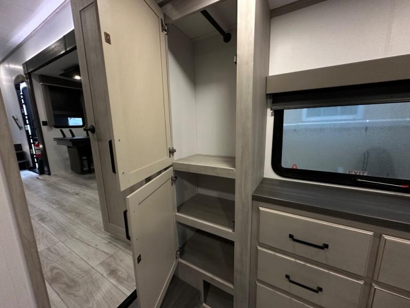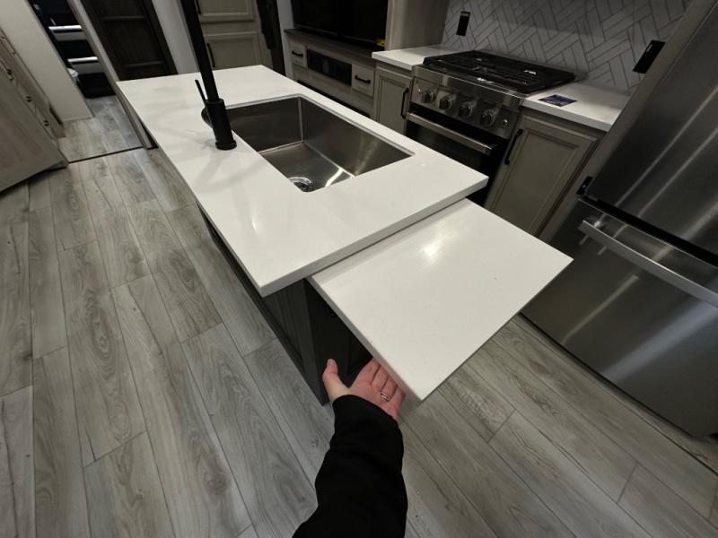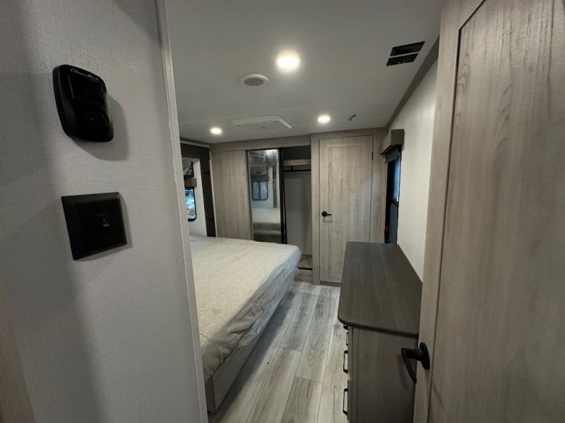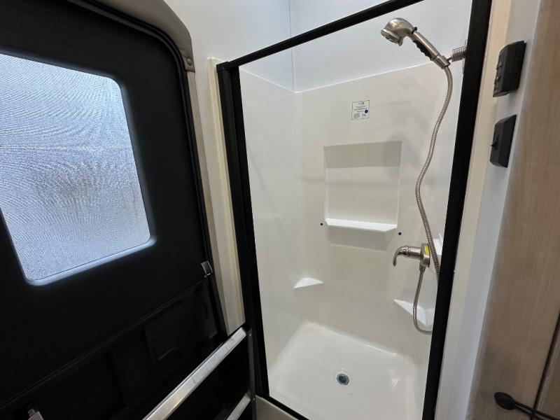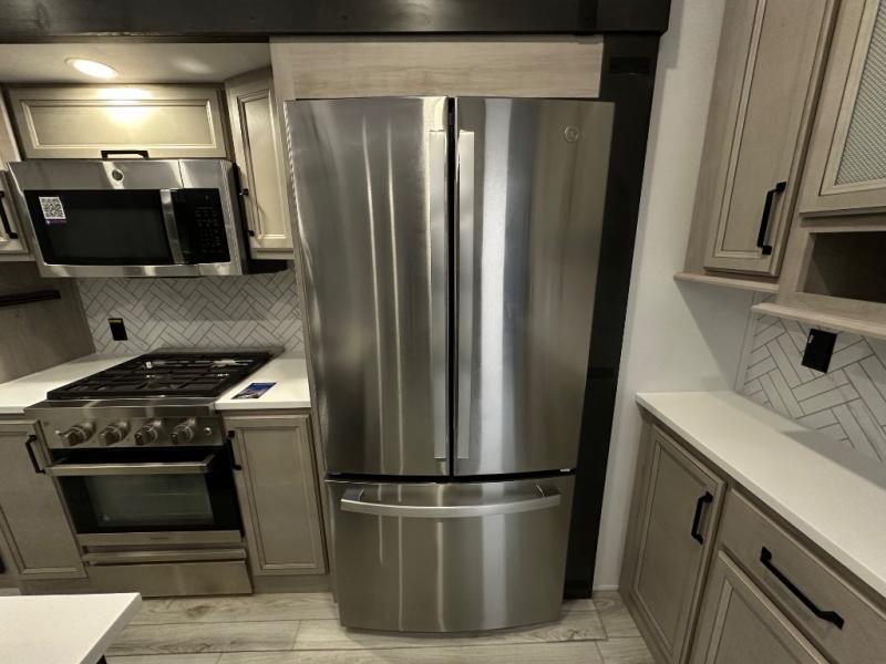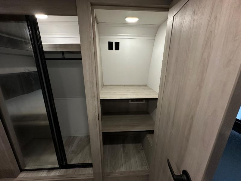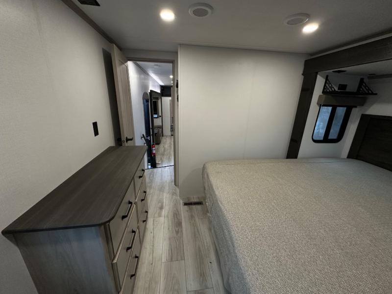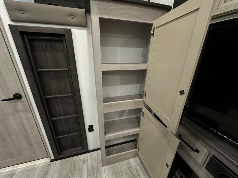 Two full bathrooms and two private bedrooms make this fifth wheel perfect for camping with friends and family. The front bedroom includes a king bed with a queen bed option, a large front wardrobe, plus stackable washer and dryer prep. The rear master bedroom has two closets plus a dresser and underbed storage, plus its own full bath with an exterior entry door for convenience. There is even a loft above the rear bedroom for even more sleeping space! Everyone can meet in the main living area/kitchen to relax on the power theater seat as the chef cooks dinner, and you can watch a show on the Smart HDTV to pass the time. The kitchen island will provide more counter space, along with the hutch that includes overhead cabinets as well. Don't let this luxury fifth wheel slip away!