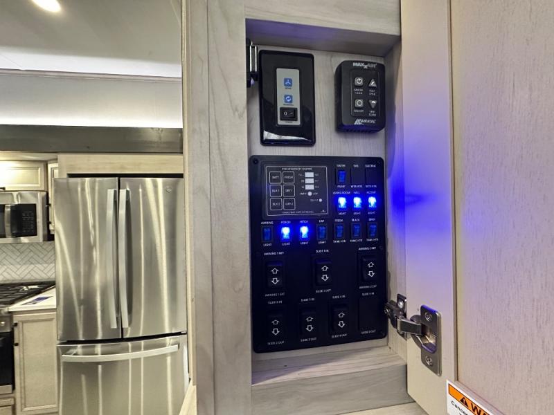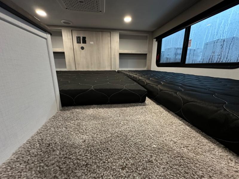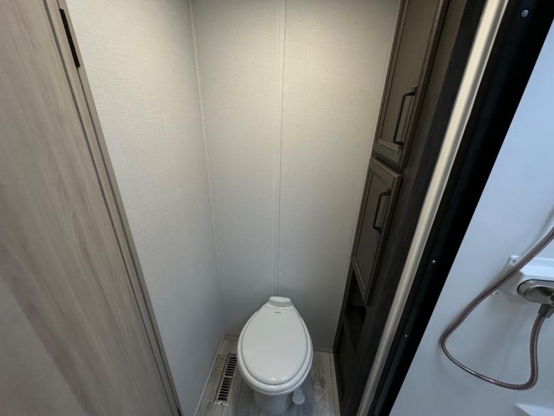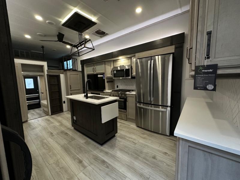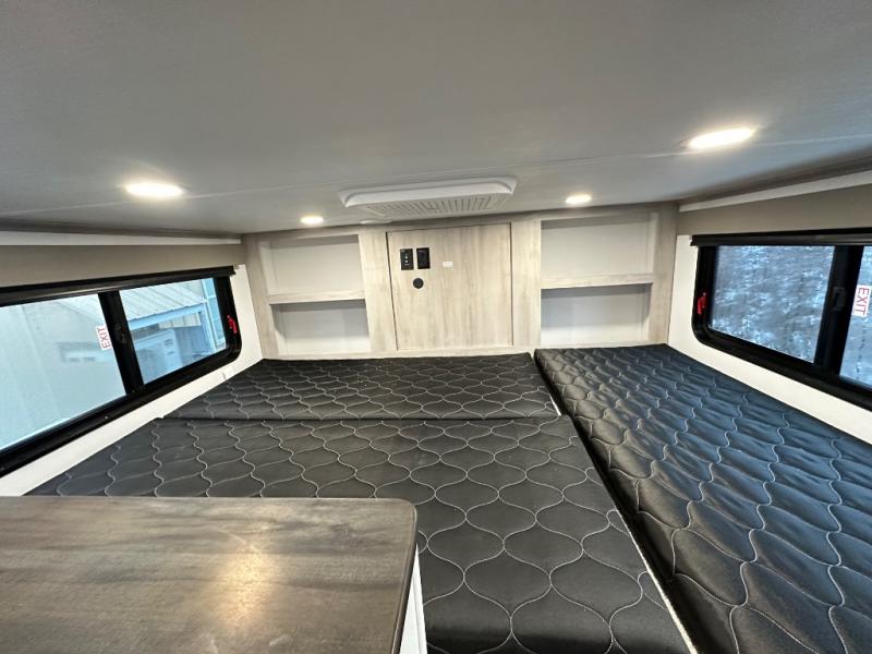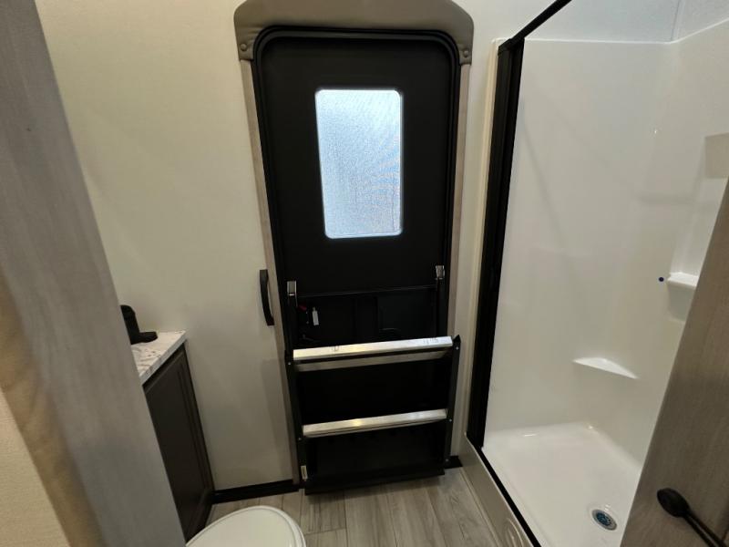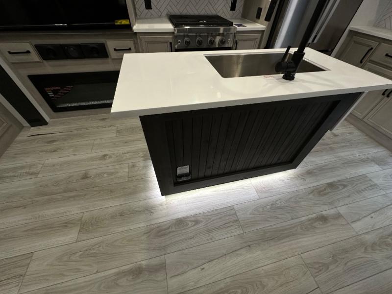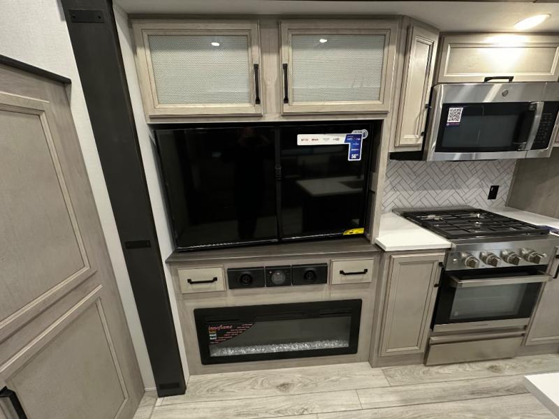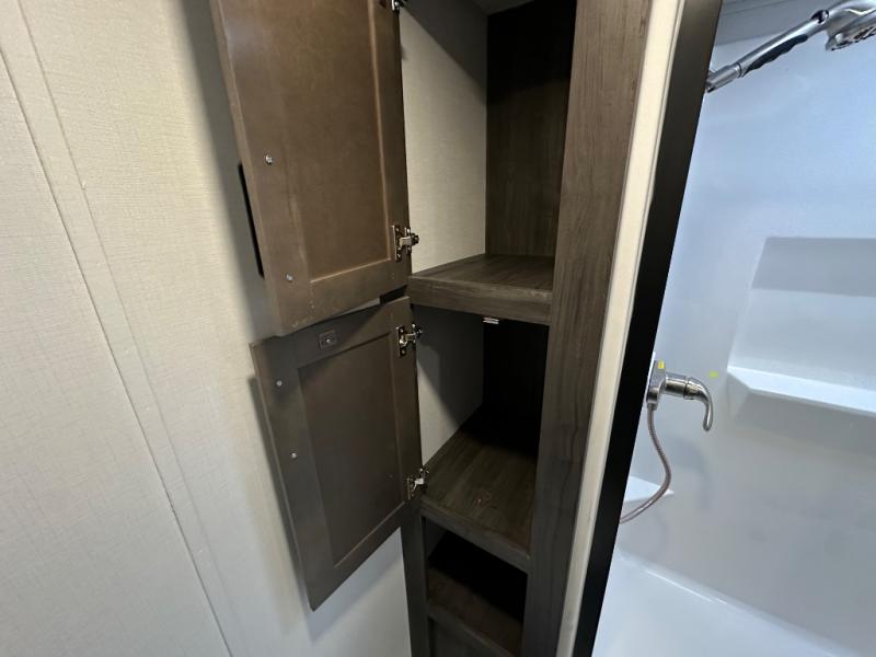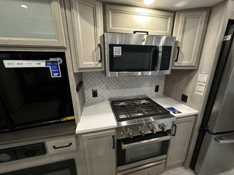 Two full bathrooms and two private bedrooms make this fifth wheel perfect for camping with friends and family. The front bedroom includes a king bed with a queen bed option, a large front wardrobe, plus stackable washer and dryer prep. The rear master bedroom has two closets plus a dresser and underbed storage, plus its own full bath with an exterior entry door for convenience. There is even a loft above the rear bedroom for even more sleeping space! Everyone can meet in the main living area/kitchen to relax on the power theater seat as the chef cooks dinner, and you can watch a show on the Smart HDTV to pass the time. The kitchen island will provide more counter space, along with the hutch that includes overhead cabinets as well. Don't let this luxury fifth wheel slip away!