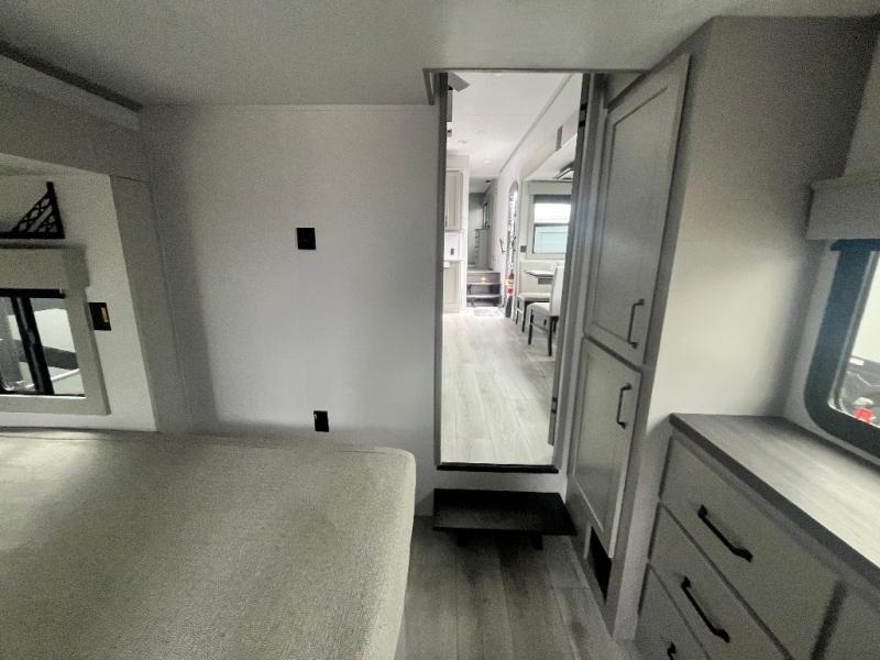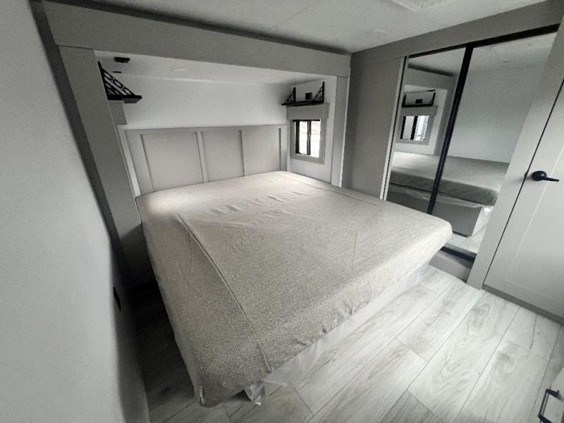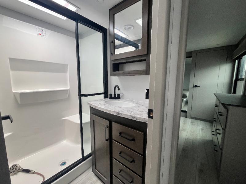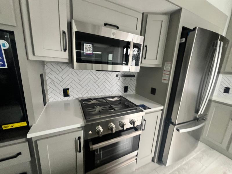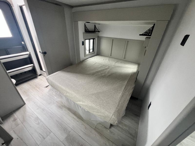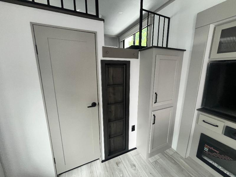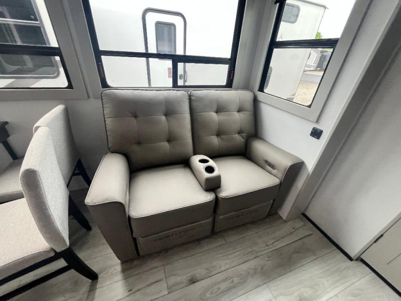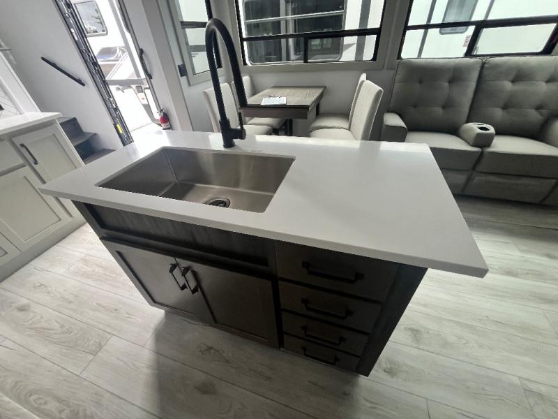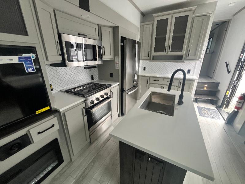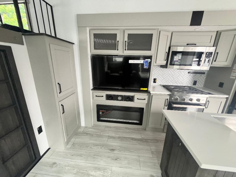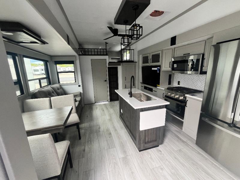 Two full bathrooms and two private bedrooms make this fifth wheel perfect for camping with friends and family. The front bedroom includes a king bed with a queen bed option, a large front wardrobe, plus stackable washer and dryer prep. The rear master bedroom has two closets plus a dresser and underbed storage, plus its own full bath with an exterior entry door for convenience. There is even a loft above the rear bedroom for even more sleeping space! Everyone can meet in the main living area/kitchen to relax on the power theater seat as the chef cooks dinner, and you can watch a show on the Smart HDTV to pass the time. The kitchen island will provide more counter space, along with the hutch that includes overhead cabinets as well. Don't let this luxury fifth wheel slip away!