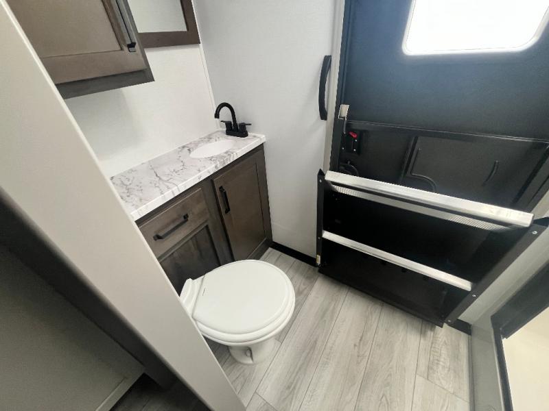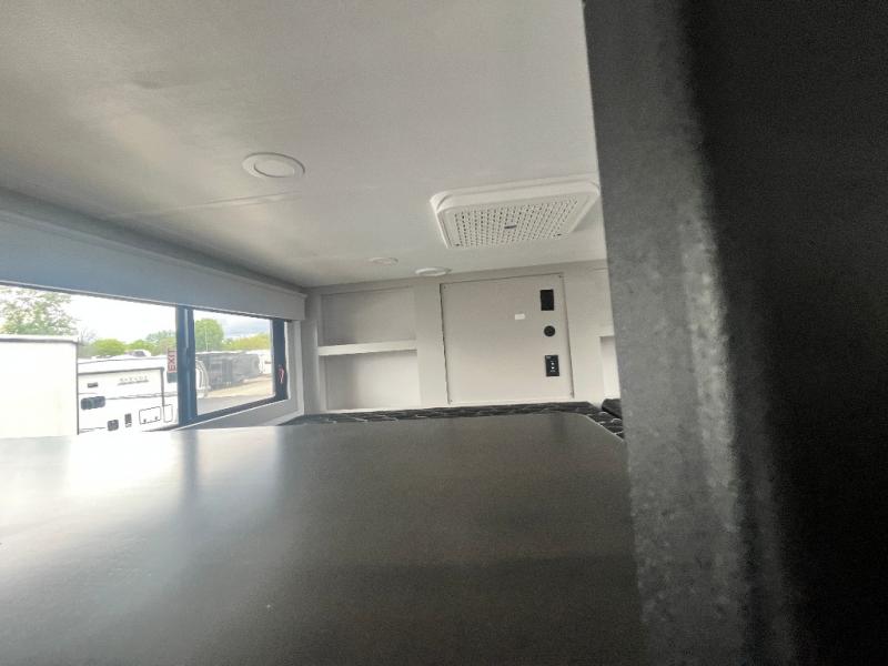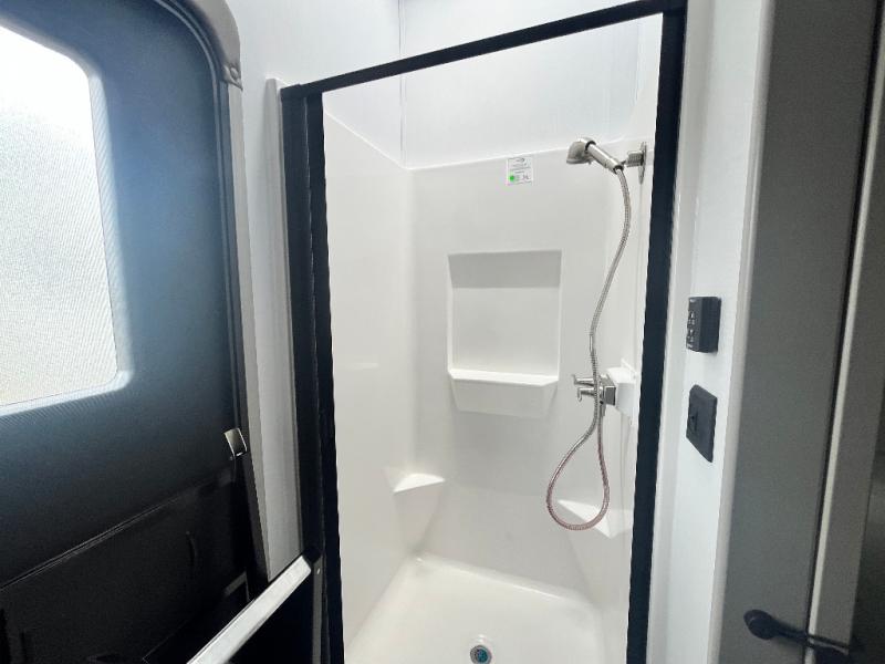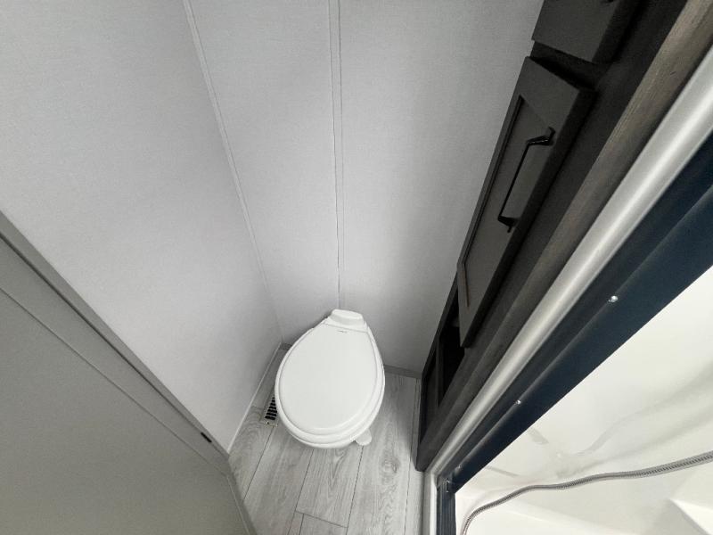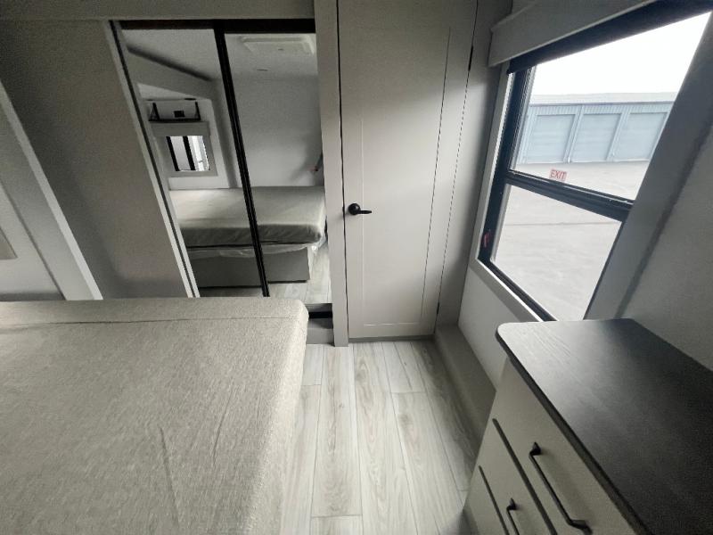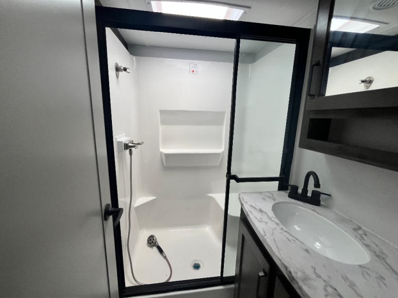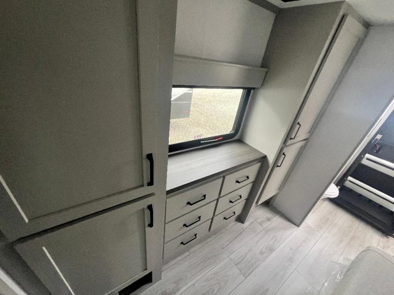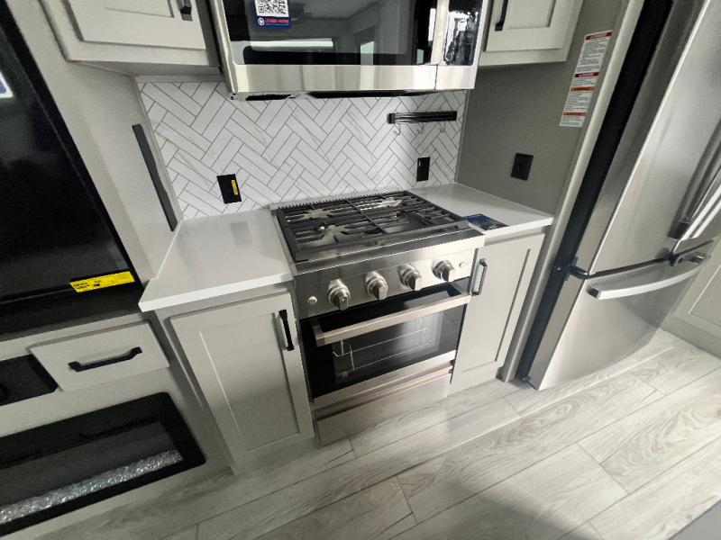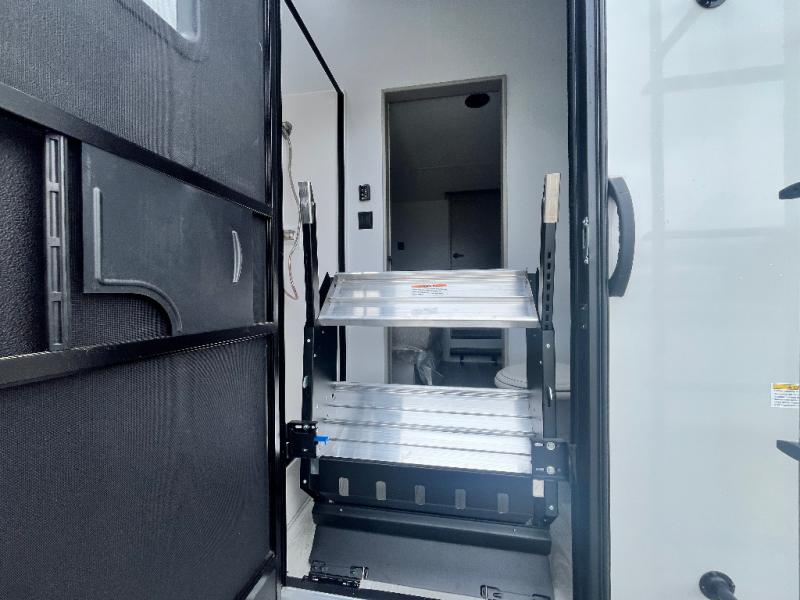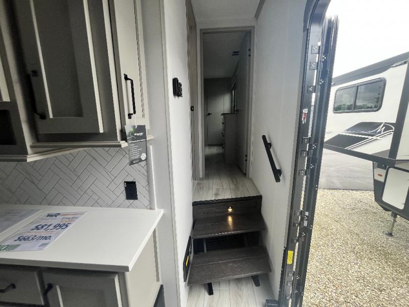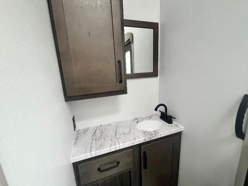 Two full bathrooms and two private bedrooms make this fifth wheel perfect for camping with friends and family. The front bedroom includes a king bed with a queen bed option, a large front wardrobe, plus stackable washer and dryer prep. The rear master bedroom has two closets plus a dresser and underbed storage, plus its own full bath with an exterior entry door for convenience. There is even a loft above the rear bedroom for even more sleeping space! Everyone can meet in the main living area/kitchen to relax on the power theater seat as the chef cooks dinner, and you can watch a show on the Smart HDTV to pass the time. The kitchen island will provide more counter space, along with the hutch that includes overhead cabinets as well. Don't let this luxury fifth wheel slip away!